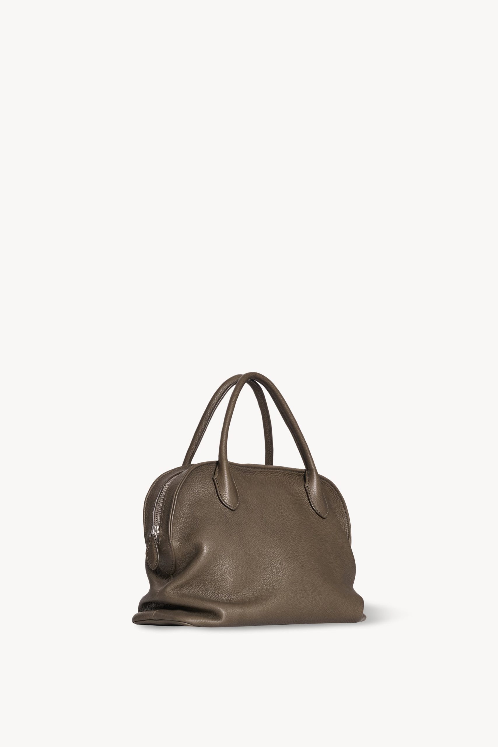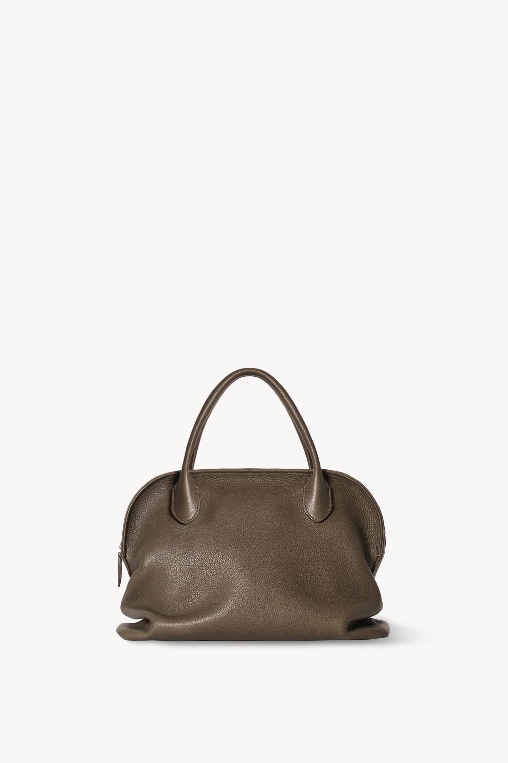 Softly structured top-handle bag in grained saddle leather with tubular handles. gusseted side folds. flat base. and curved top zipper closure. Embossed and unfinished. the natural grain surface is refined and consistent. giving the leather a soft hand and subtle texture that develops character over time.