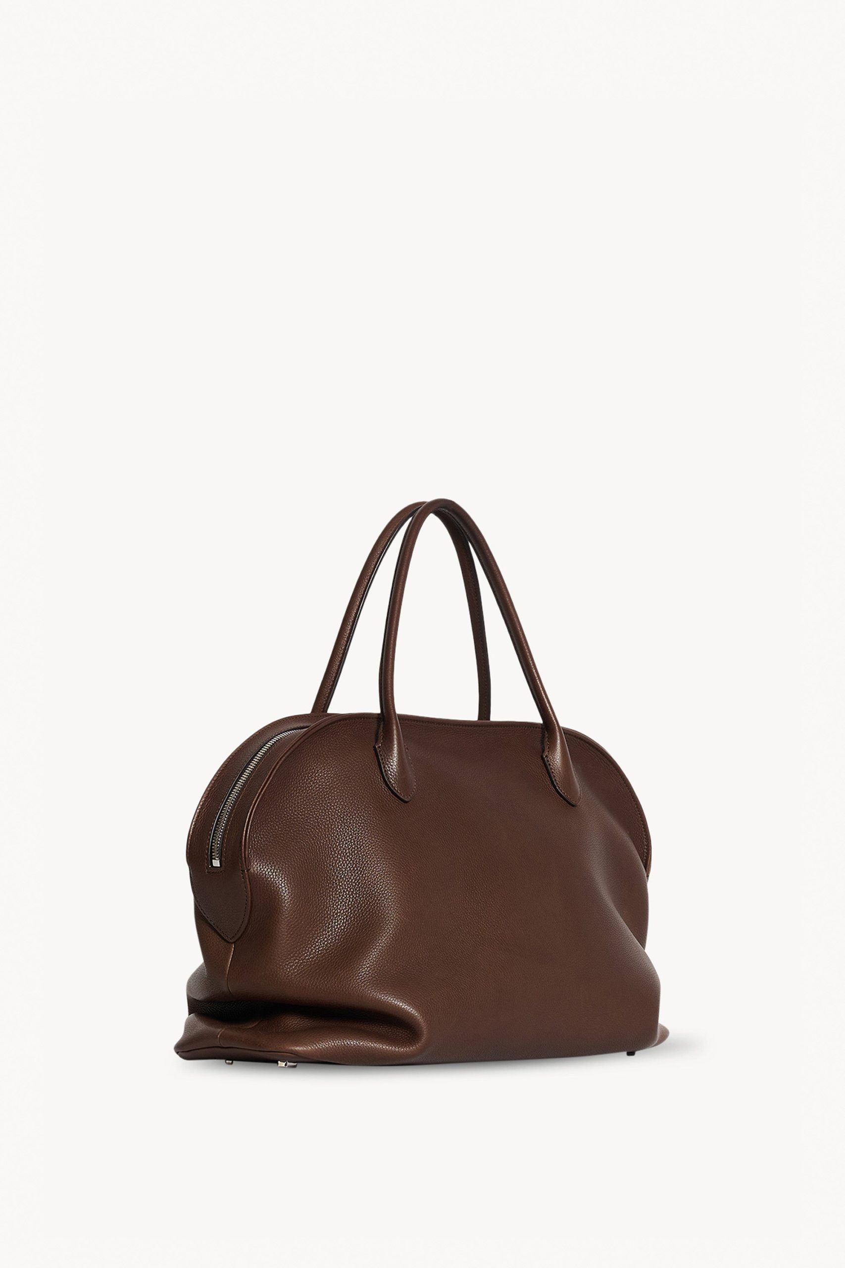 Softly structured top-handle bag in grained saddle leather with tubular handles. gusseted side folds. flat base. and curved top zipper closure. Embossed and unfinished. the natural grain surface is refined and consistent. giving the leather a soft hand and subtle texture that develops character over time.