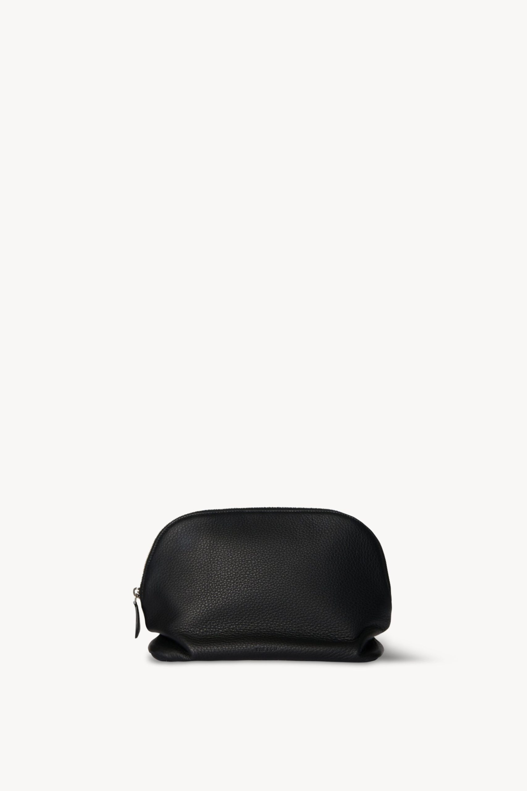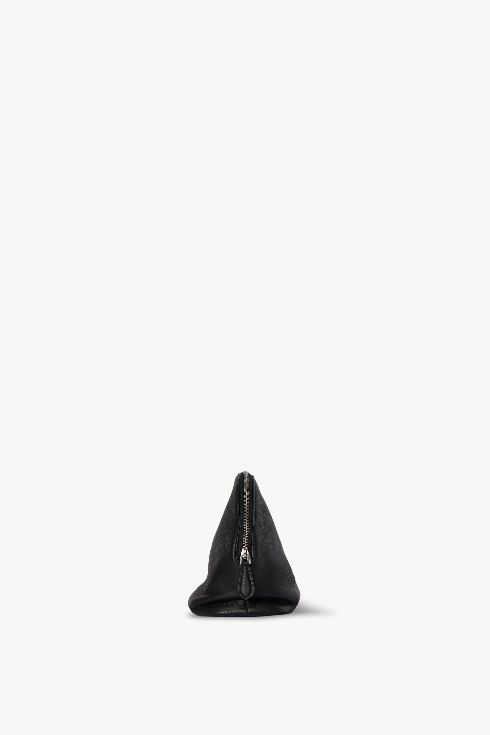 Geometric clutch in pebbled calfskin leather with softly slouched base. embossed logo on side. and zipper closure.
