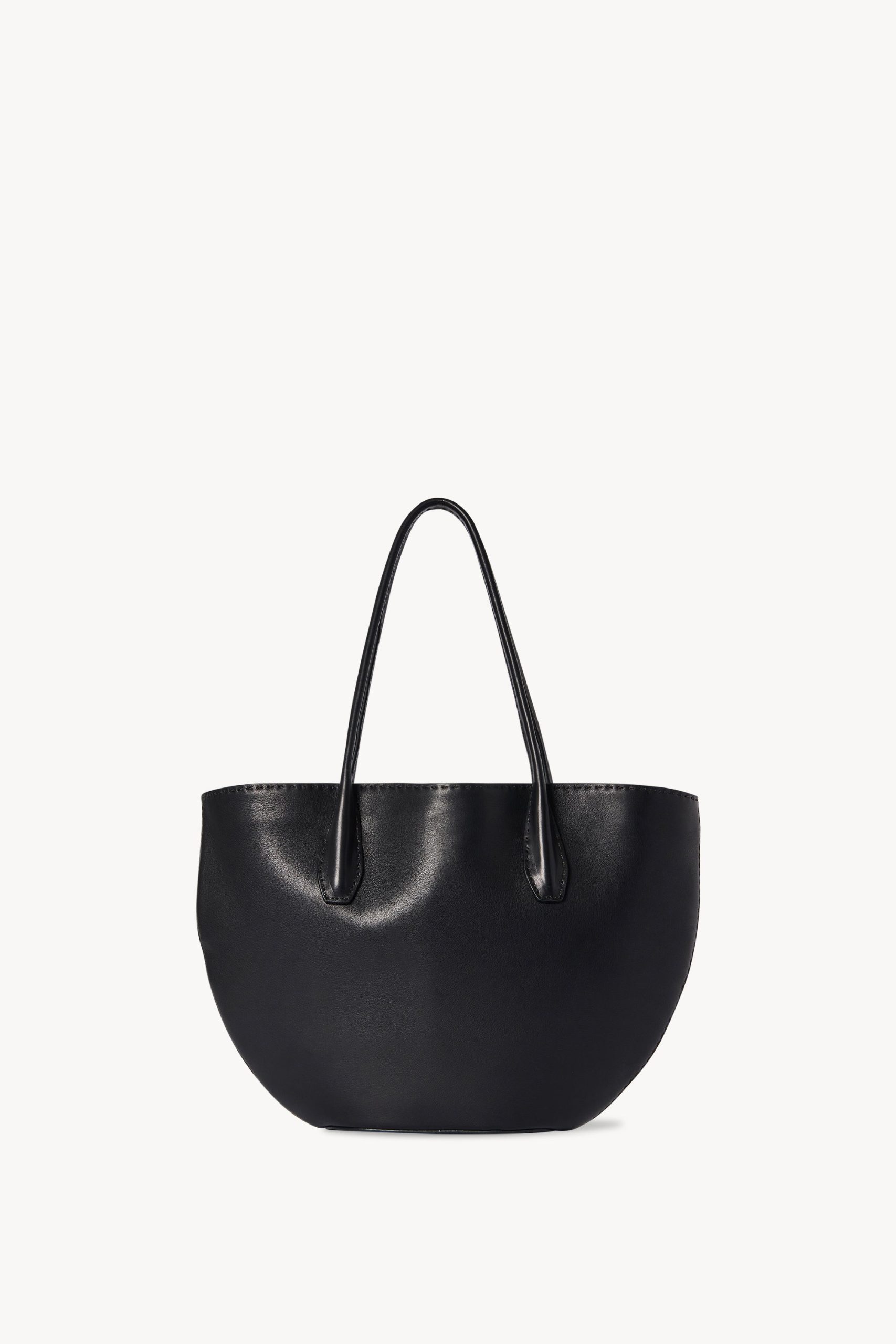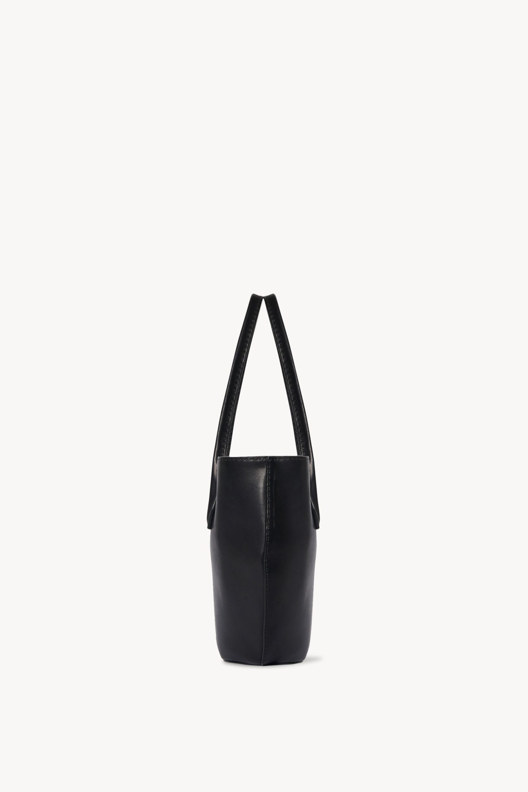 Geometric tote bag in polished saddle leather with tubular handles. flat base. and hand-stitched construction.