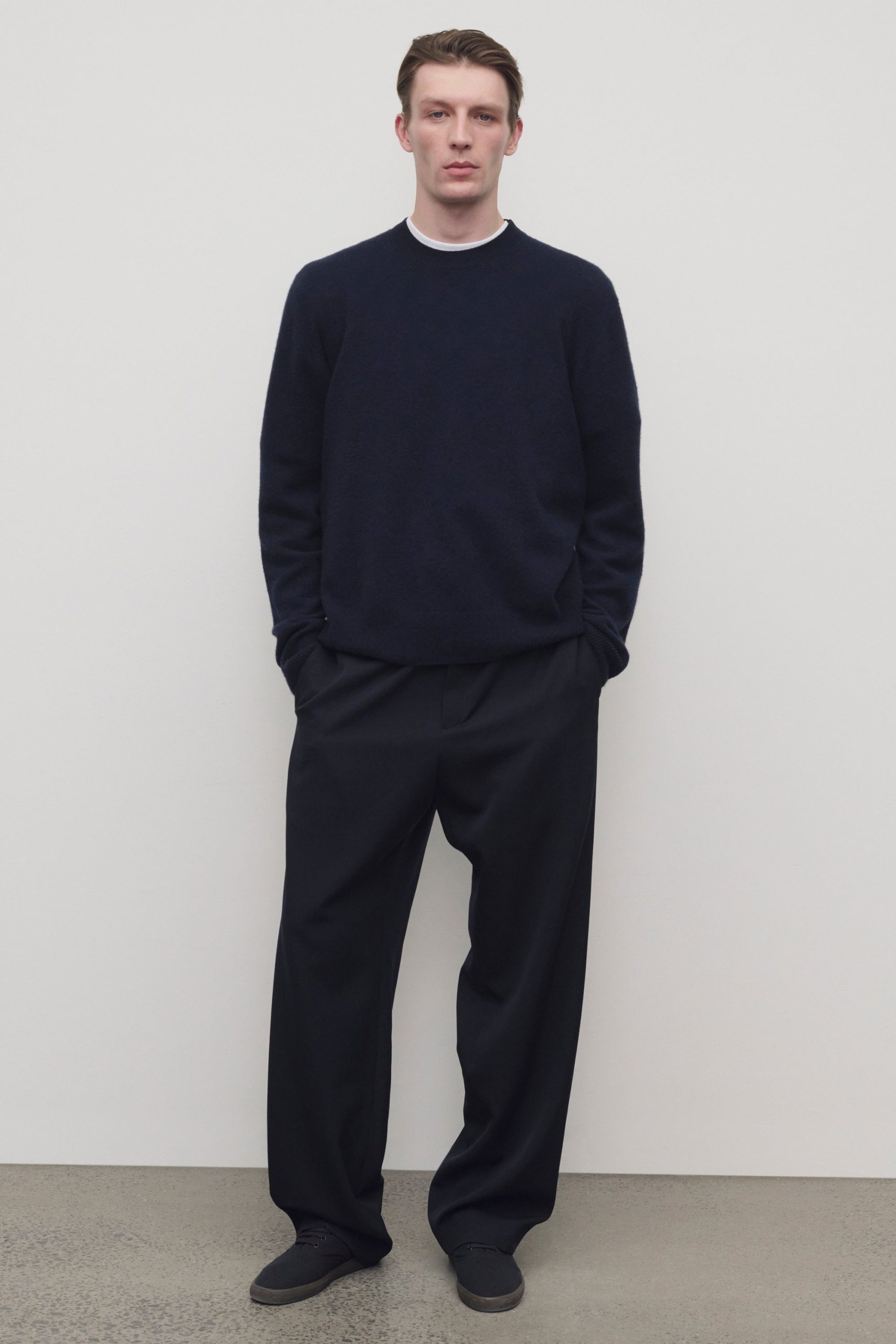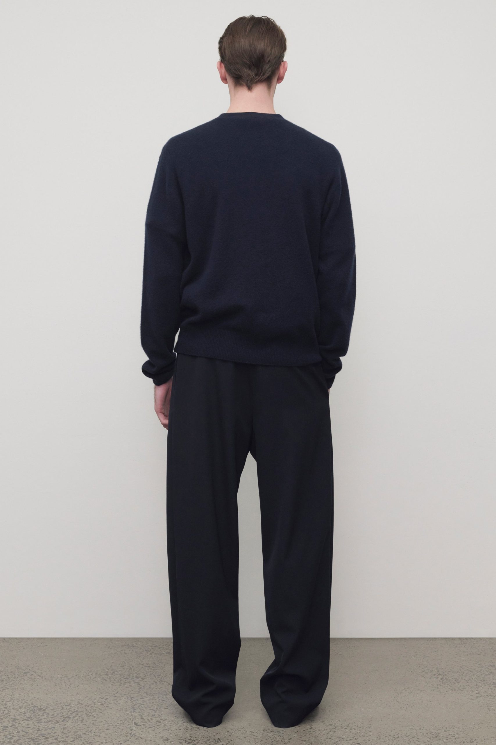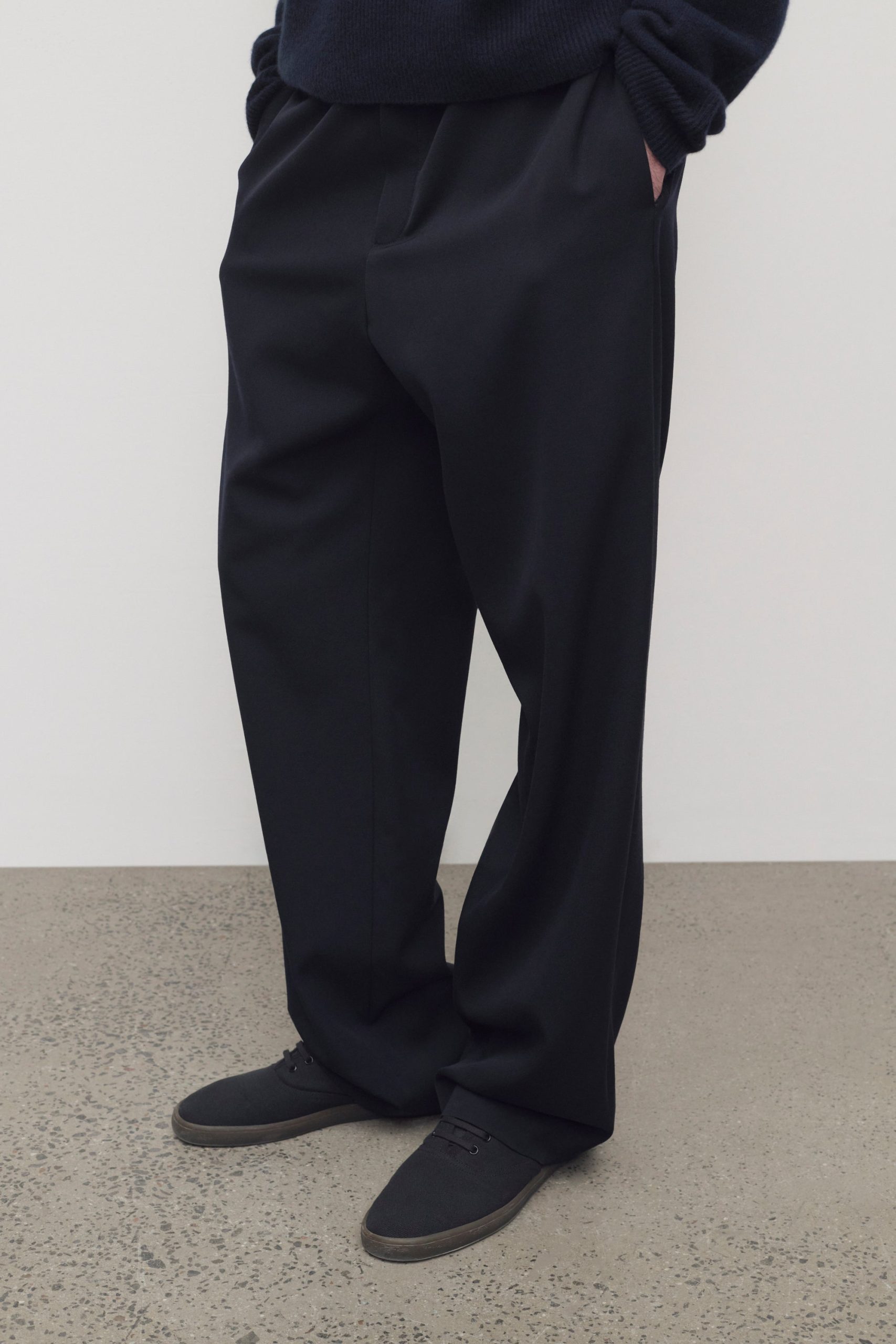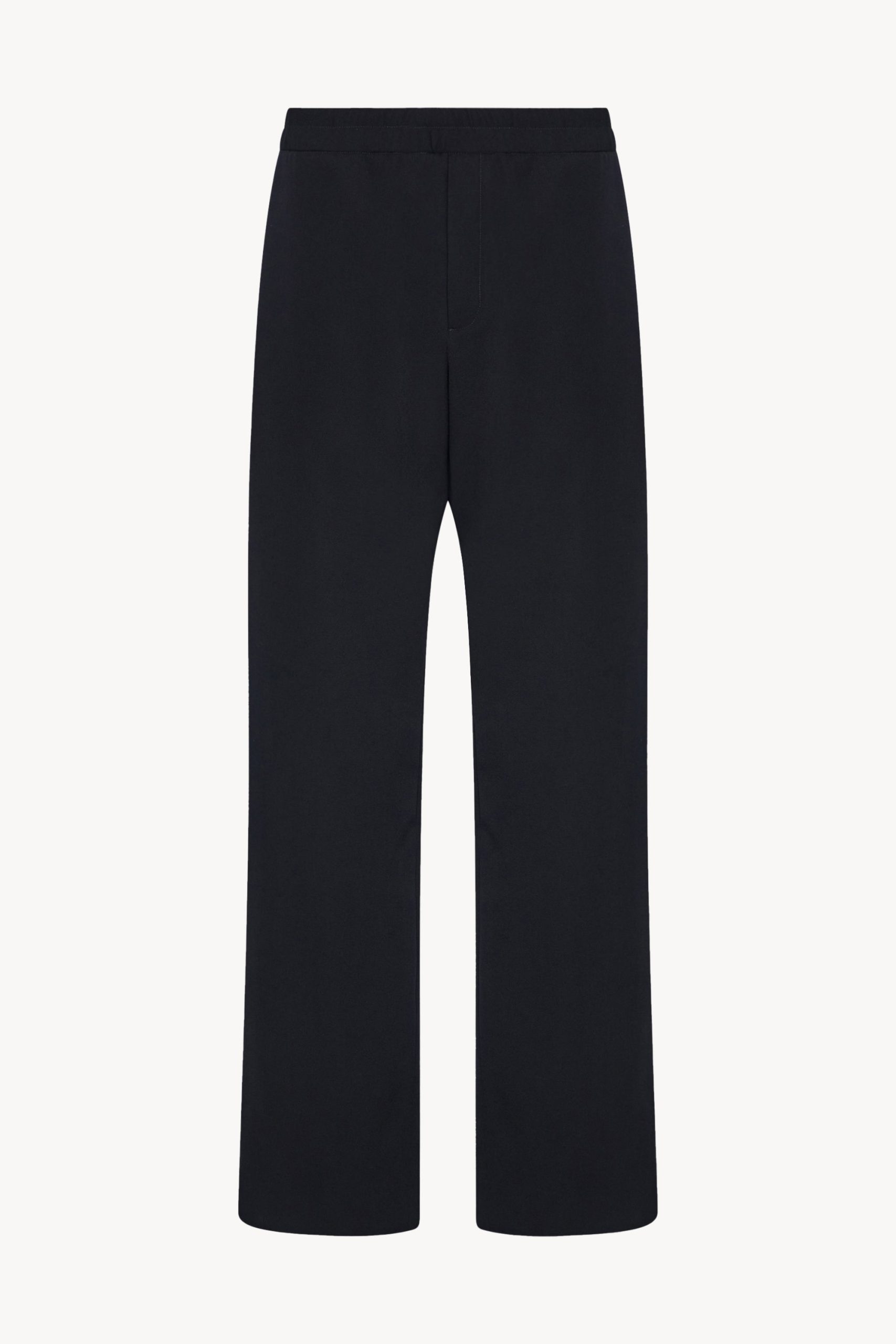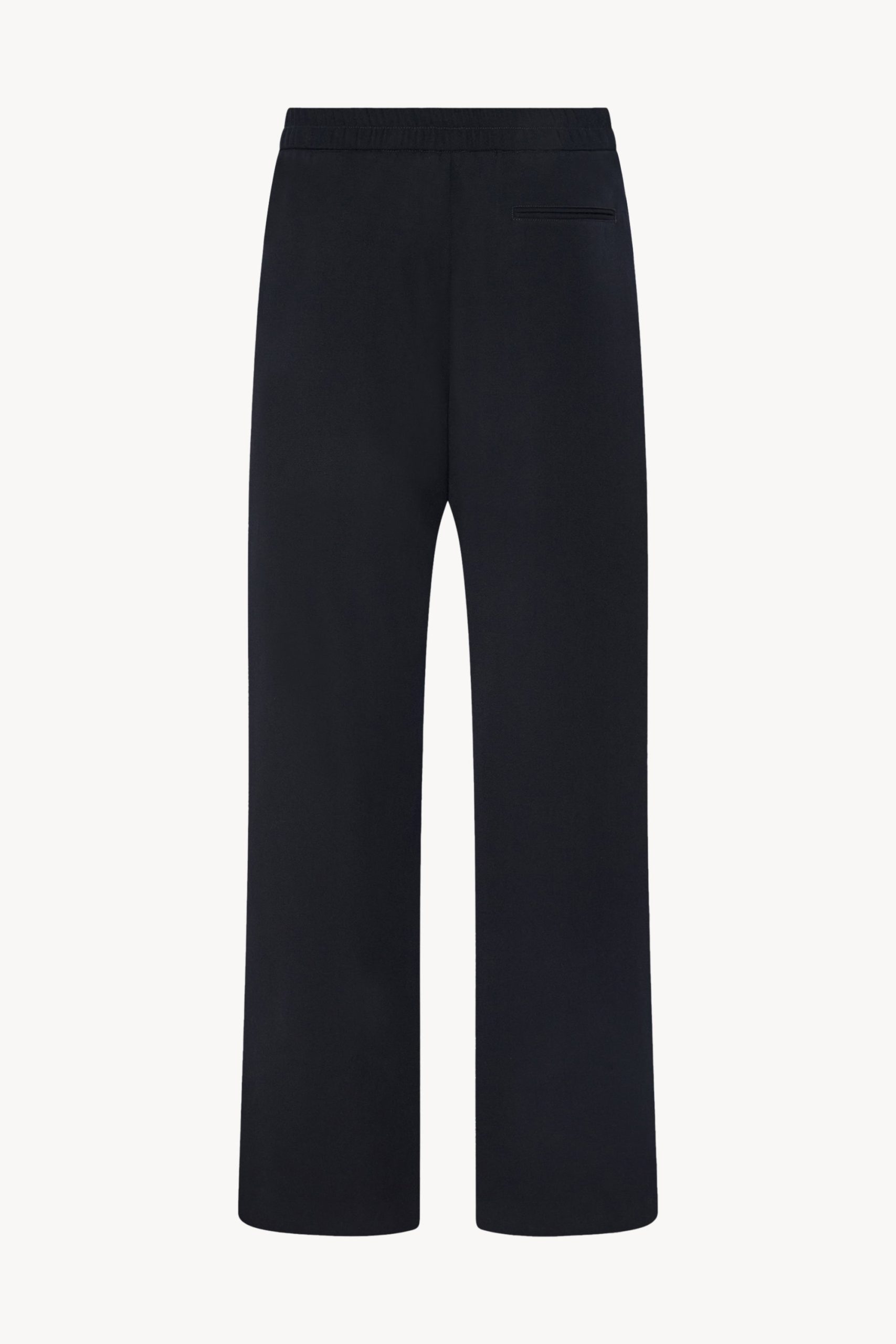 Casual mid-rise pant in smooth midweight wool gabardine with wide leg. side seam pockets. and drawstring waist.