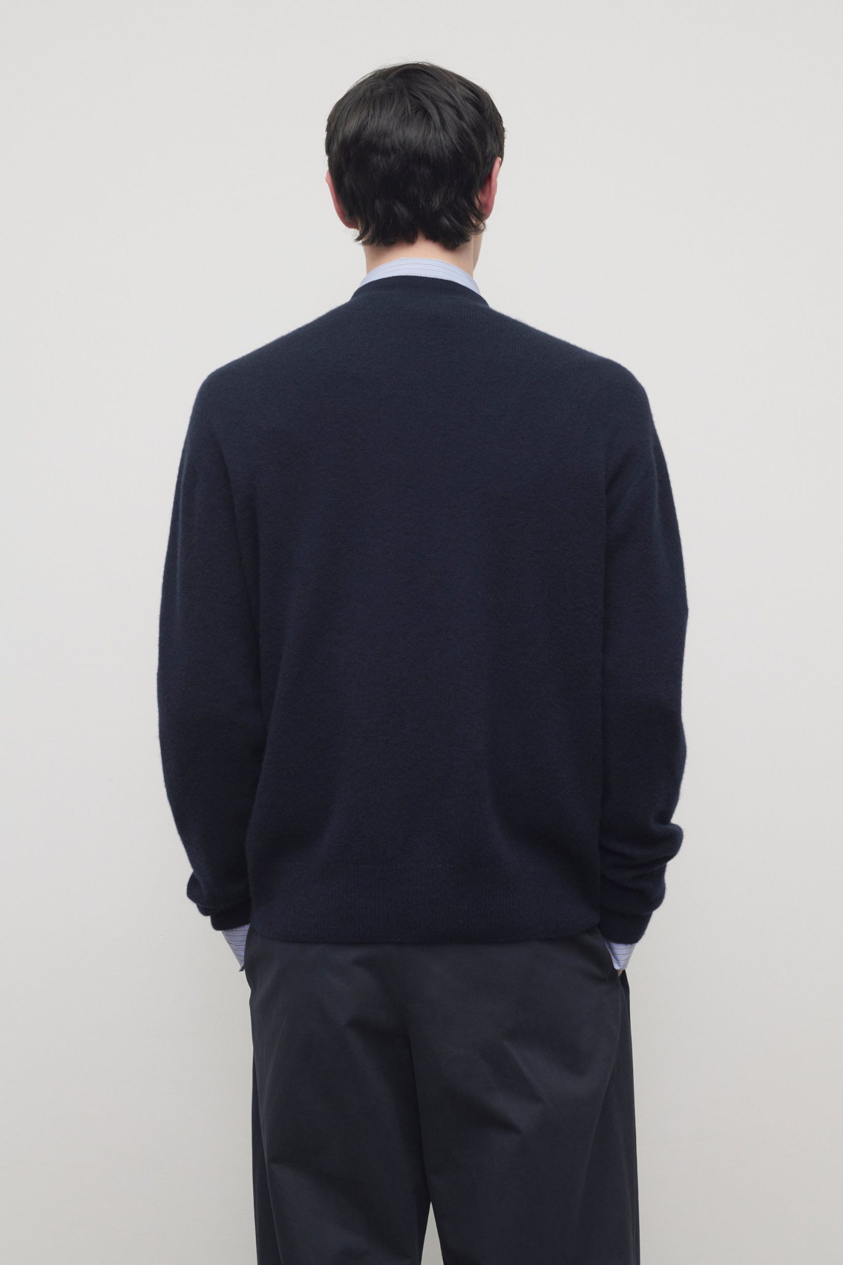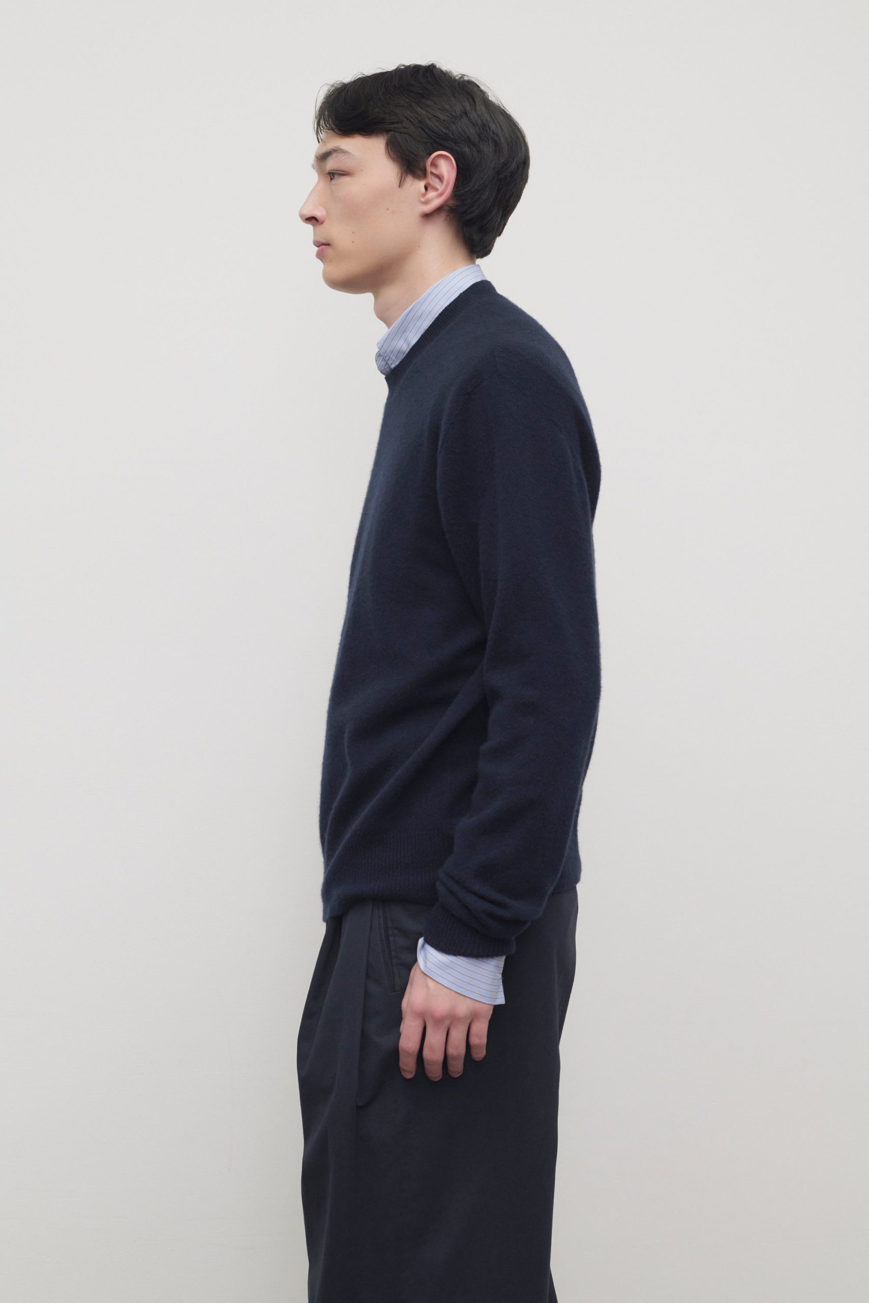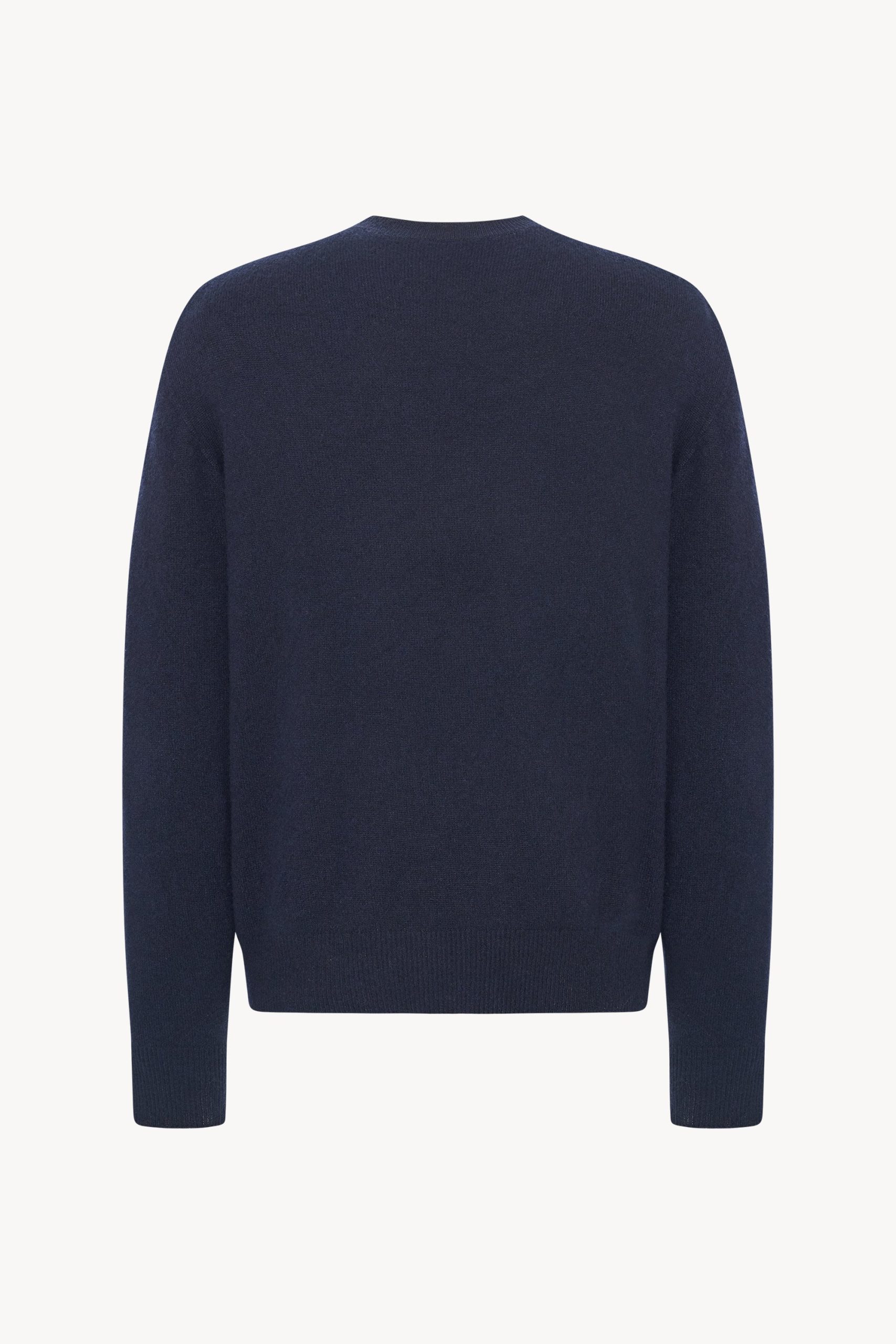 Classic long-sleeved crewneck top in ultrasoft Japanese cashmere with relaxed boxy fit. seamless construction. and ribbed neckline. cuffs. and hem. With an exceptionally lightweight structure and soft hand. the pure cashmere knit is ideal for seasonless layering.