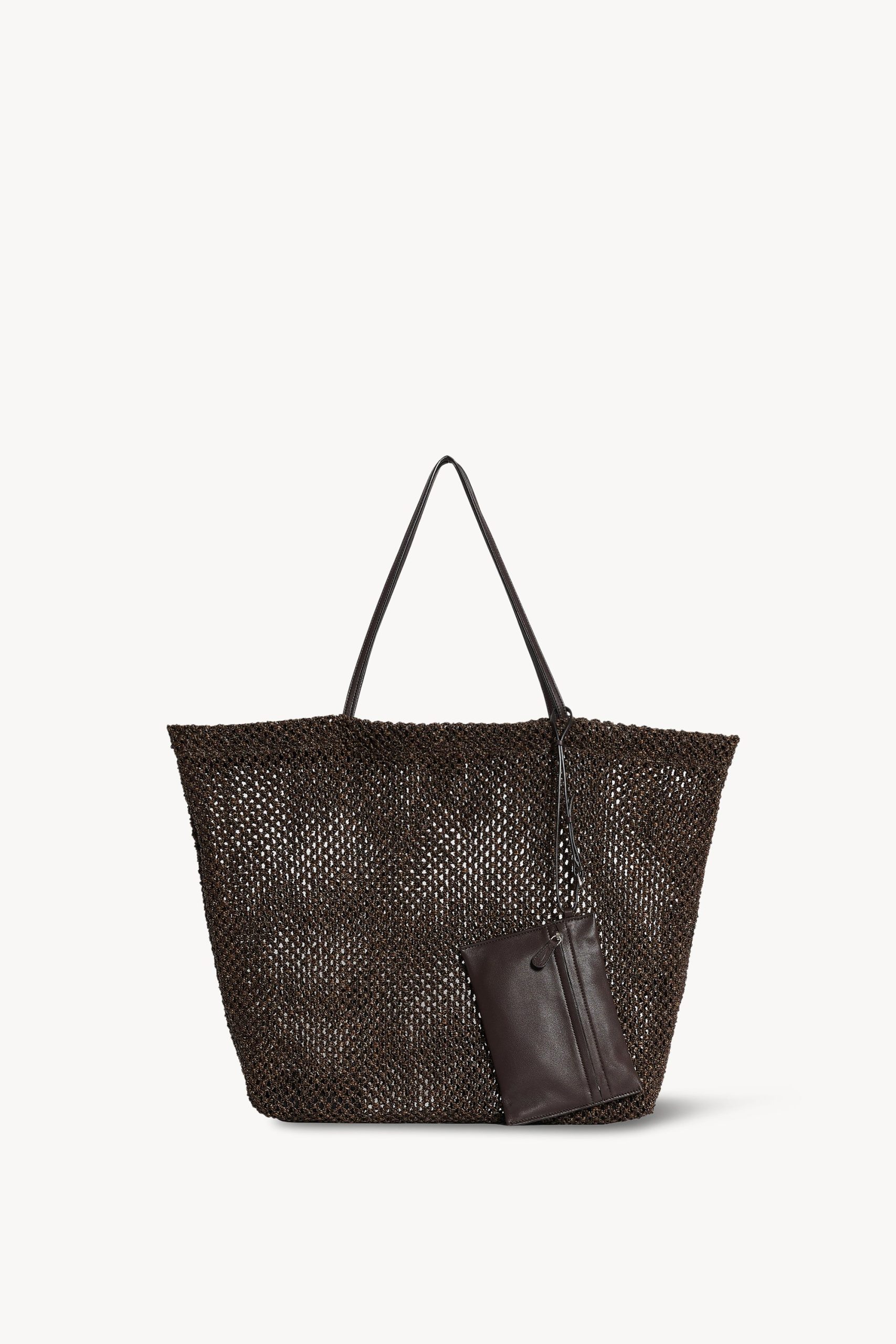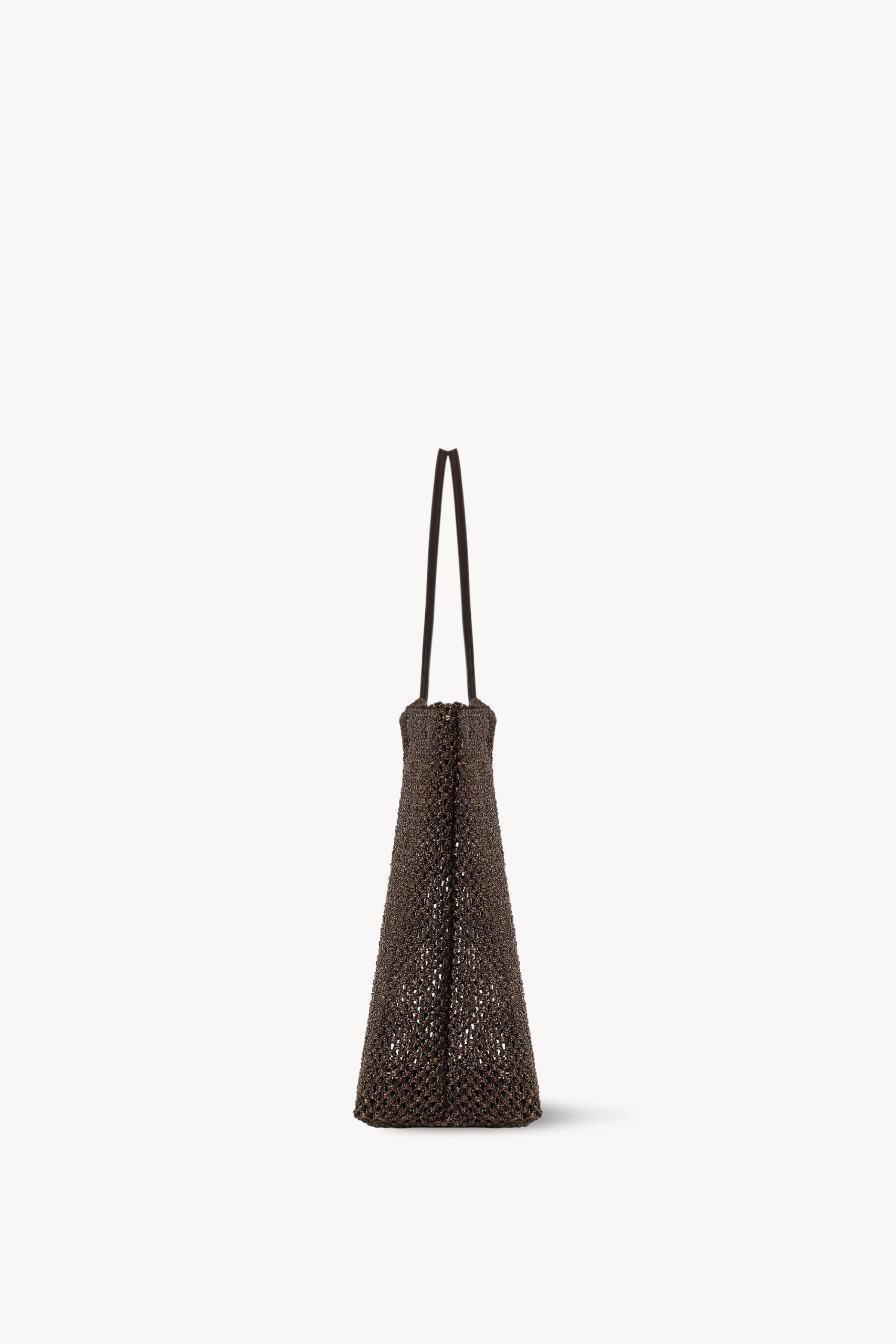 Artisanally-crafted geometric tote bag in woven nylon with two slim leather handles and open top. Implementing an open crochet technique. the minimal silhouette offers strength and durability while retaining a relaxed feel.