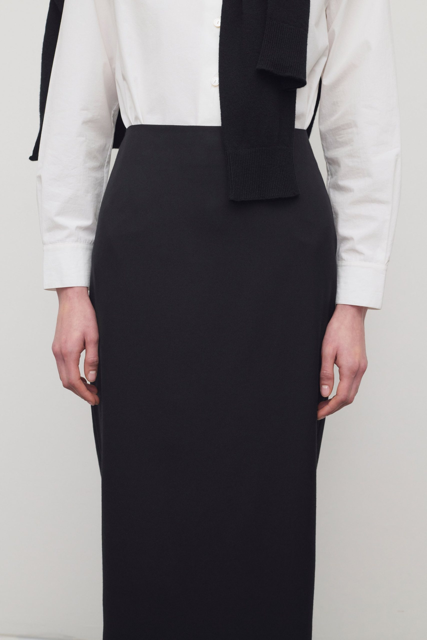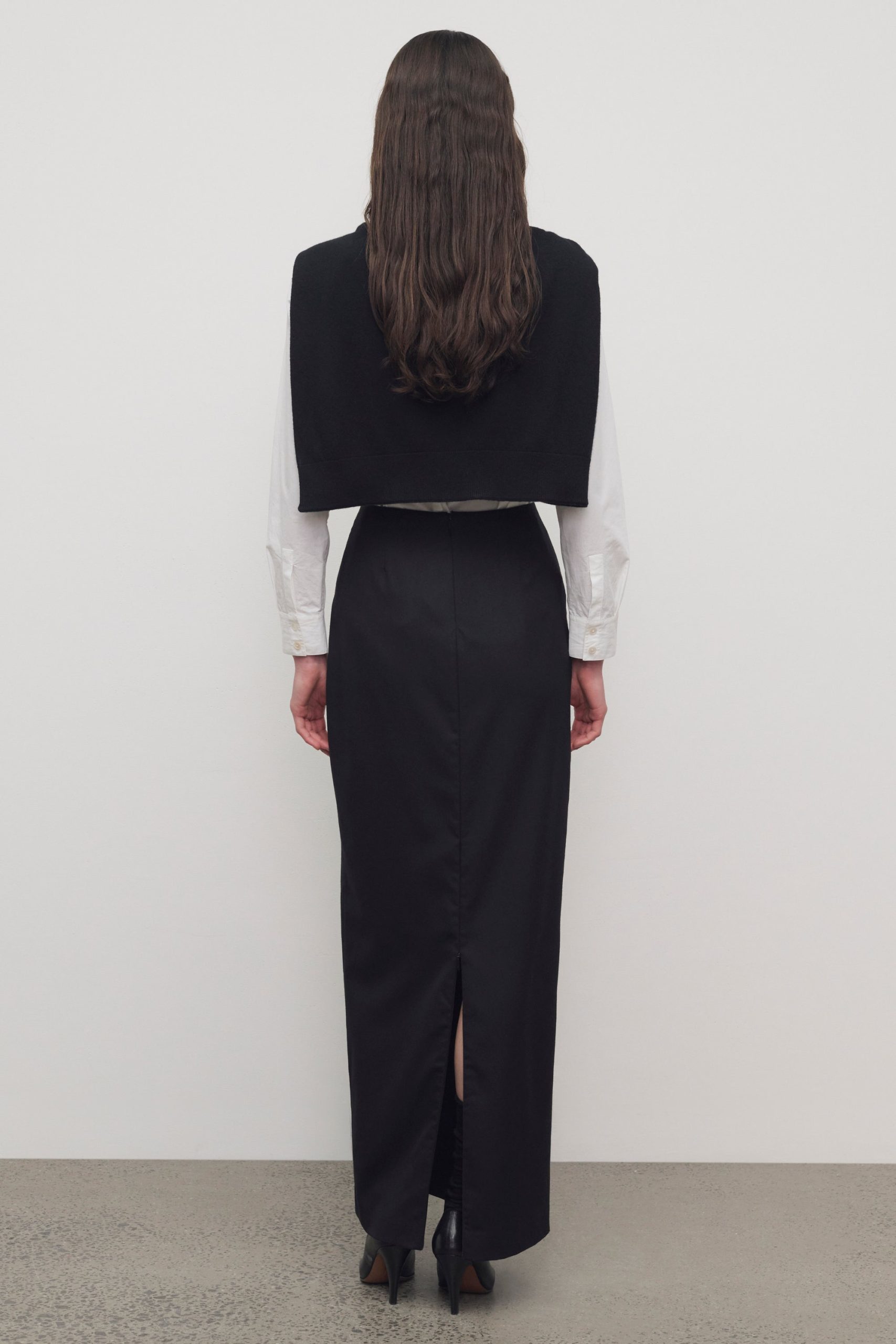 Ankle-length pencil skirt in fluid lightweight wool with slim fit and concealed two-way zipper at center back.