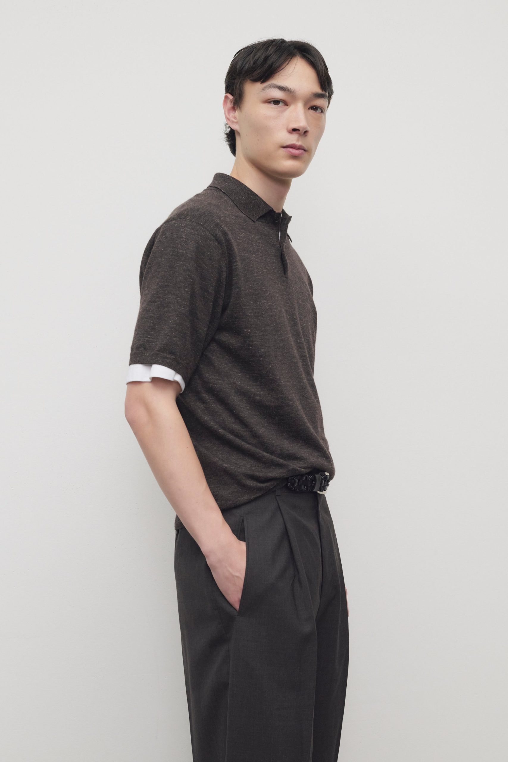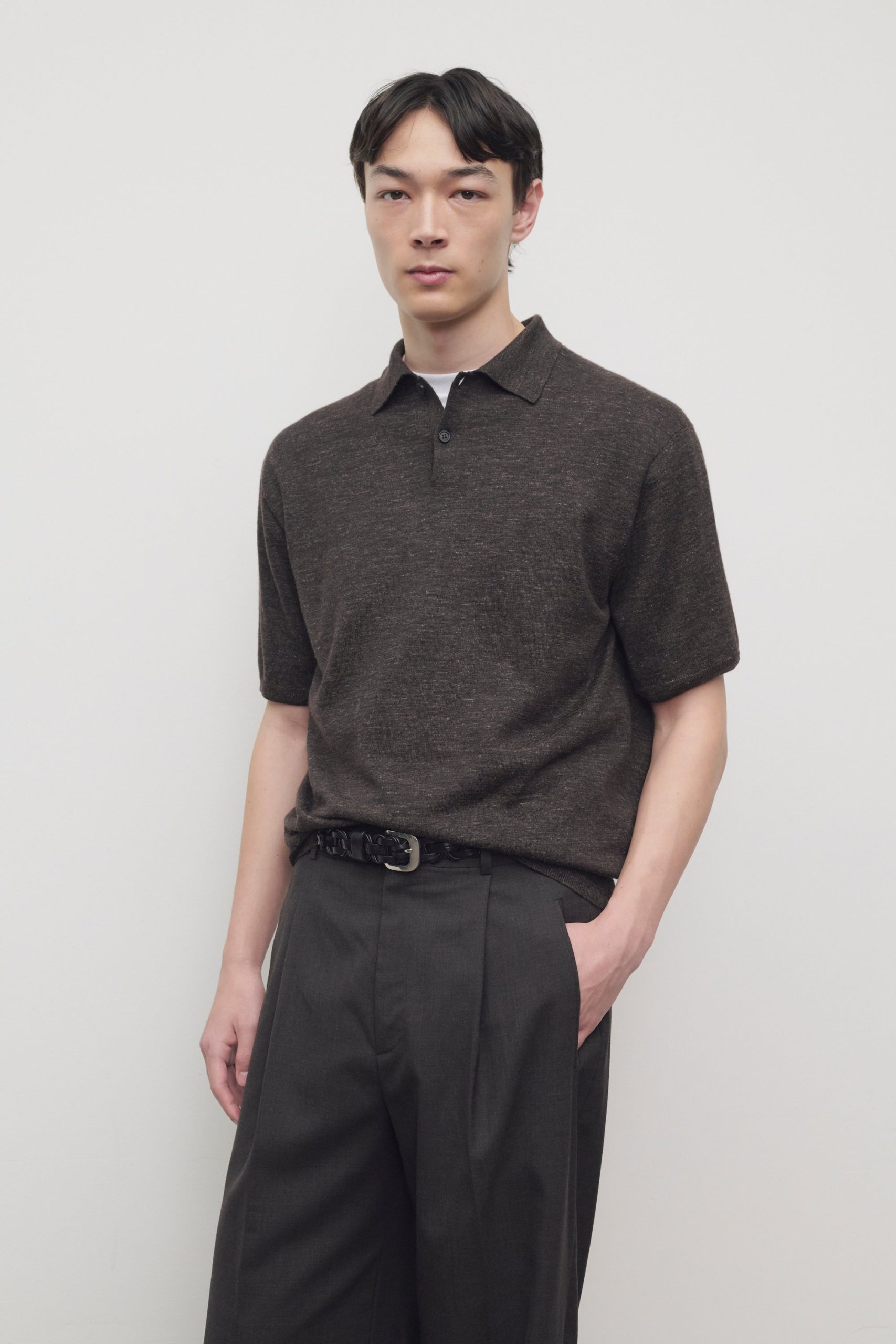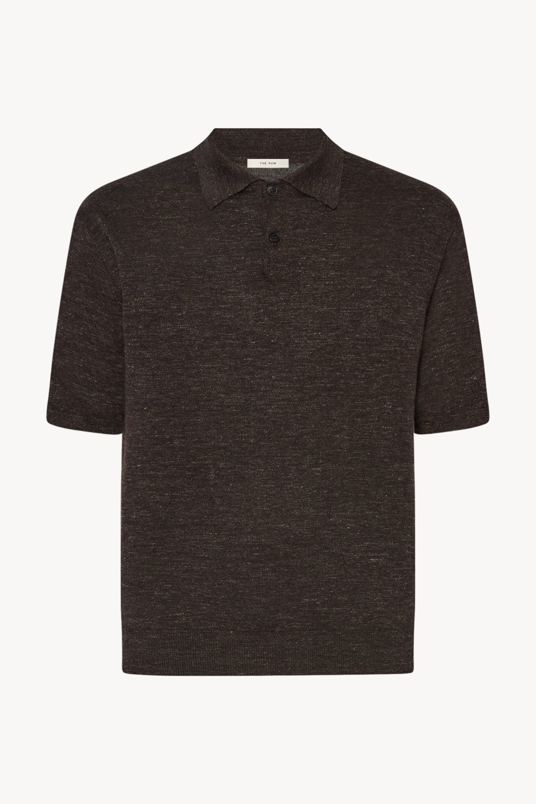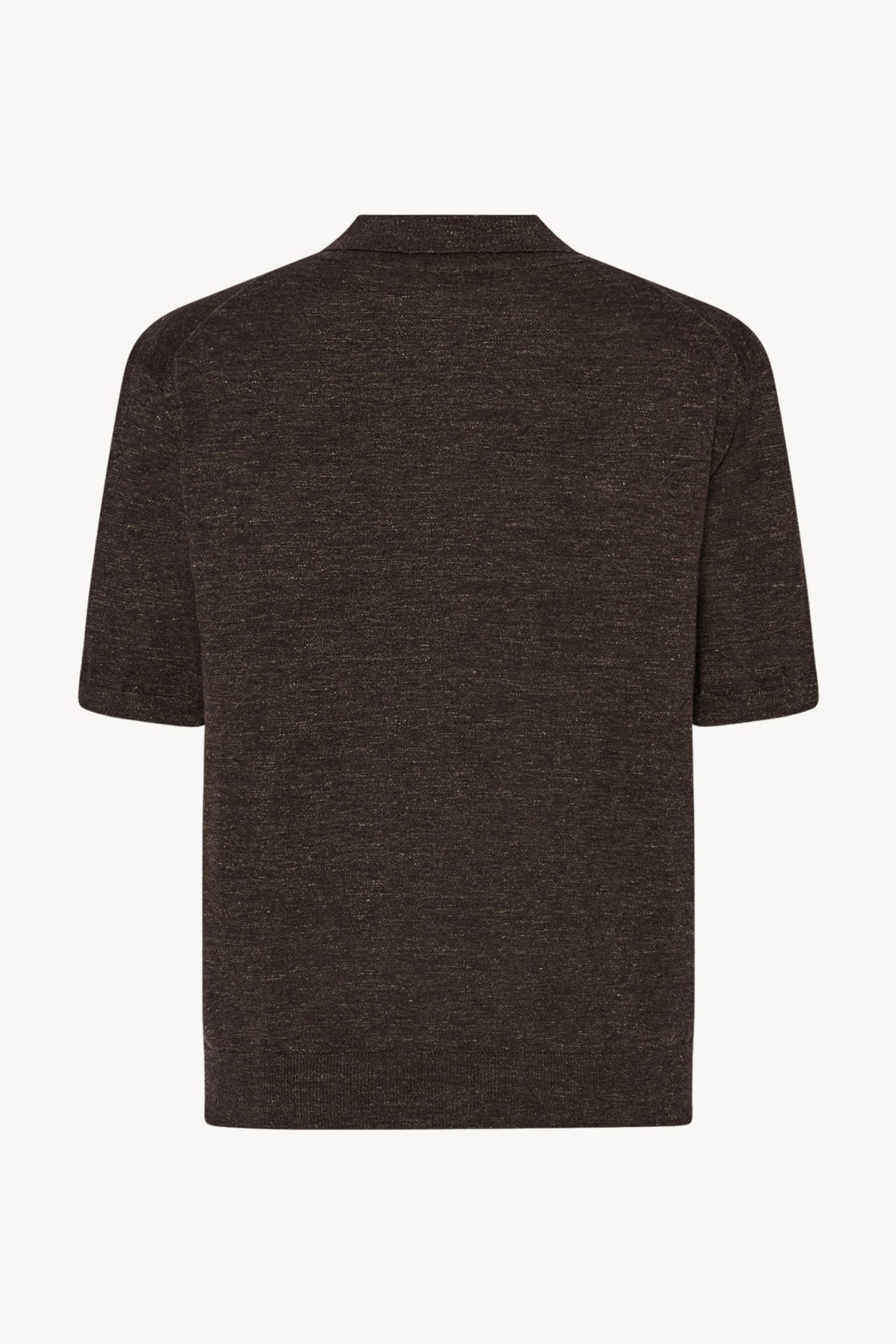Short-sleeved polo top in lightweight melange cashmere with boxy fit. horn buttons. and ribbed collar. cuffs. and hem. Crafted from cashmere. linen. and silk. the breathable knit offers a tactile hand and relaxed. elegant feel.