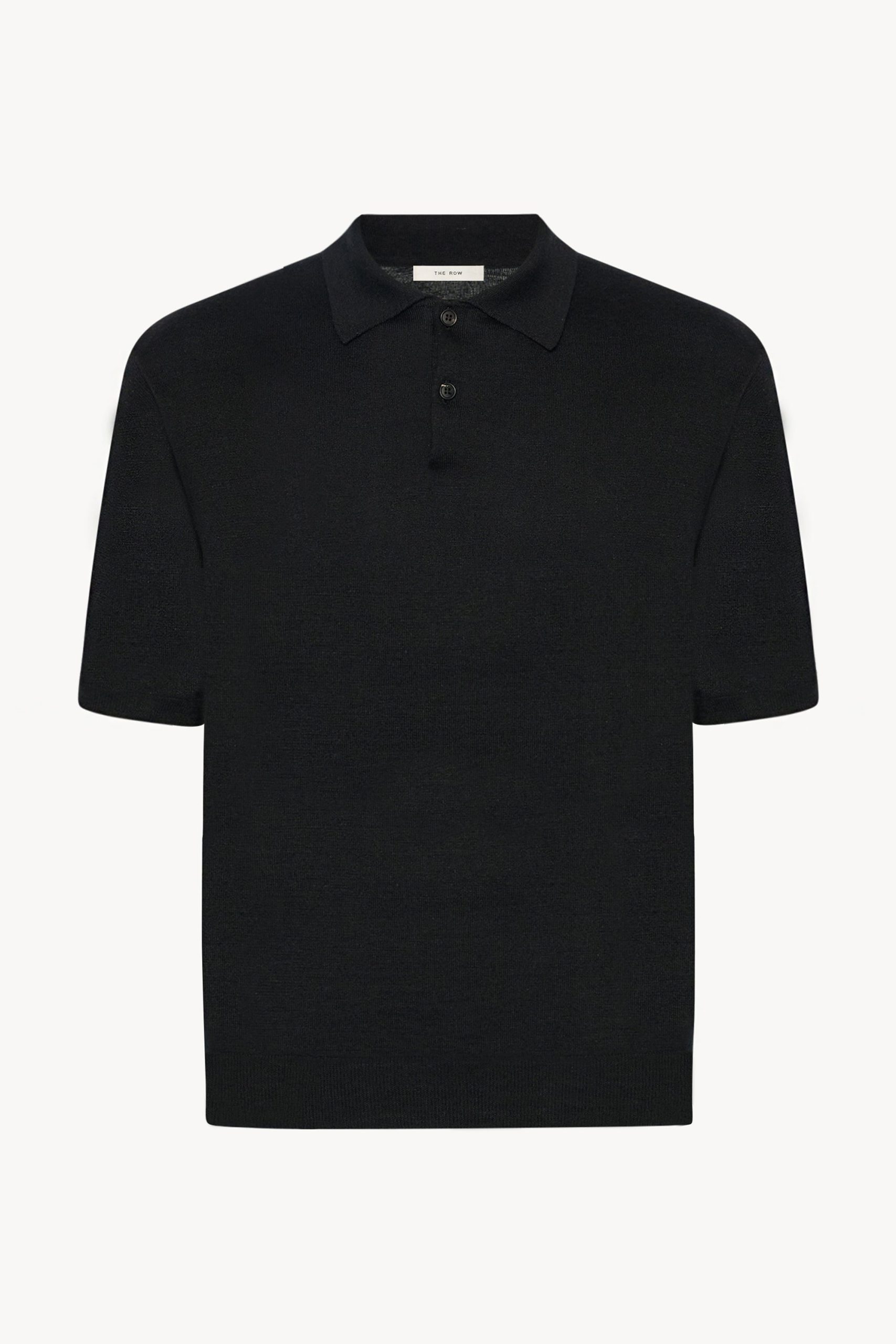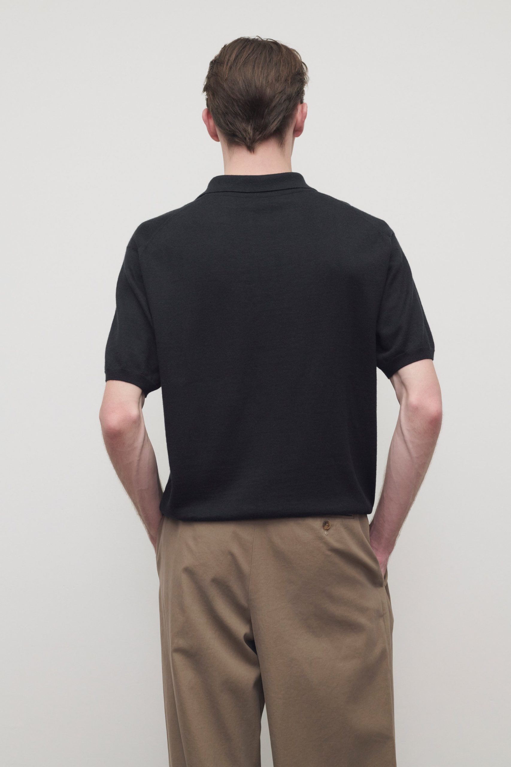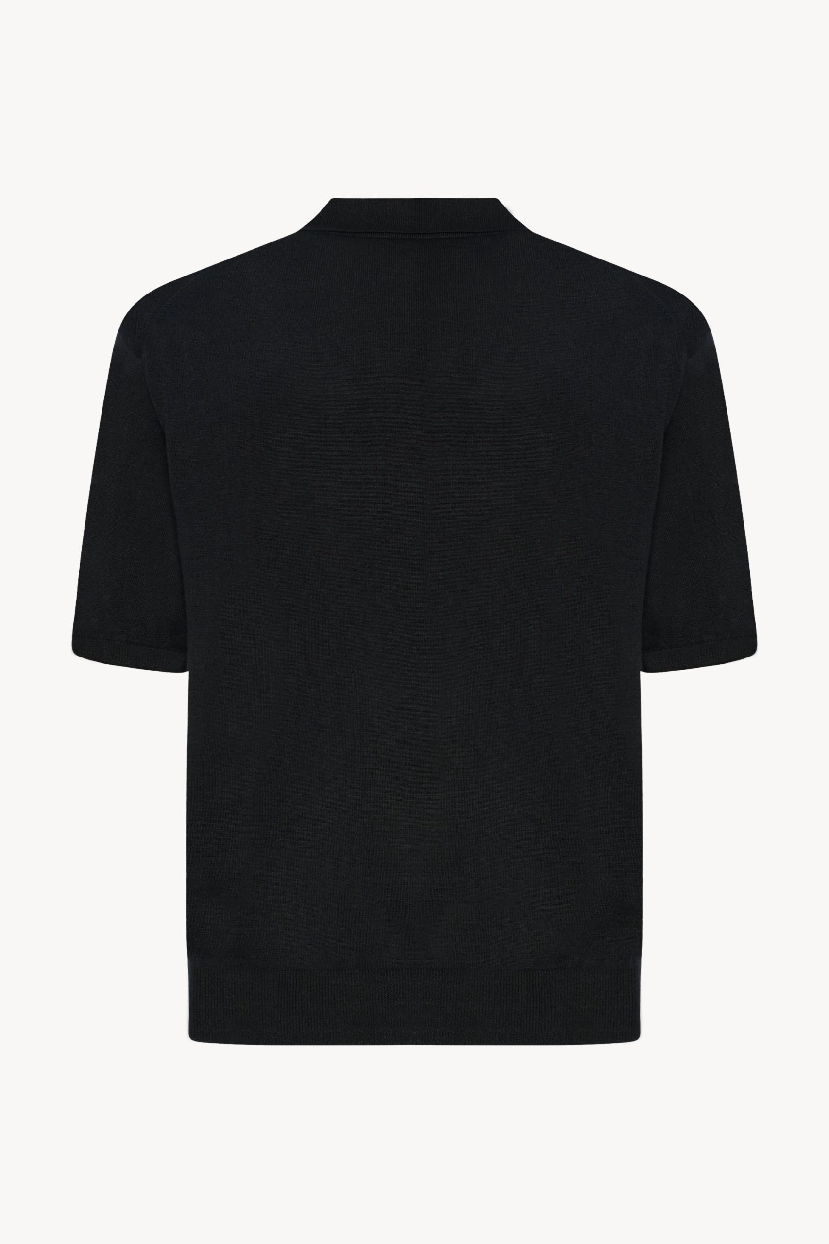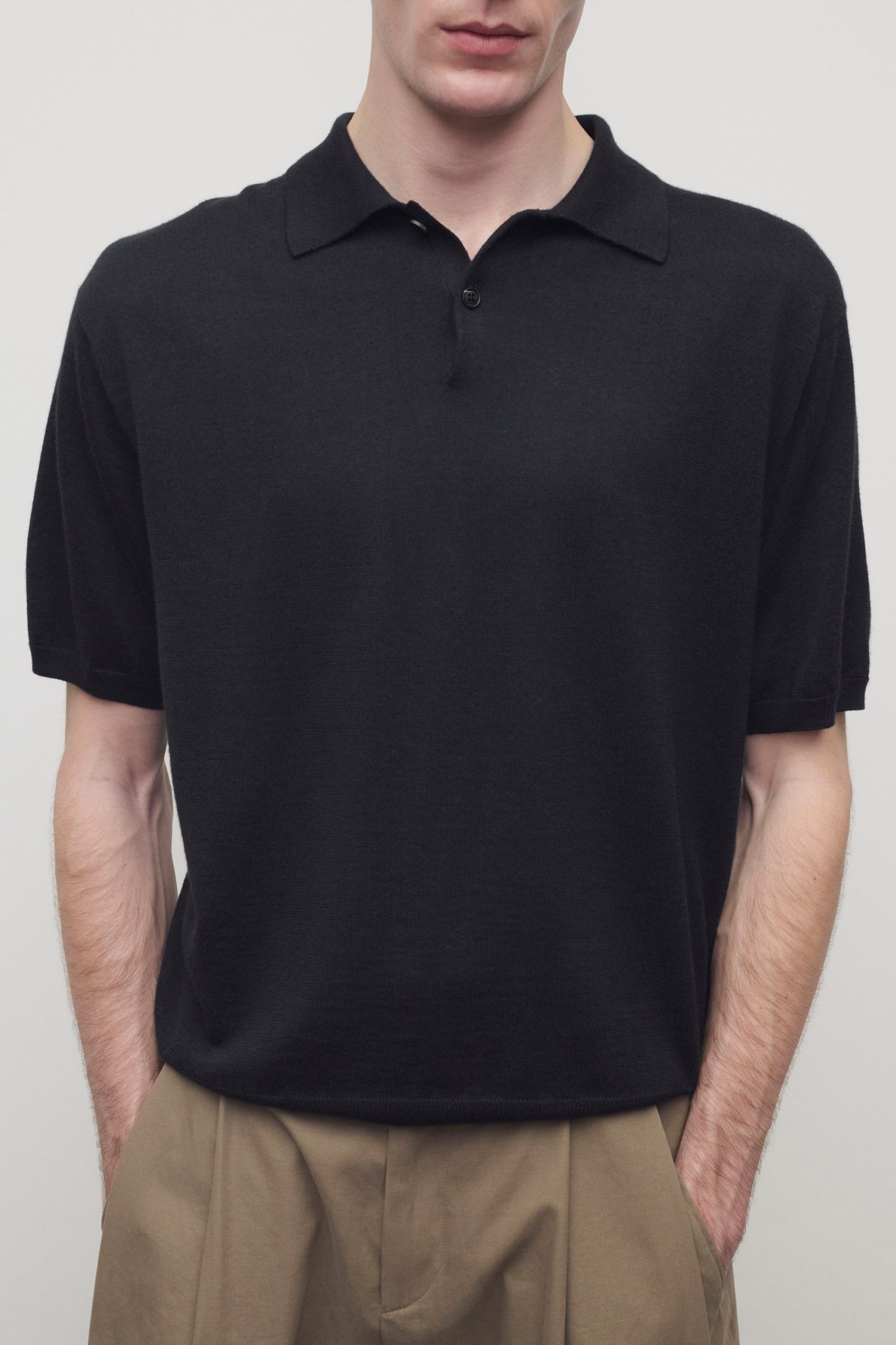 Short-sleeved polo top in lightweight melange cashmere with boxy fit. horn buttons. and ribbed collar. cuffs. and hem. Crafted from cashmere. linen. and silk. the breathable knit offers a tactile hand and relaxed. elegant feel.