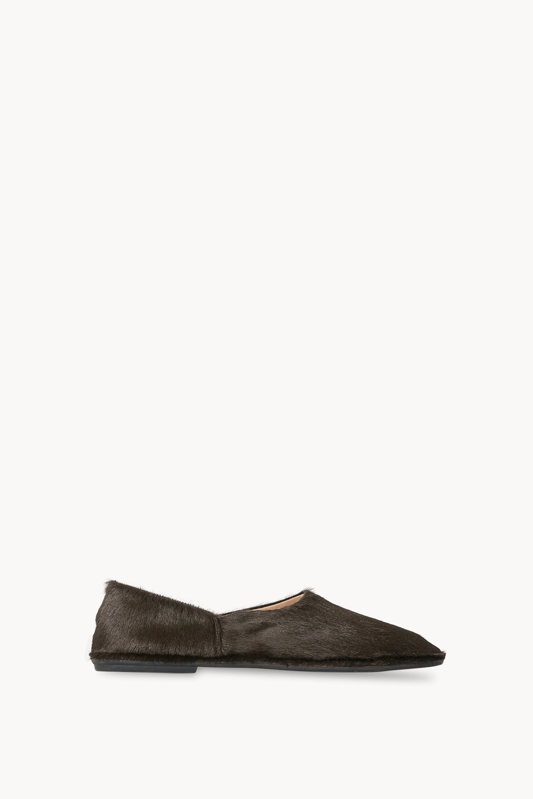 Minimal slip-on shoe in textured pony hair leather with round toe. contrast leather lining. and rubber sole.