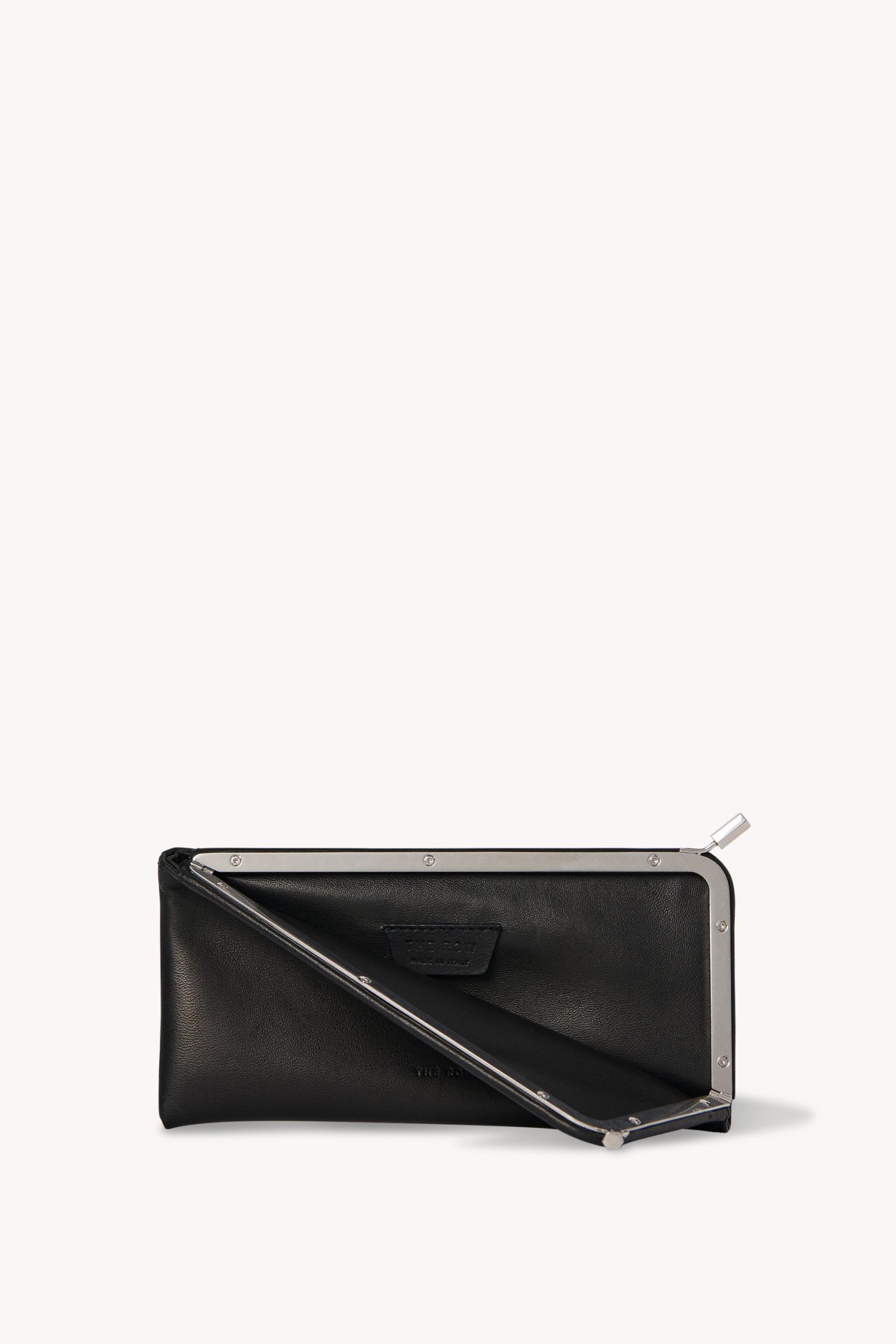 Minimal sunglasses case in buttery lambskin leather with top zipper closure and single interior pocket.