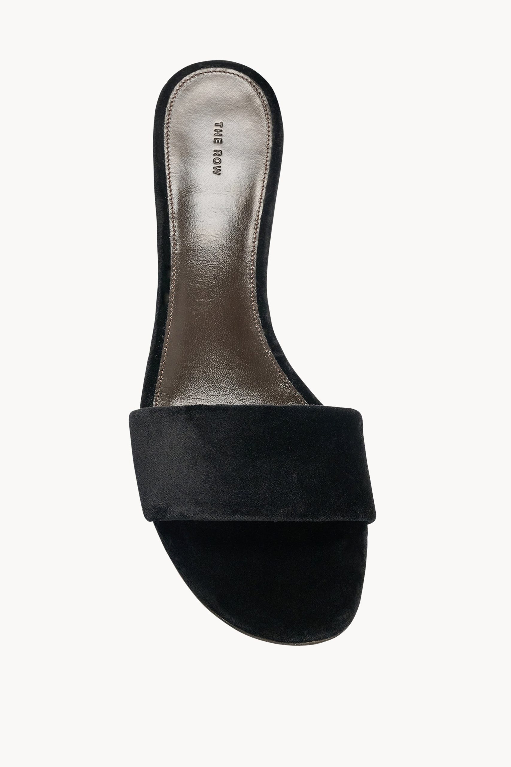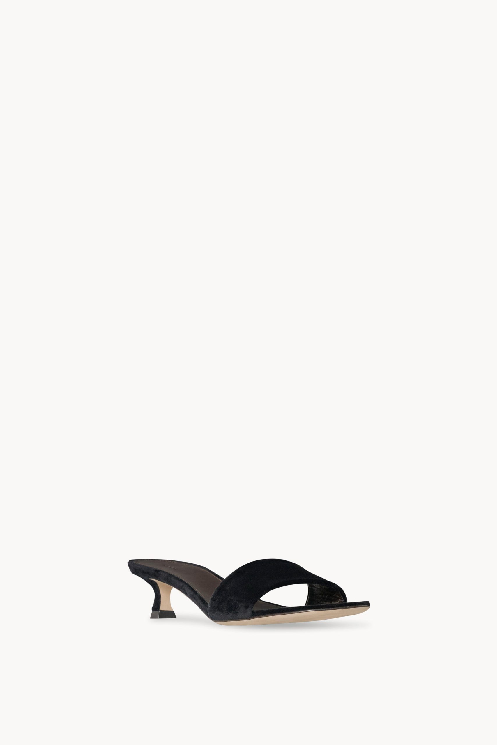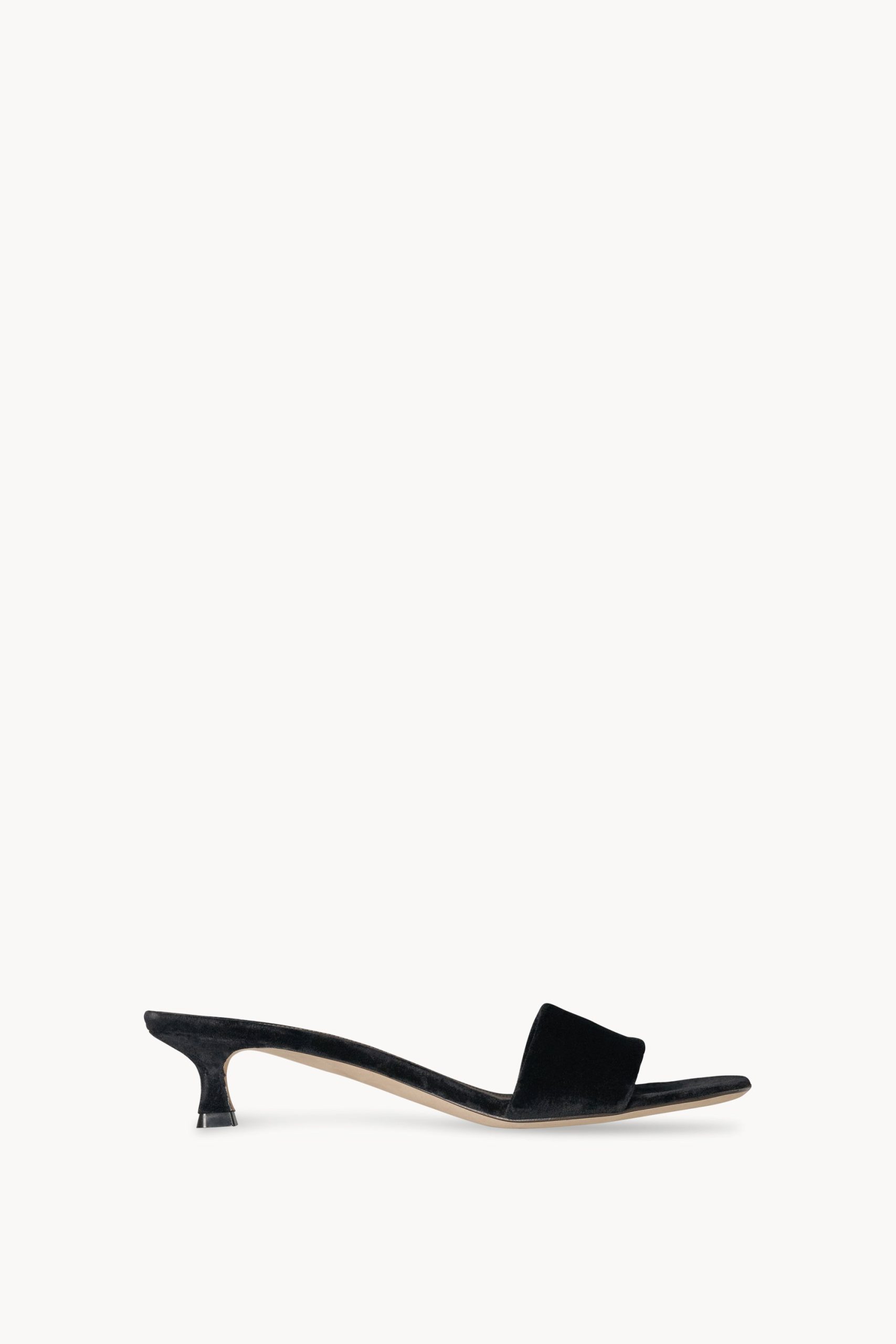 Kitten heel sandal in in plush velvet with structured front strap. tapered heel. and leather sole with rubber heel cap.