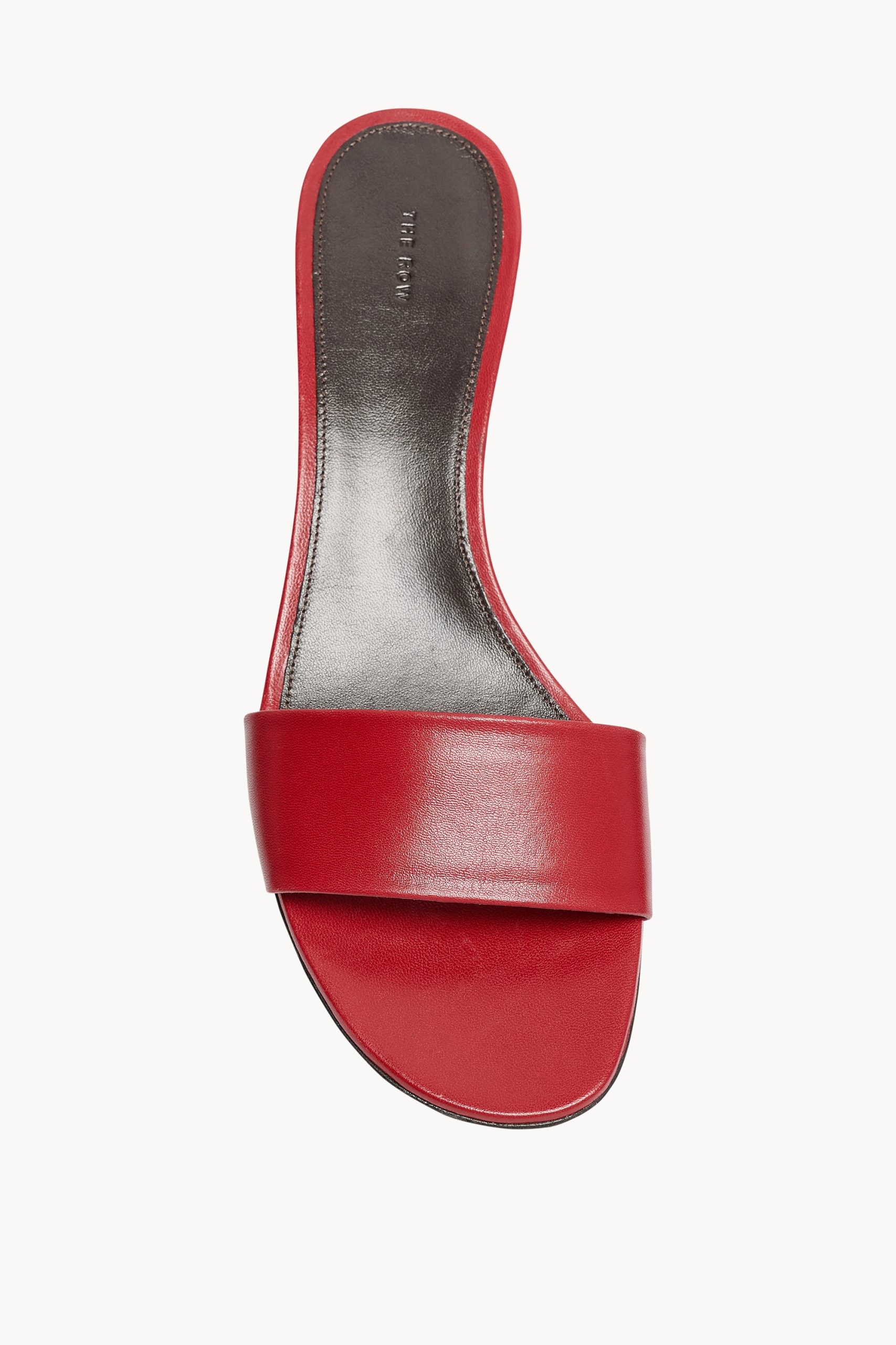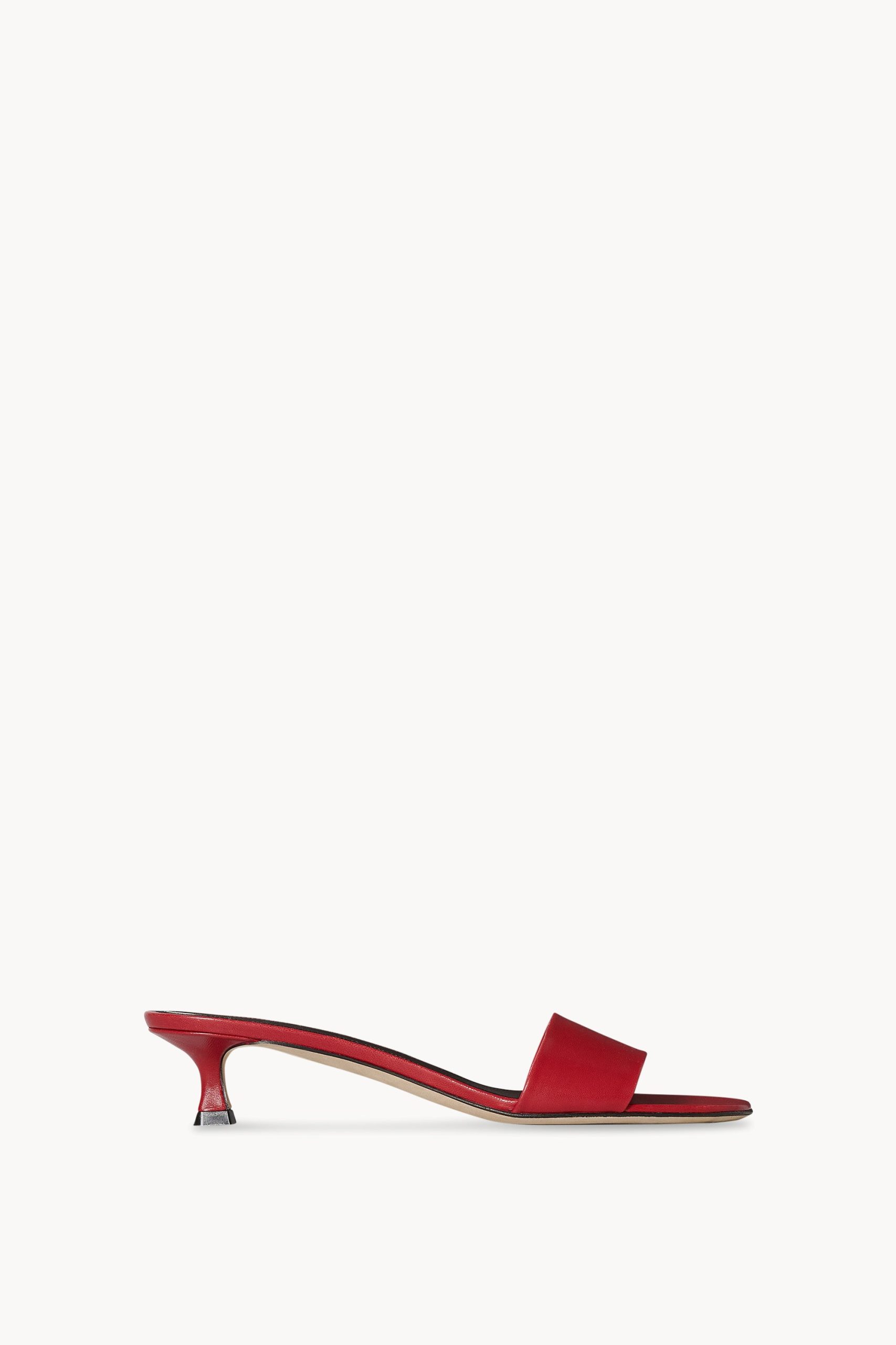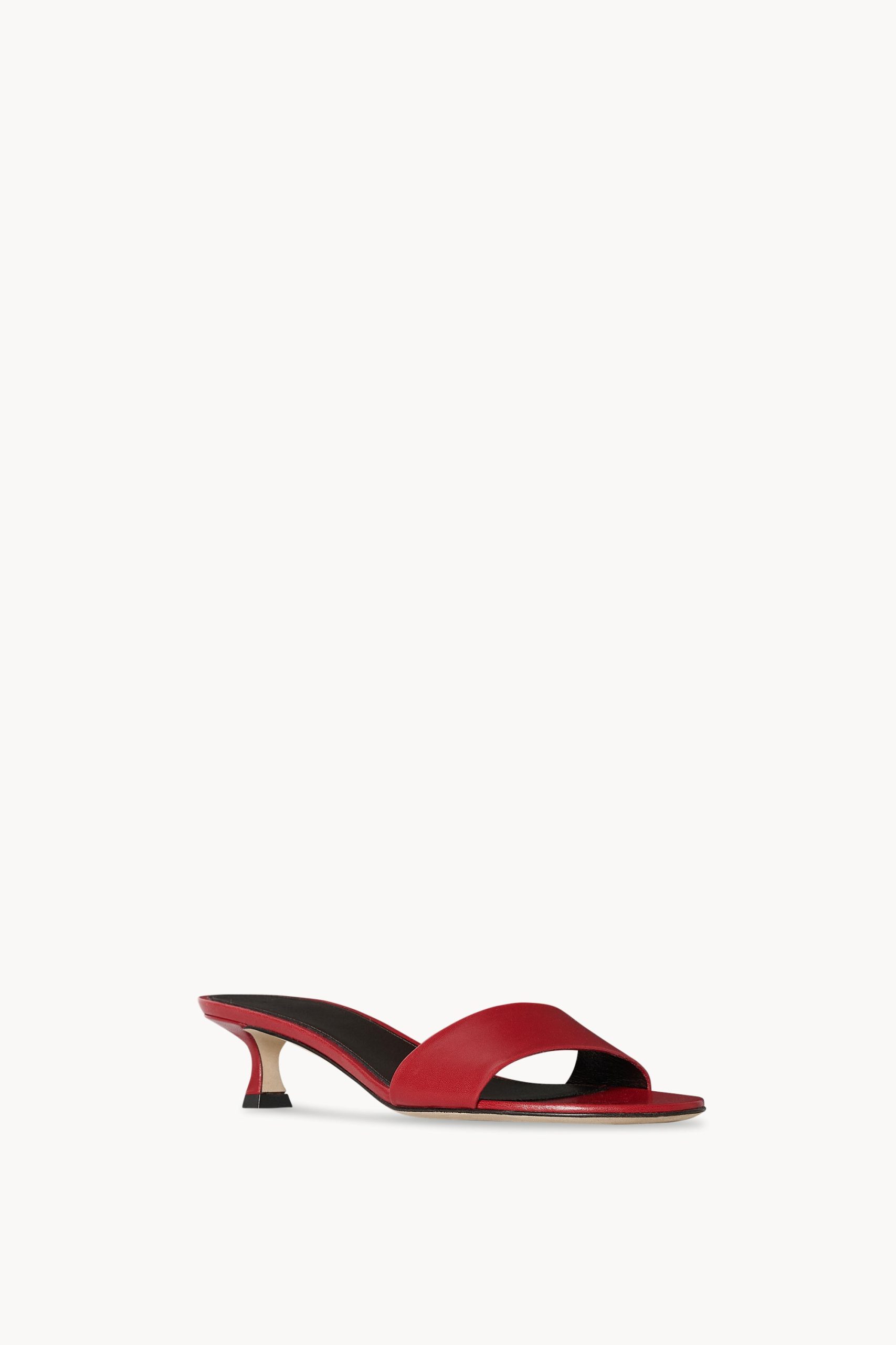 Kitten heel sandal in in soft lambskin leather with structured front strap. tapered heel. and leather sole with rubber heel cap.