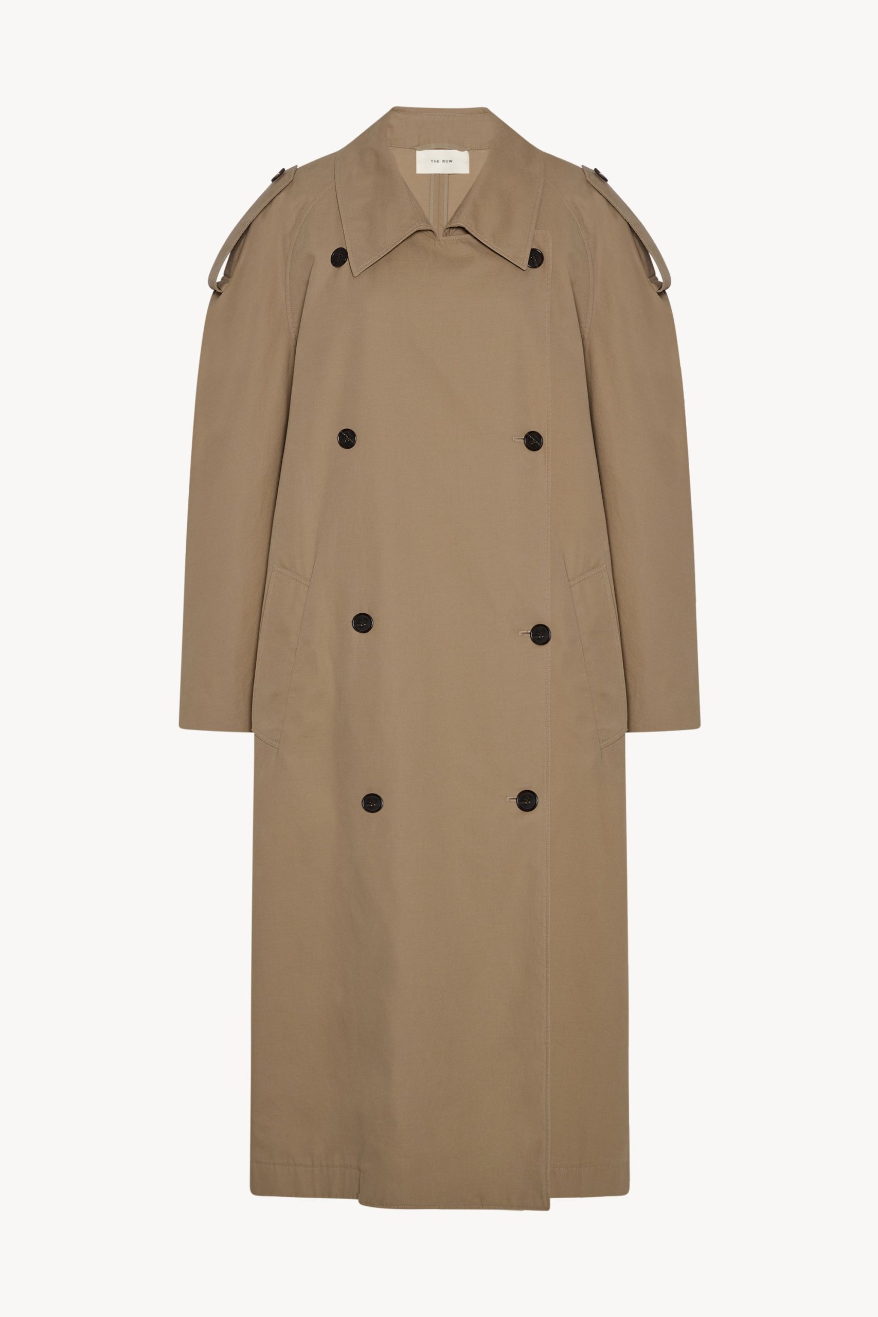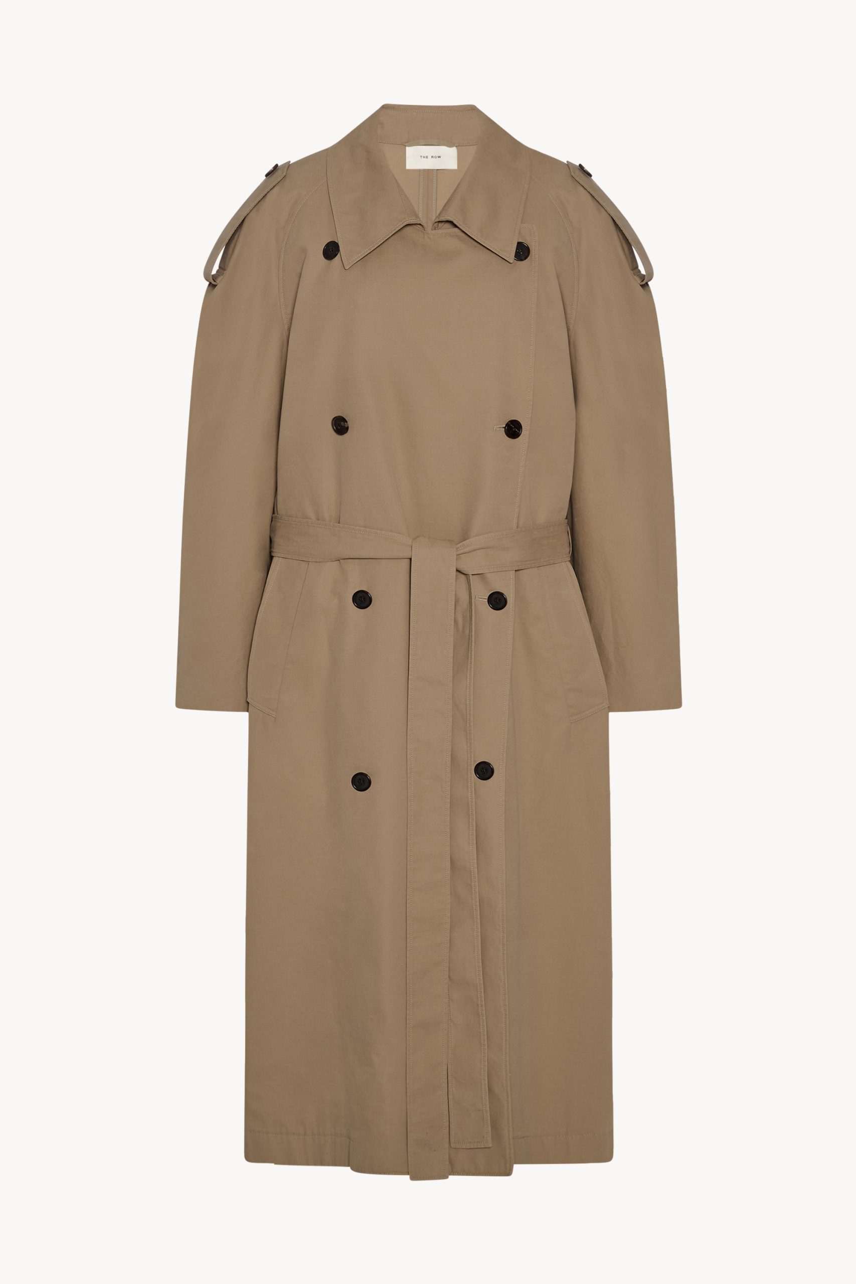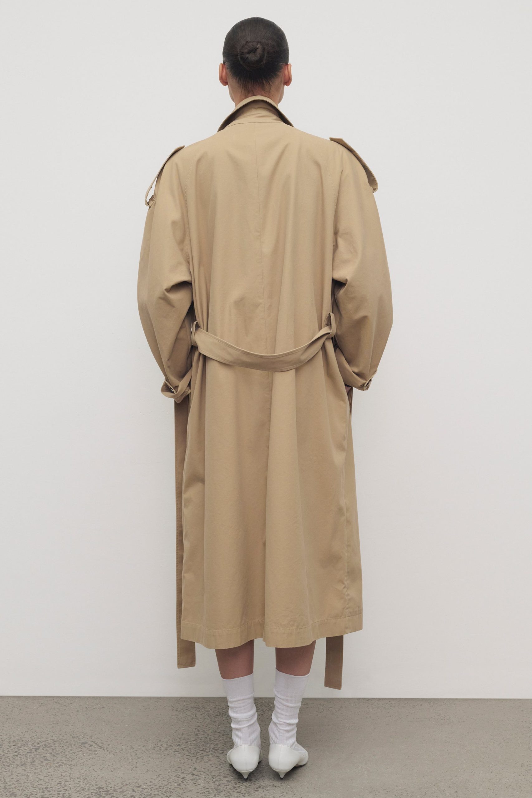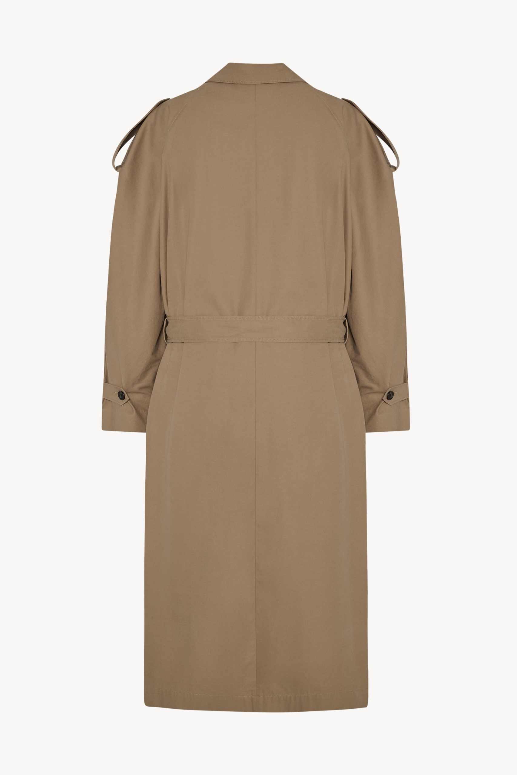 Double-breasted trench coat in refined cotton and cashmere gabardine with oversized knee-length fit. raglan construction. slant welt pockets. and long removable tie belt.