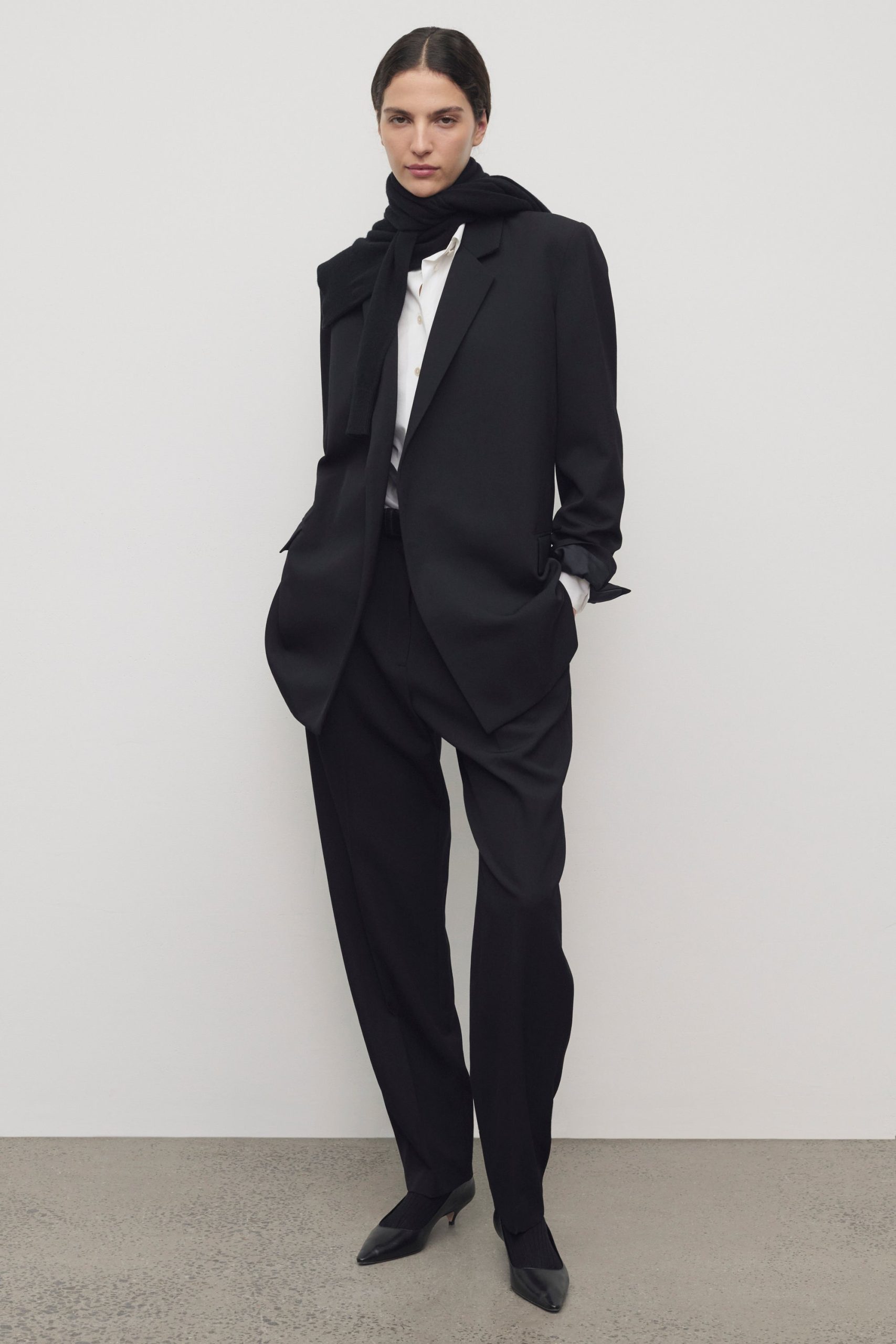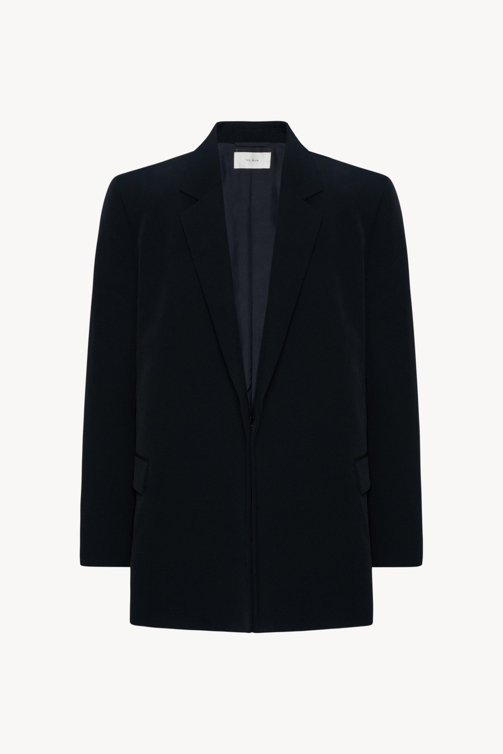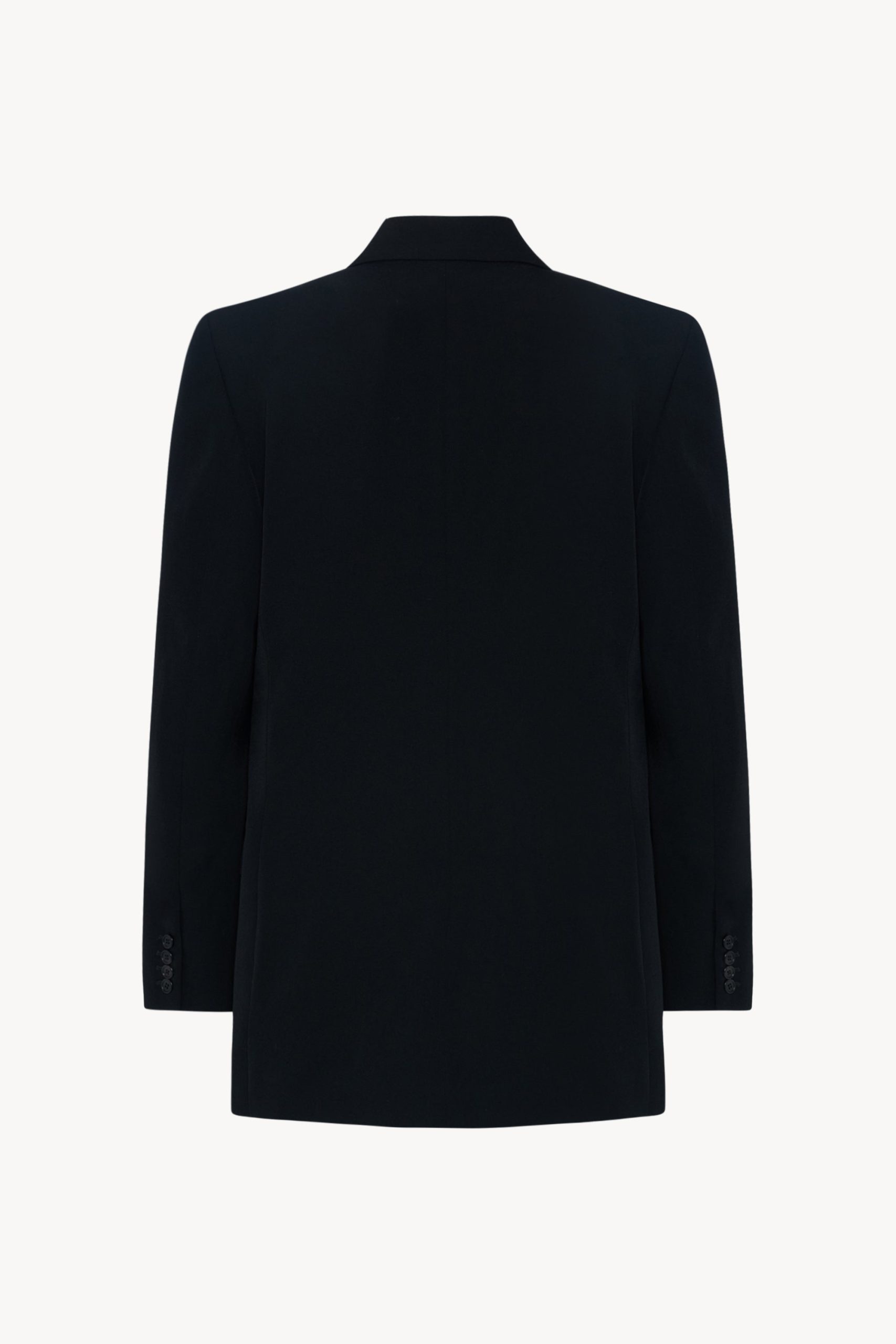 Tailored single-breasted jacket in soft Japanese wool gabardine with relaxed fit. notch lapel. front flap pockets. and open front.