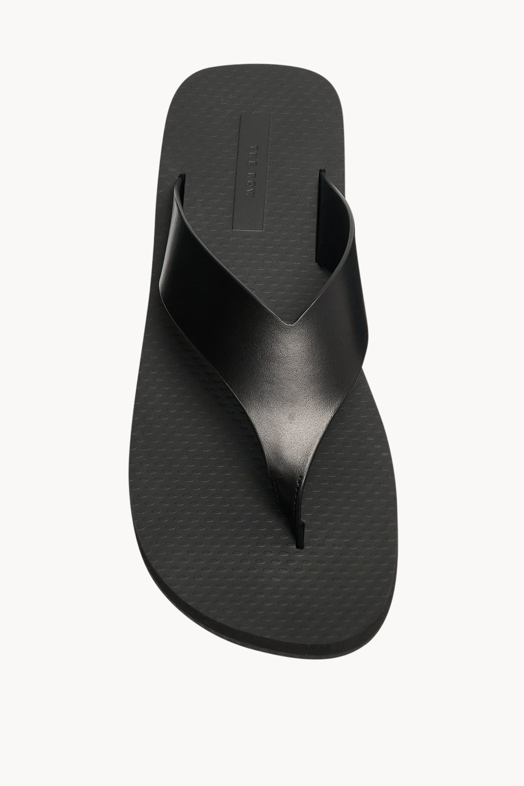 Modern flip flop sandal in sleek calfskin leather with seamless contoured strap. textured footbed. and lightly treaded rubber sole.