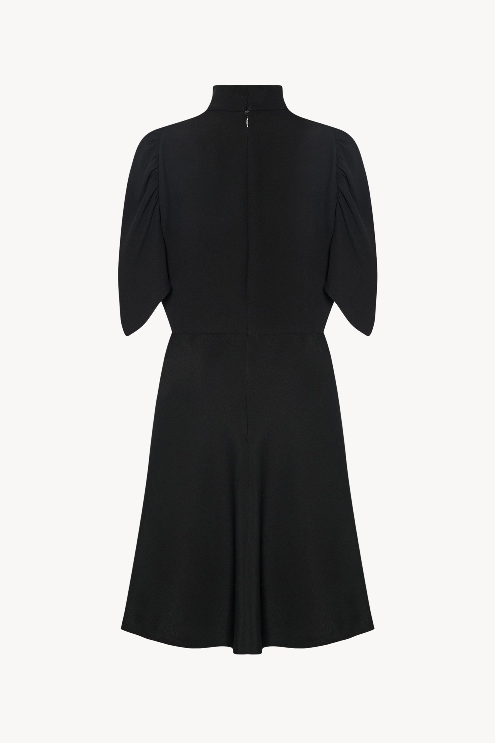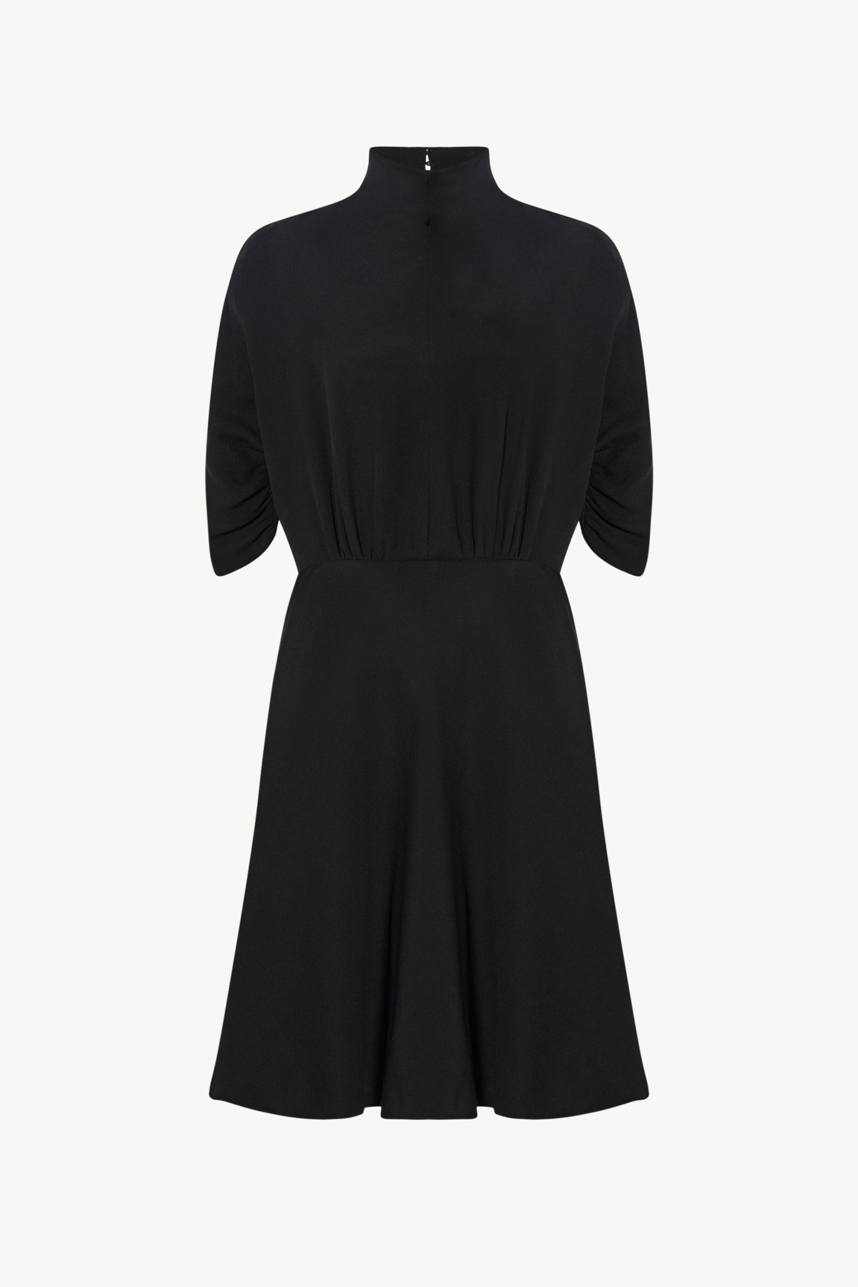 Flared calf-length dress in silk crepe cady with high funnel neckline. fitted waist. elbow-length dolman sleeves with gathered detailing. and concealed back zipper closure with hook & eye at neckline. Characterized by a distinctive pebbled surface and fluid drape. this fabric offers a soft. matte hand and refined feel.