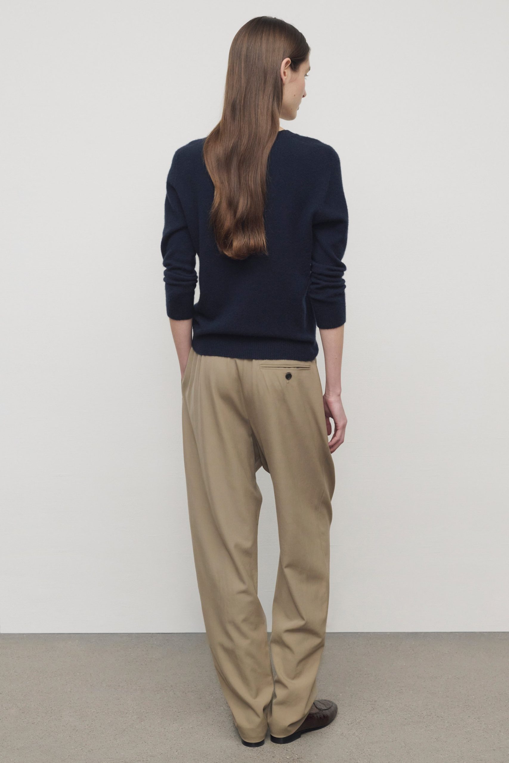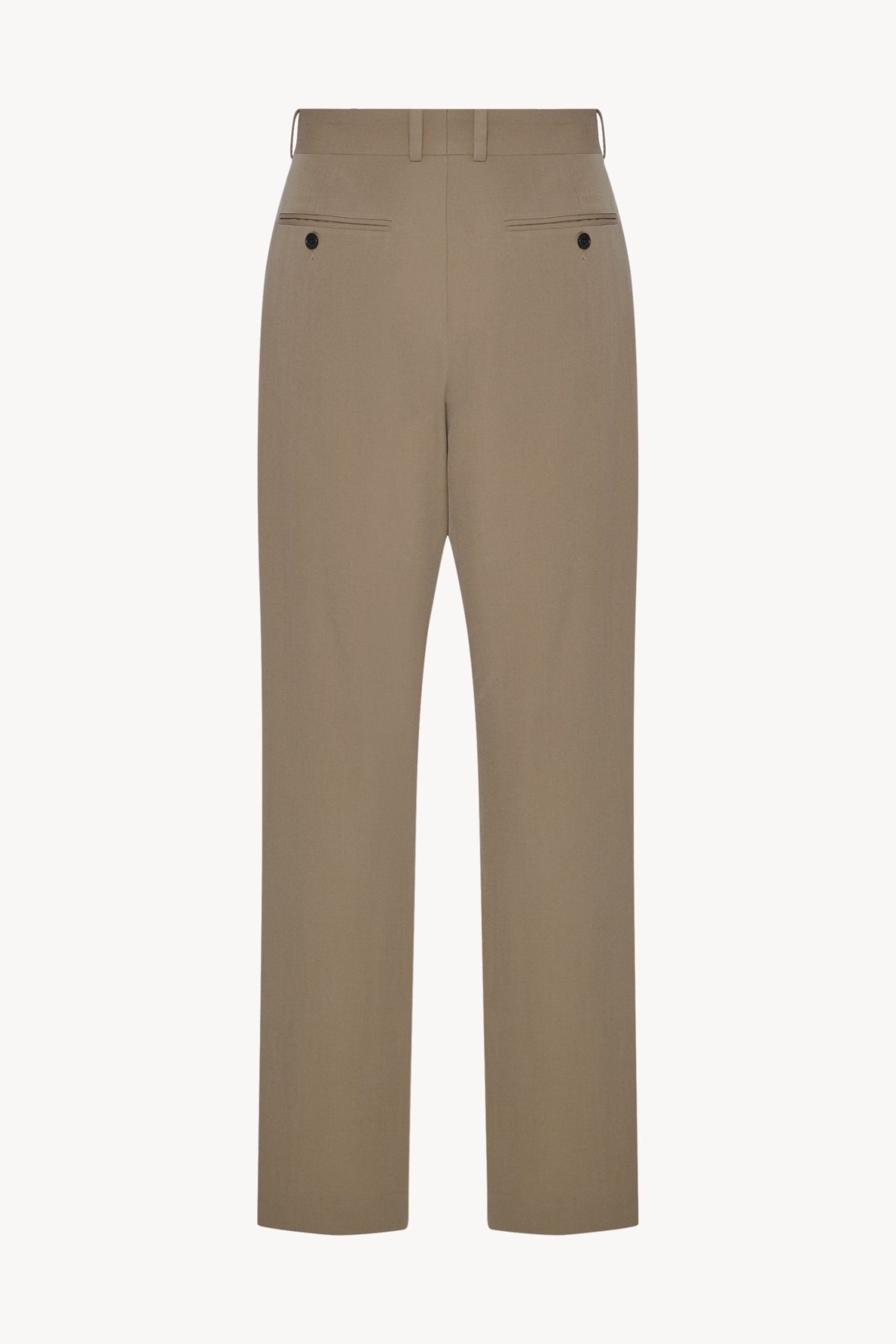 Tailored mid-rise trouser in soft Japanese wool gabardine with tapered leg. pressed front creases. and side seam pockets.