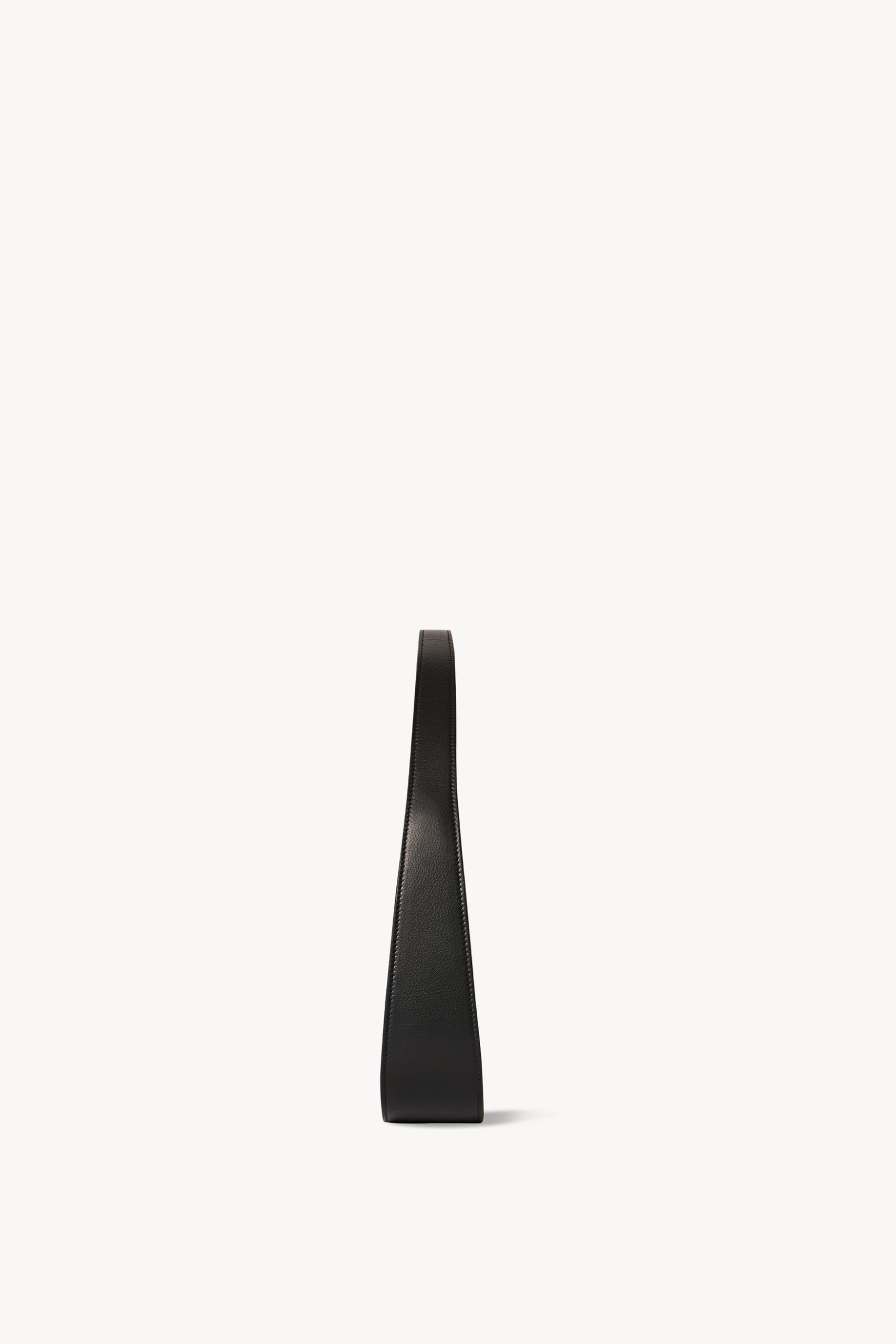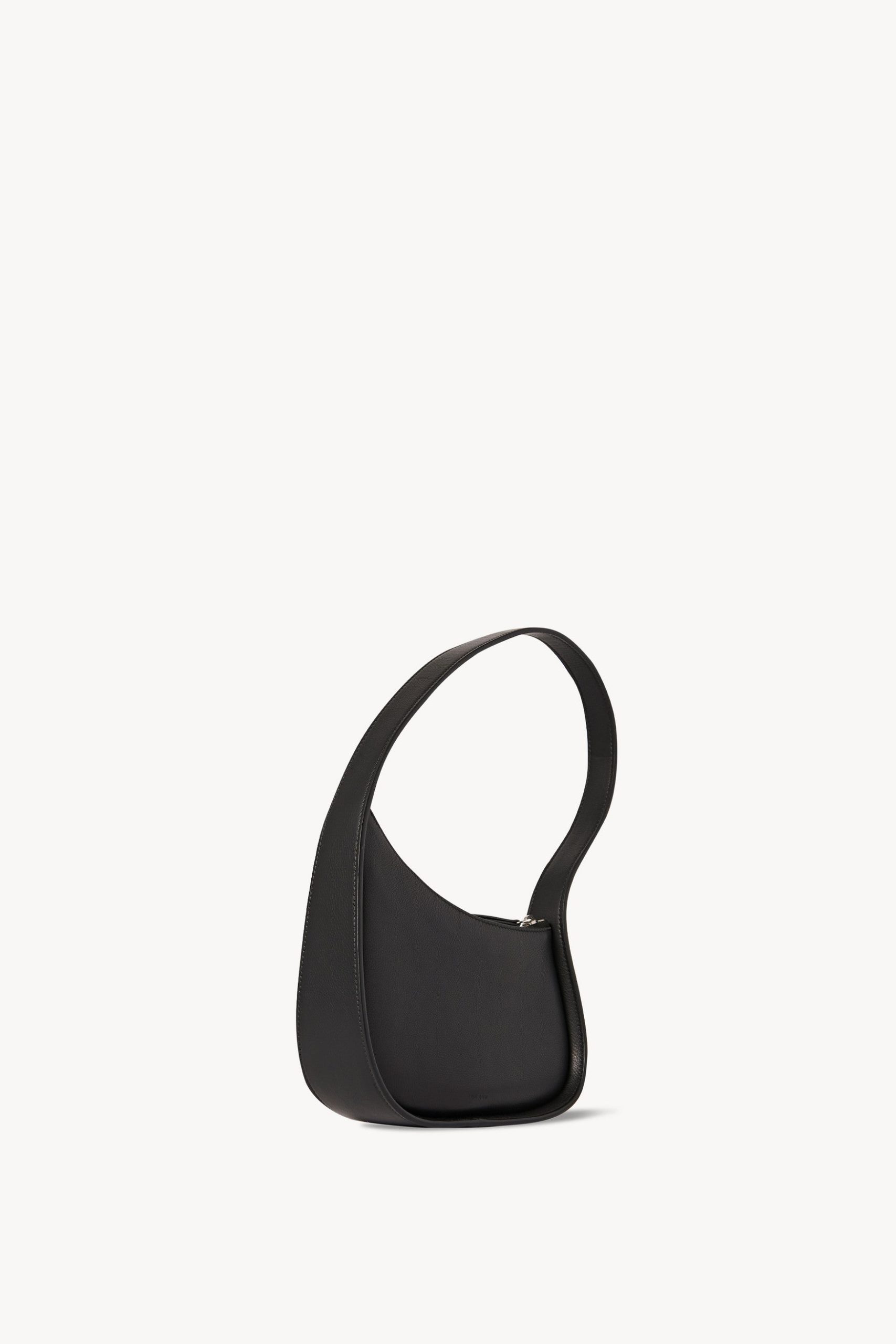Compact handbag in smooth calfskin leather with curved. sculptural silhouette. flat shoulder strap. and top zipper closure.