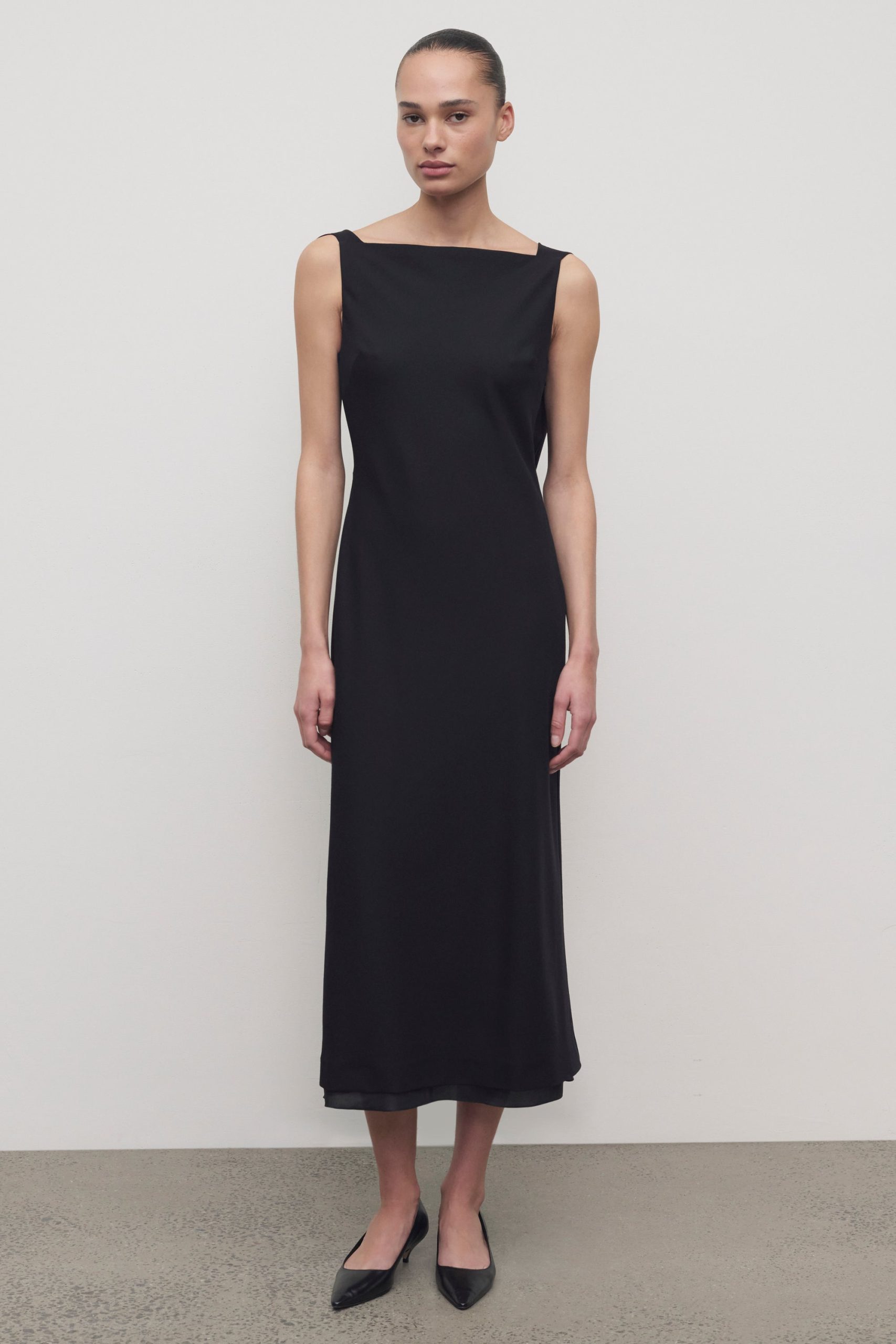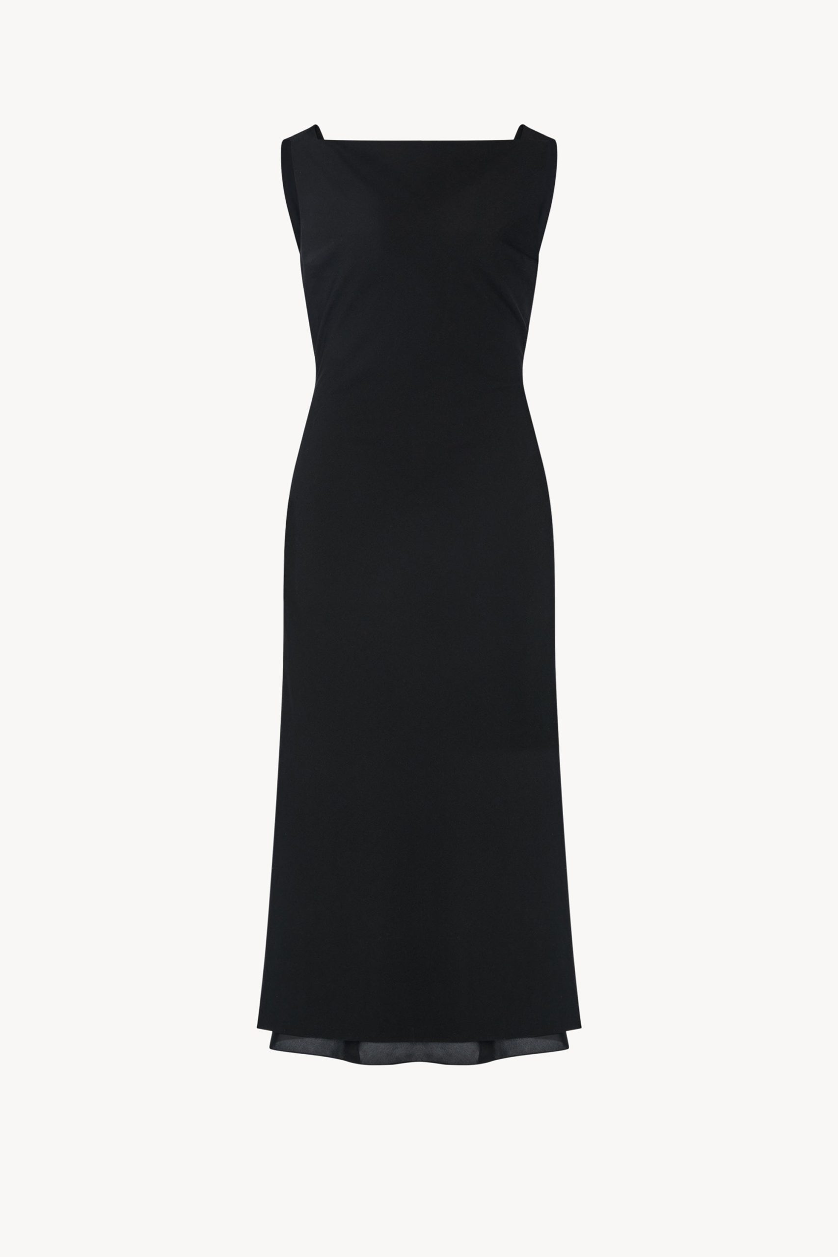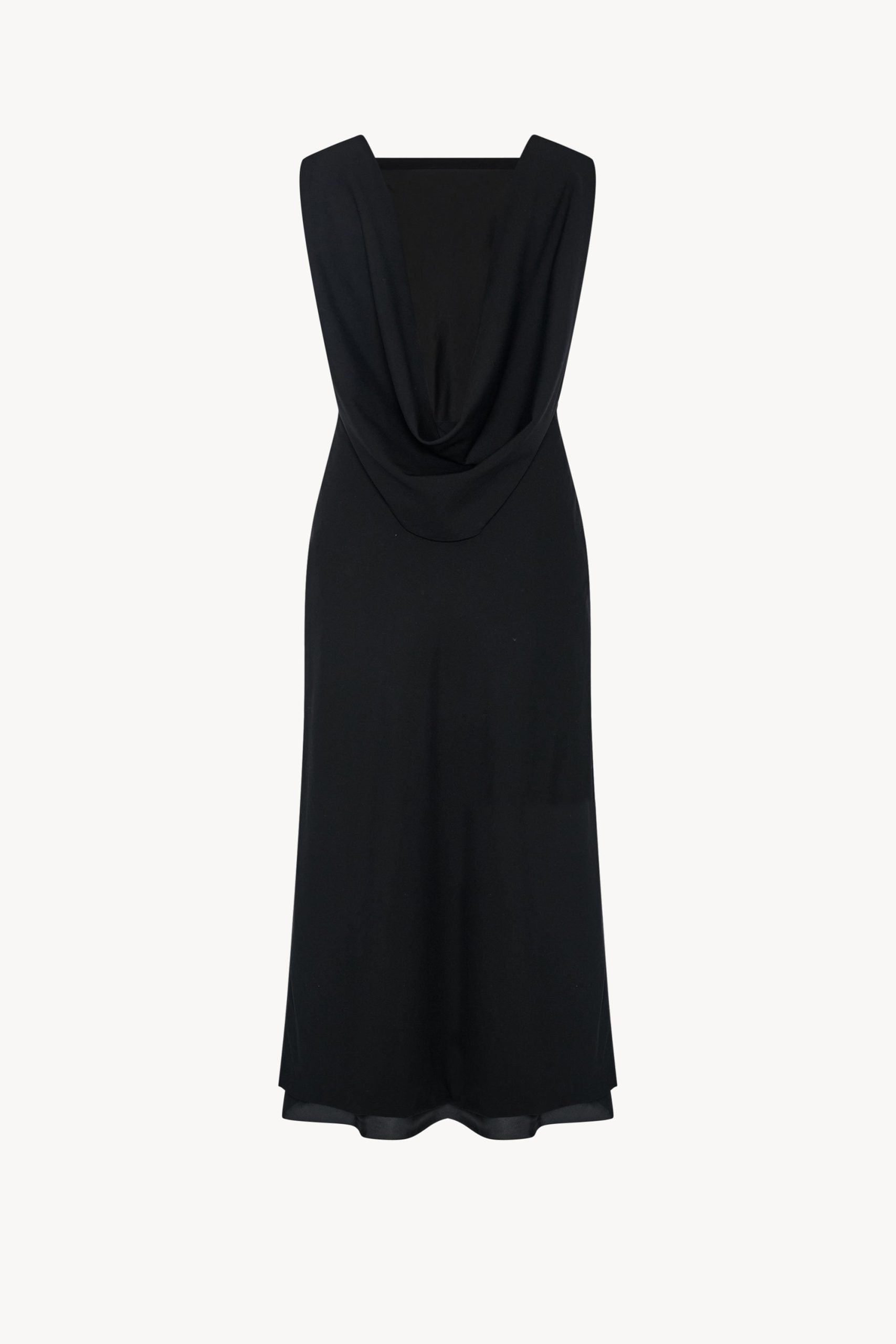 Calf-length dress in fluid lightweight wool with slightly fitted waist. squared front neckline. draped cowlneck at back. and concealed side zipper closure.