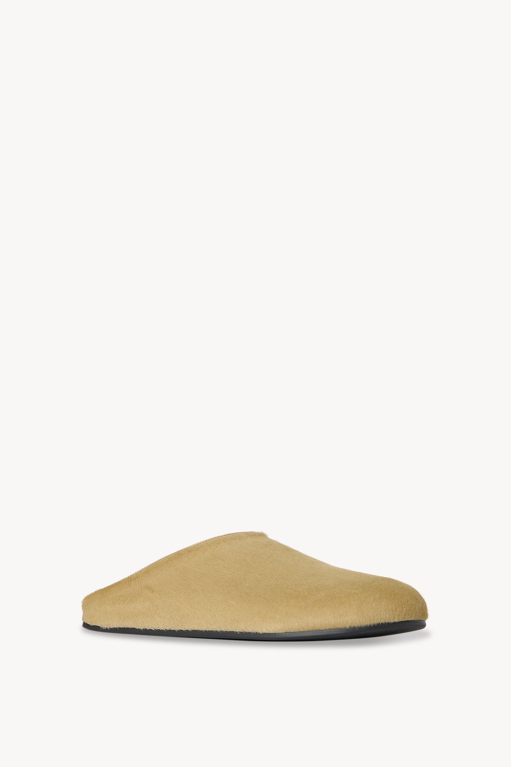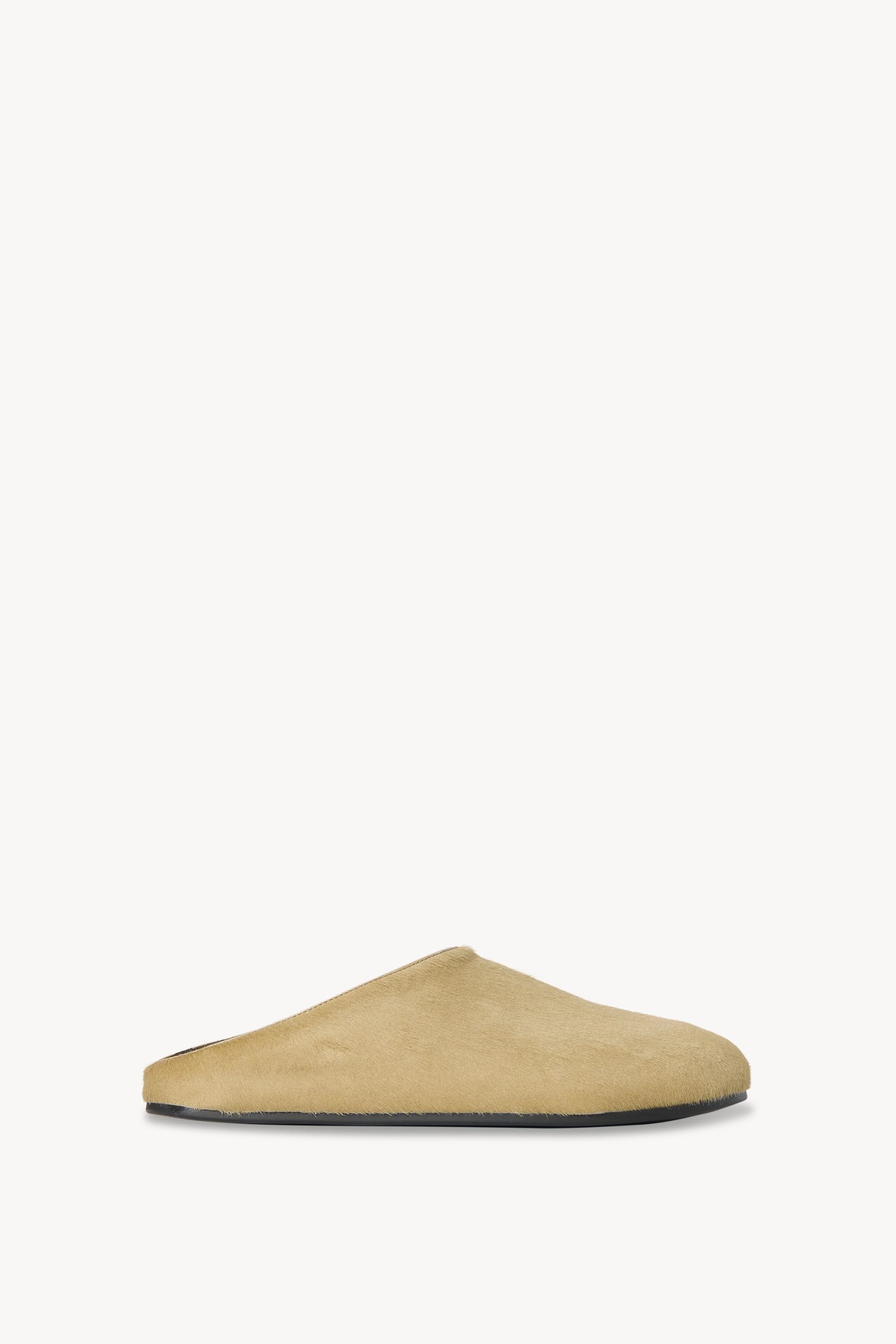 Relaxed slip-on shoe in textured pony hair leather with round toe. contoured footbed. and rubber sole.