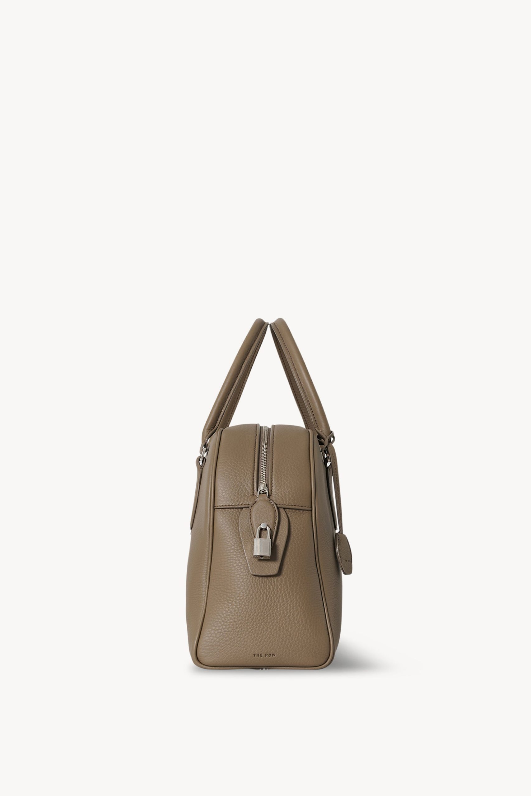 Updated bowling bag in textured calfskin leather with tubular handles. branded metal padlock and key. and zipper closure. Minimally finished. the natural grain surface is left intact. giving the leather a supple hand and refined texture that develops character over time.