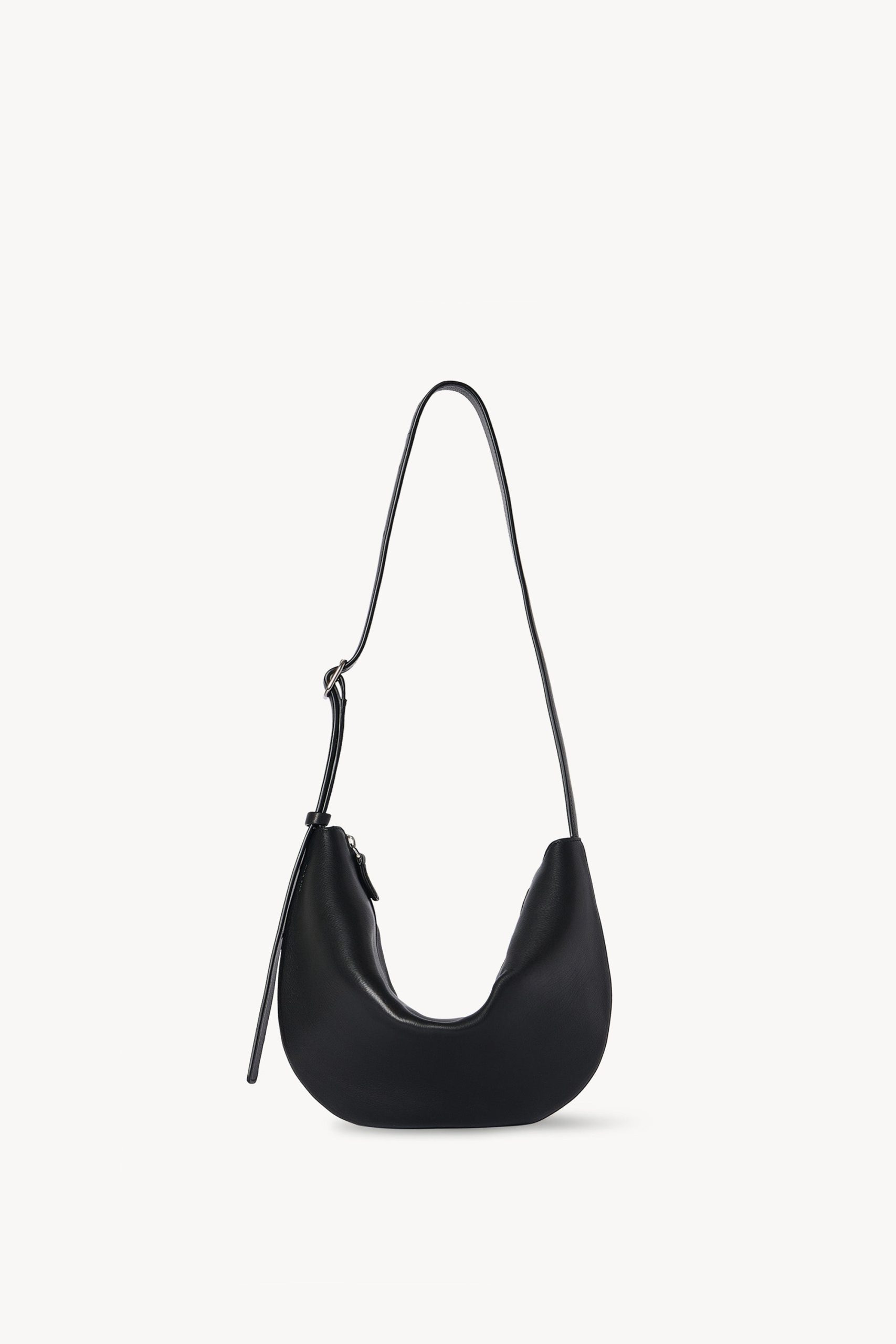 Crescent-shaped crossbody bag in finely grained calfskin leather with zipper closure and adjustable strap with metal buckle.