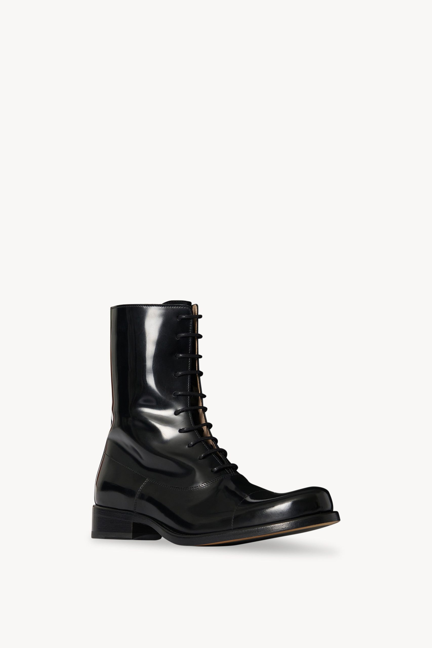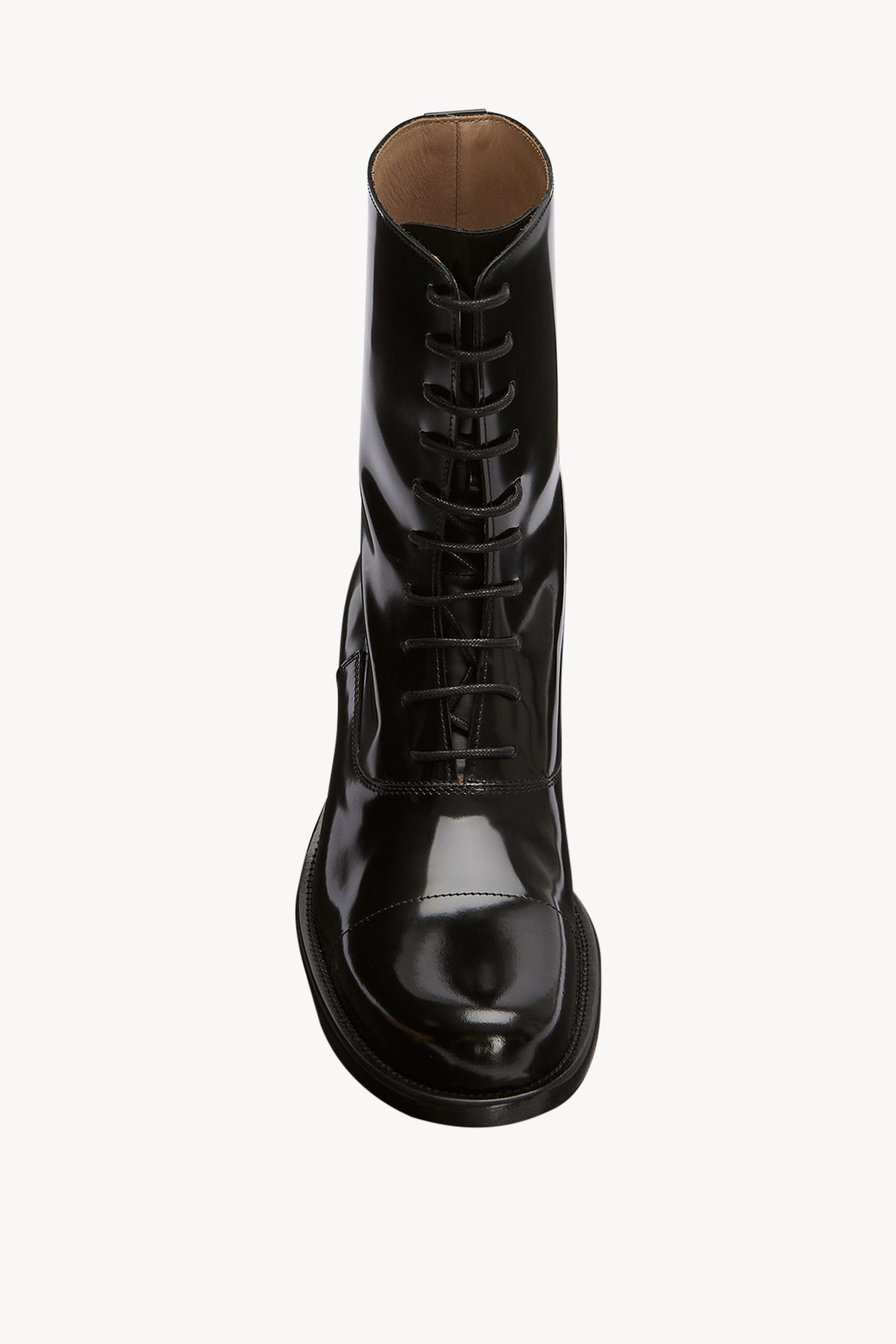 Lace-up ankle boot in glossy calfskin leather with elongated round toe. extended leather sole. and stacked leather heel.