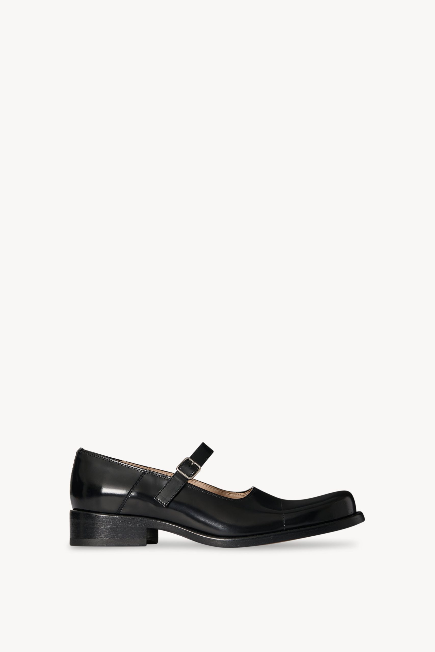Structured Mary Jane shoe in glossy calfskin leather with elongated round toe. extended leather sole. and stacked leather heel.