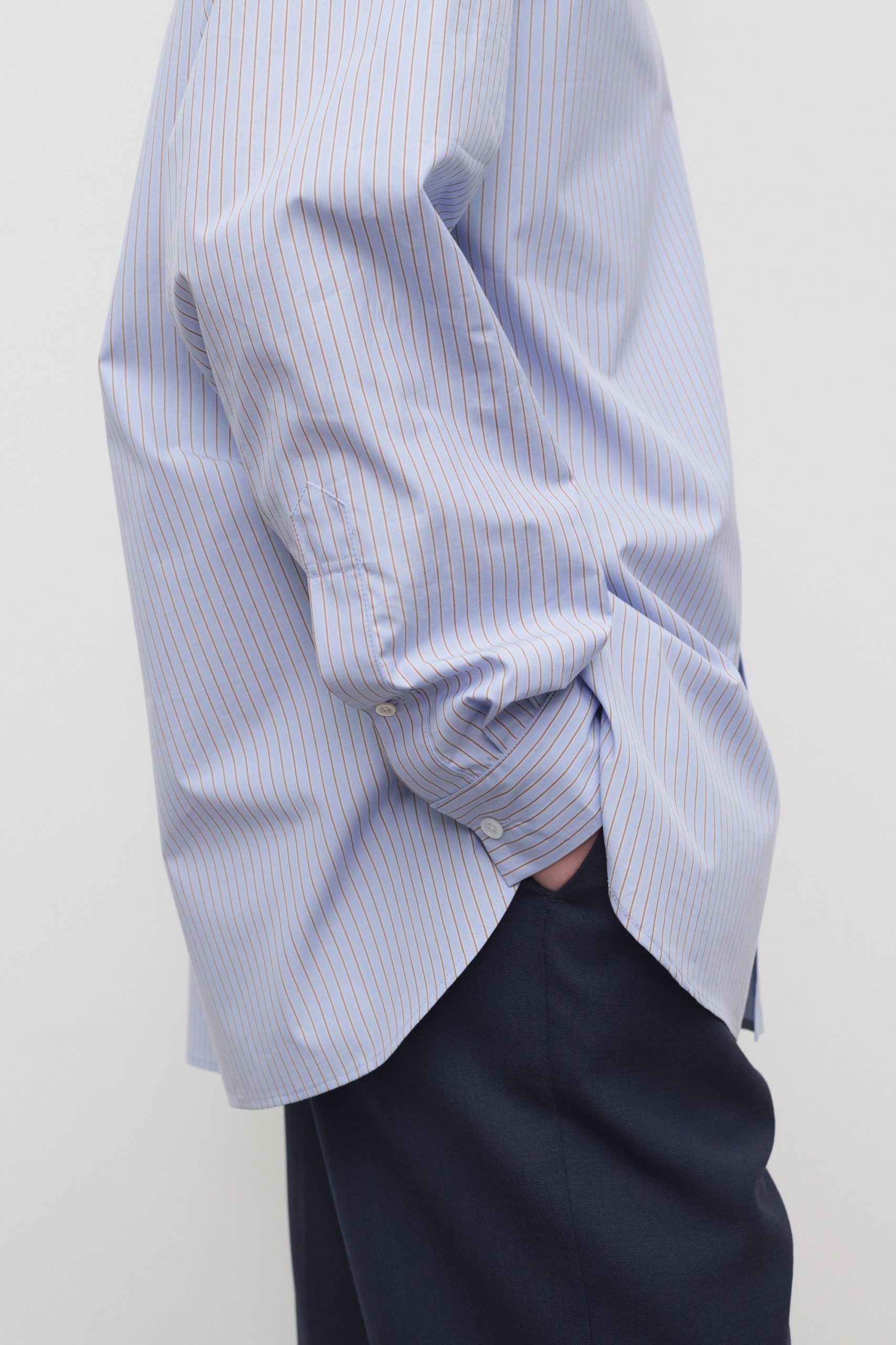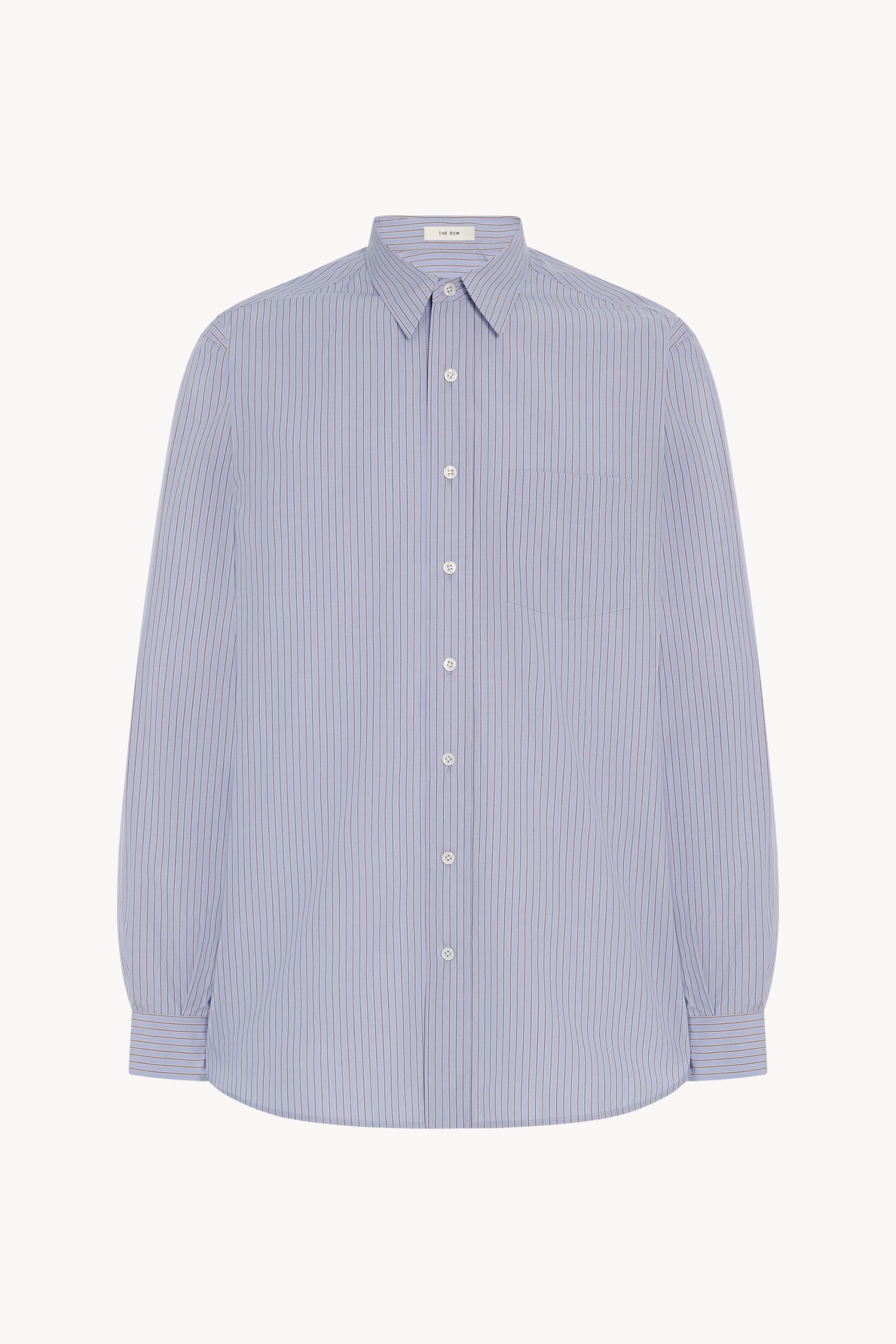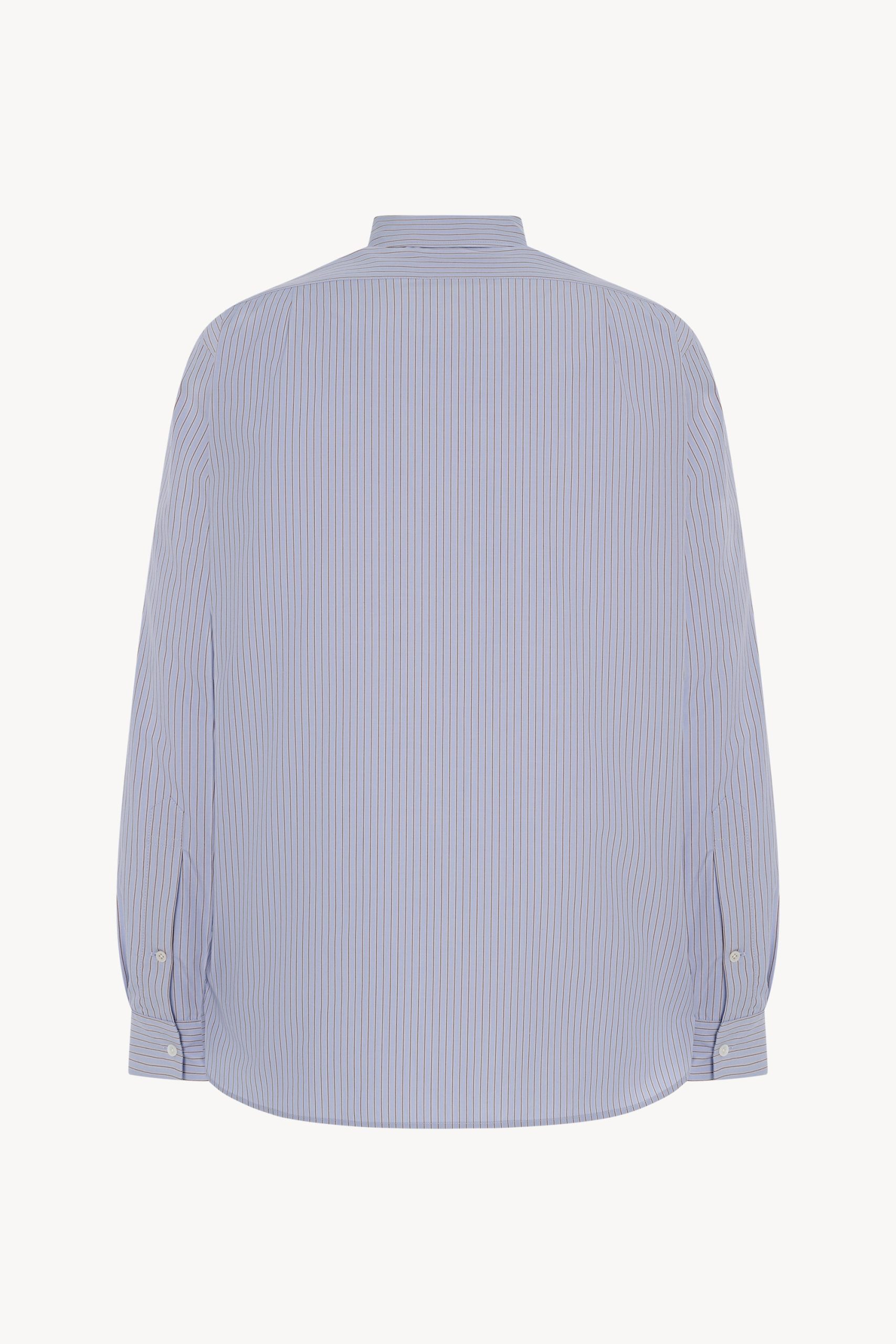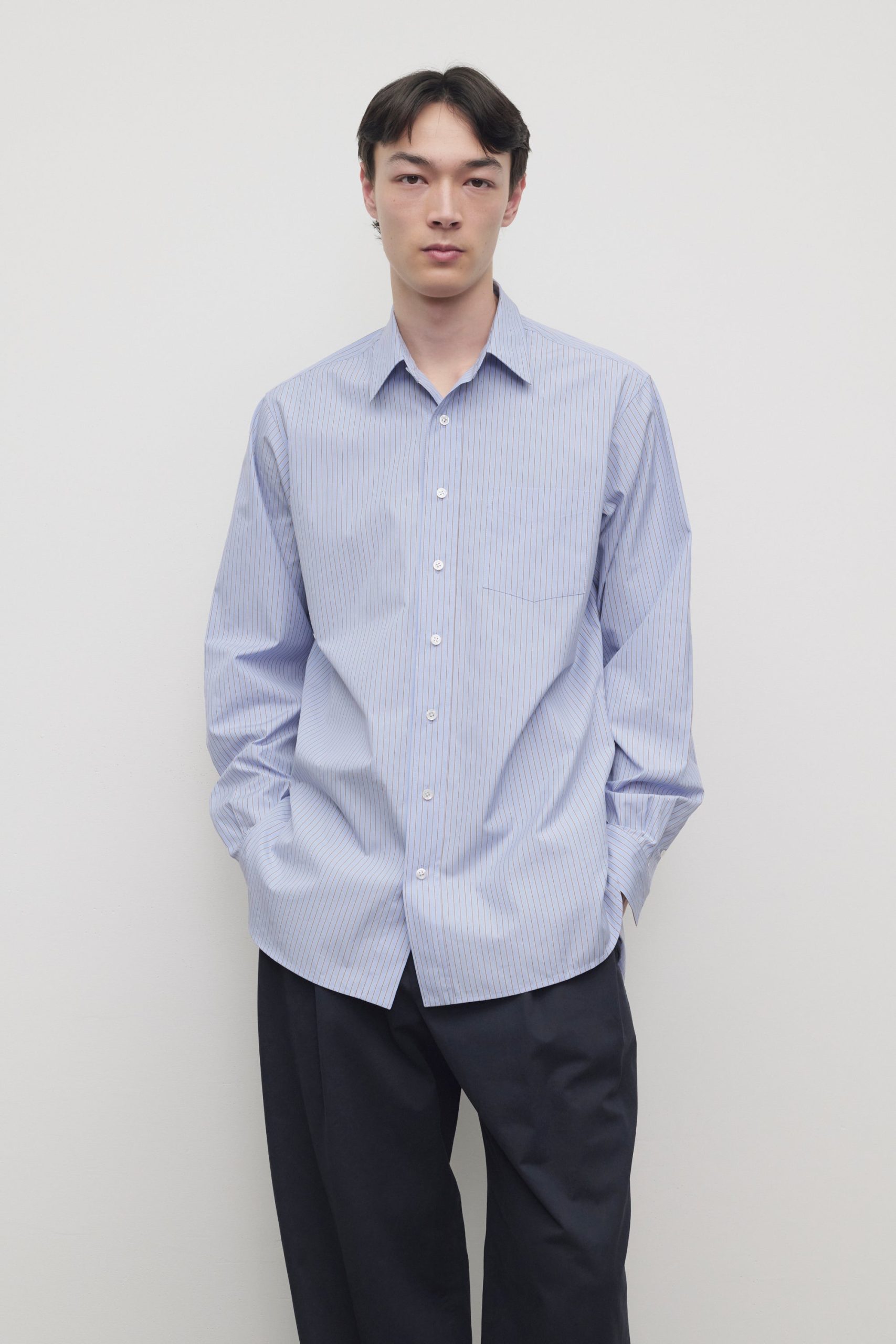 Relaxed button-up shirt in striped organic cotton poplin with front patch pocket. curved hem. and exposed front placket with mother-of-pearl buttons.