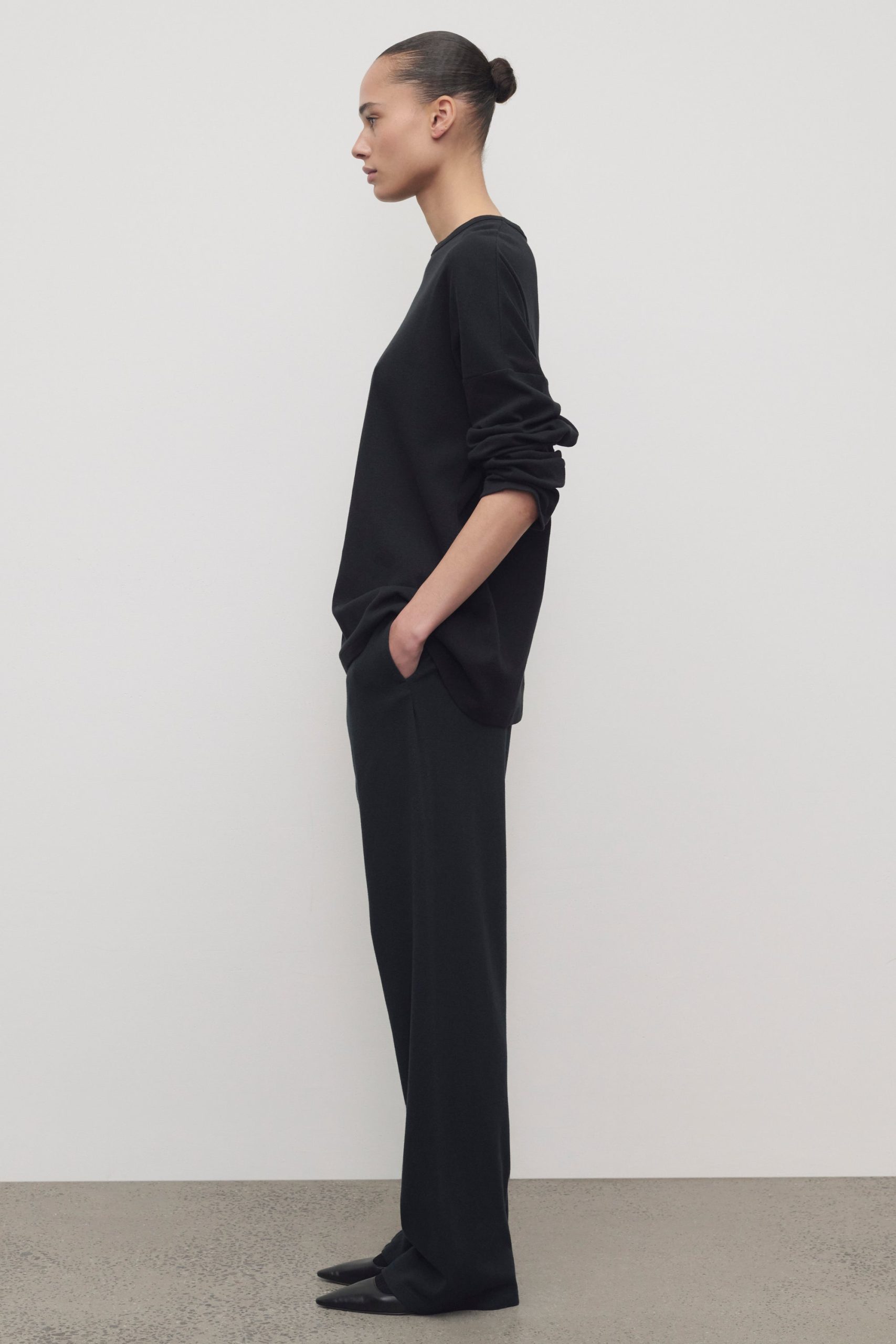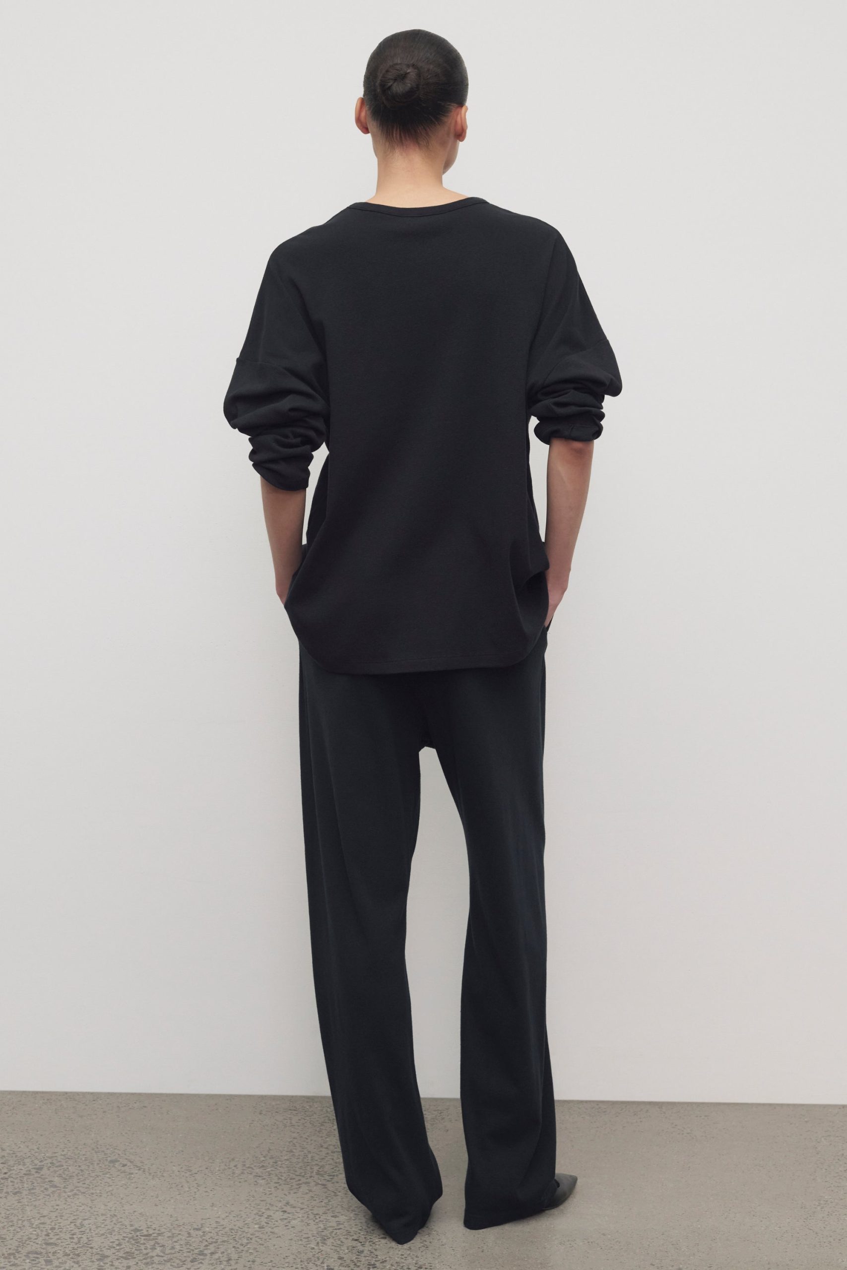 Relaxed low-rise sweatpant in ultrasoft Japanese cotton jersey with straight leg. elastic drawstring waist. and side slash pockets.