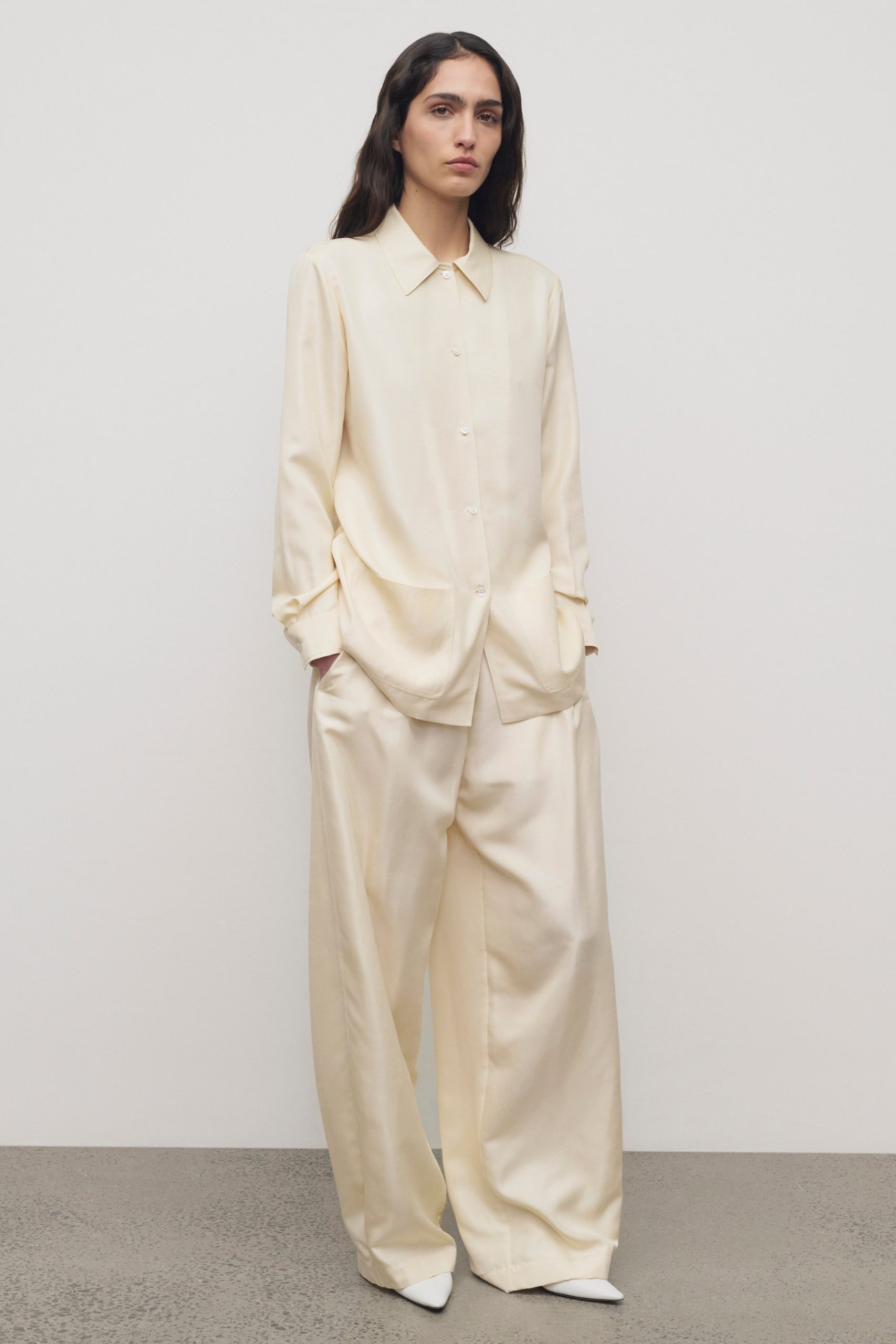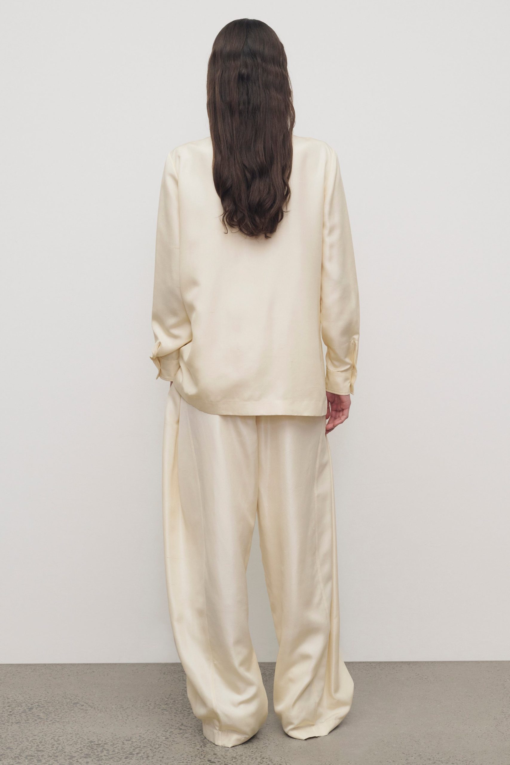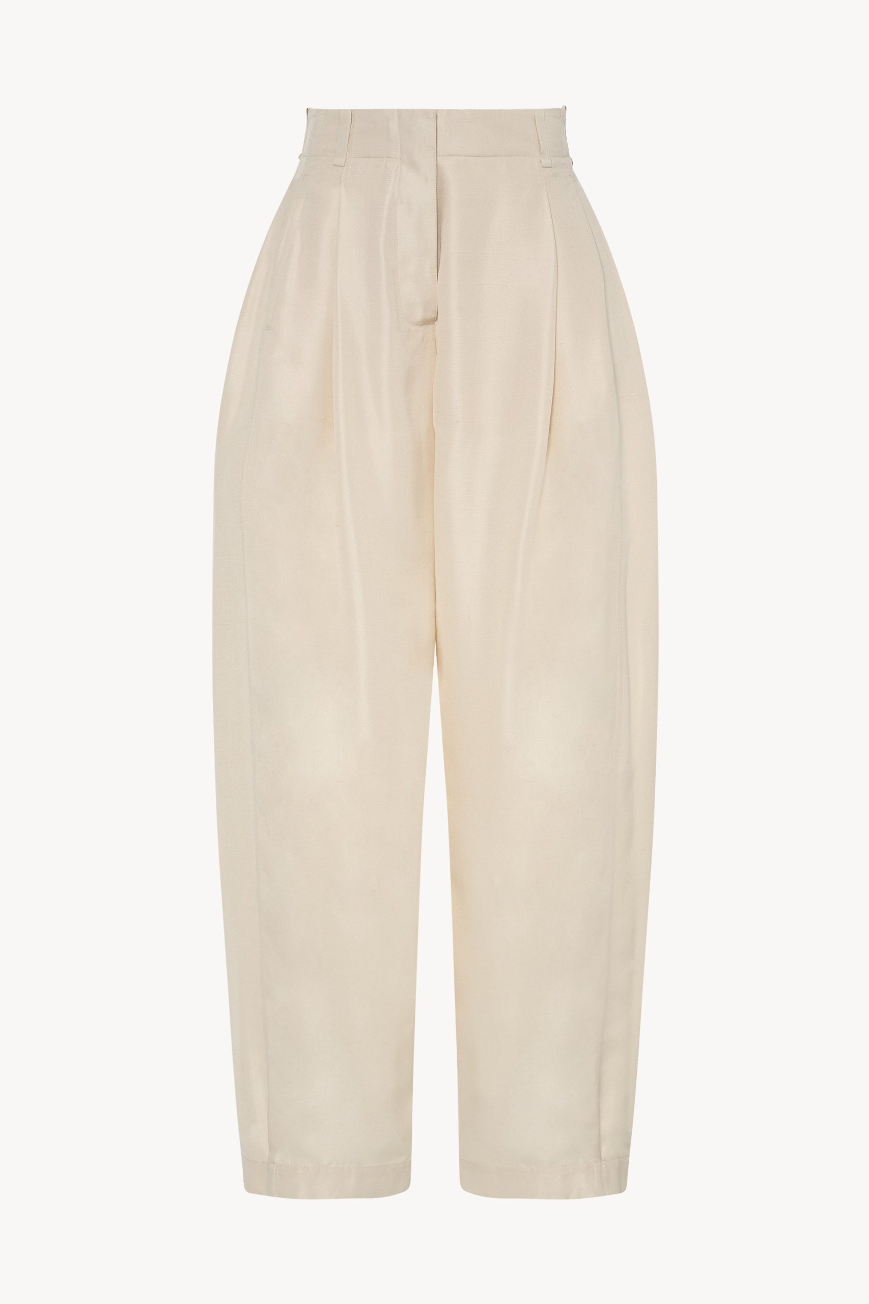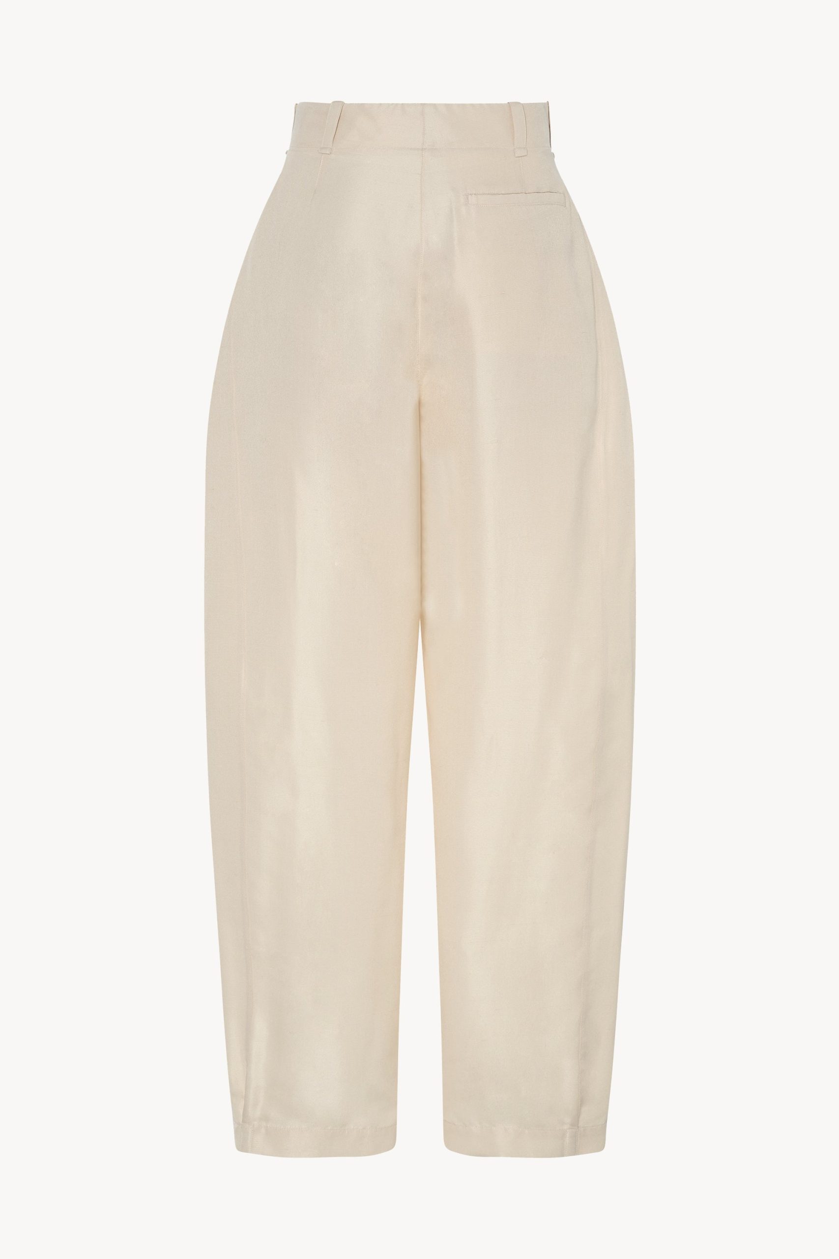 Tailored high-rise pant in richly textured silk shantung with barrel leg. double front pleats. and front seam pockets.