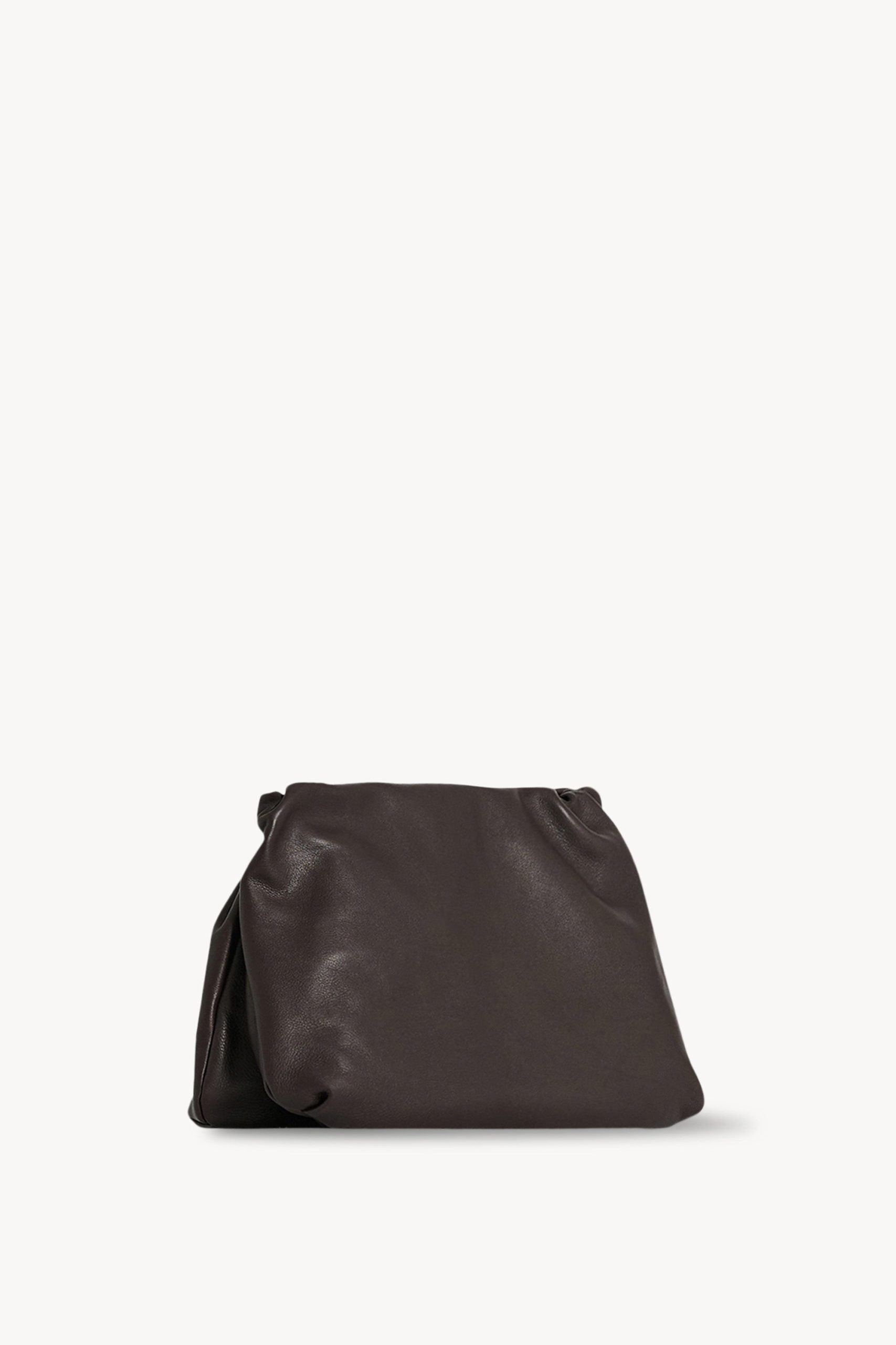 Ruched clutch in finely grained calfskin leather with hidden adjustable shoulder strap and hinged frame closure. Characterized by a buttery-soft hand and subtle sheen. the leather offers a supple texture and refined finish.