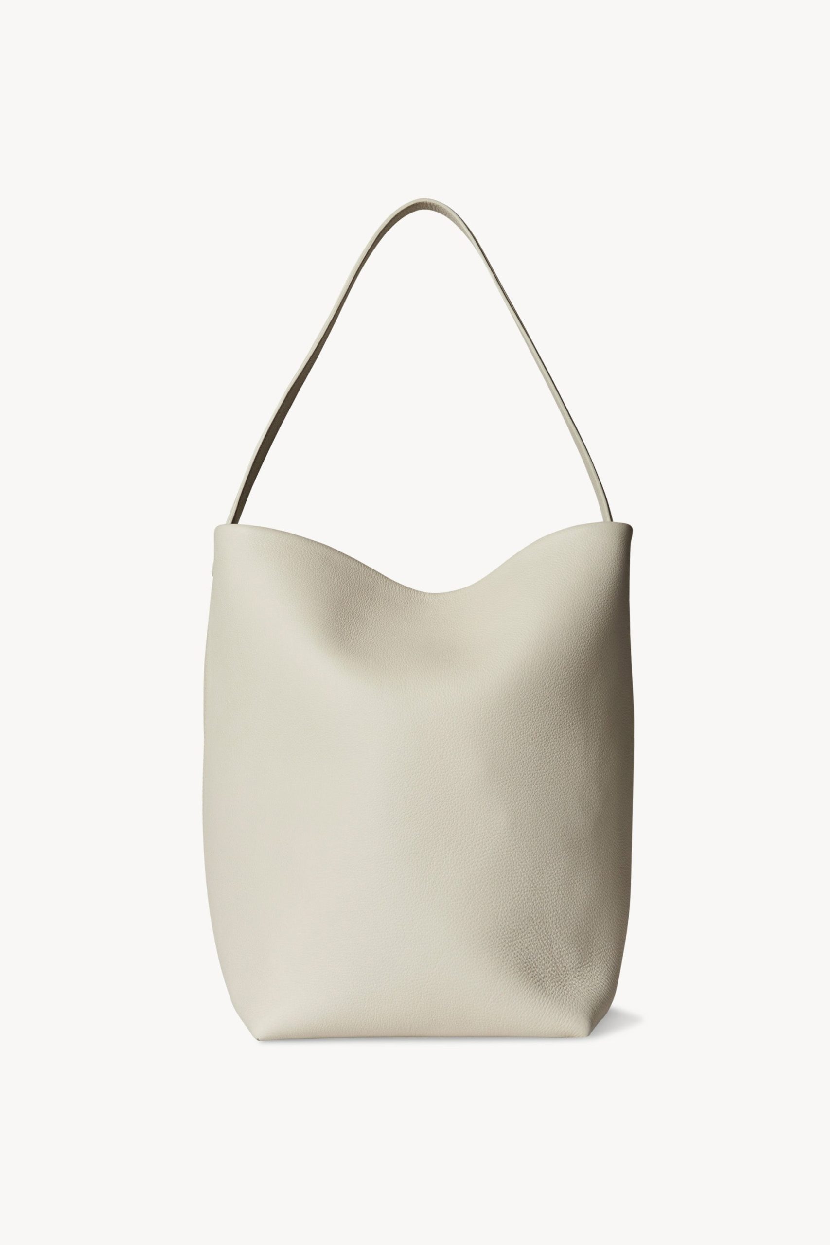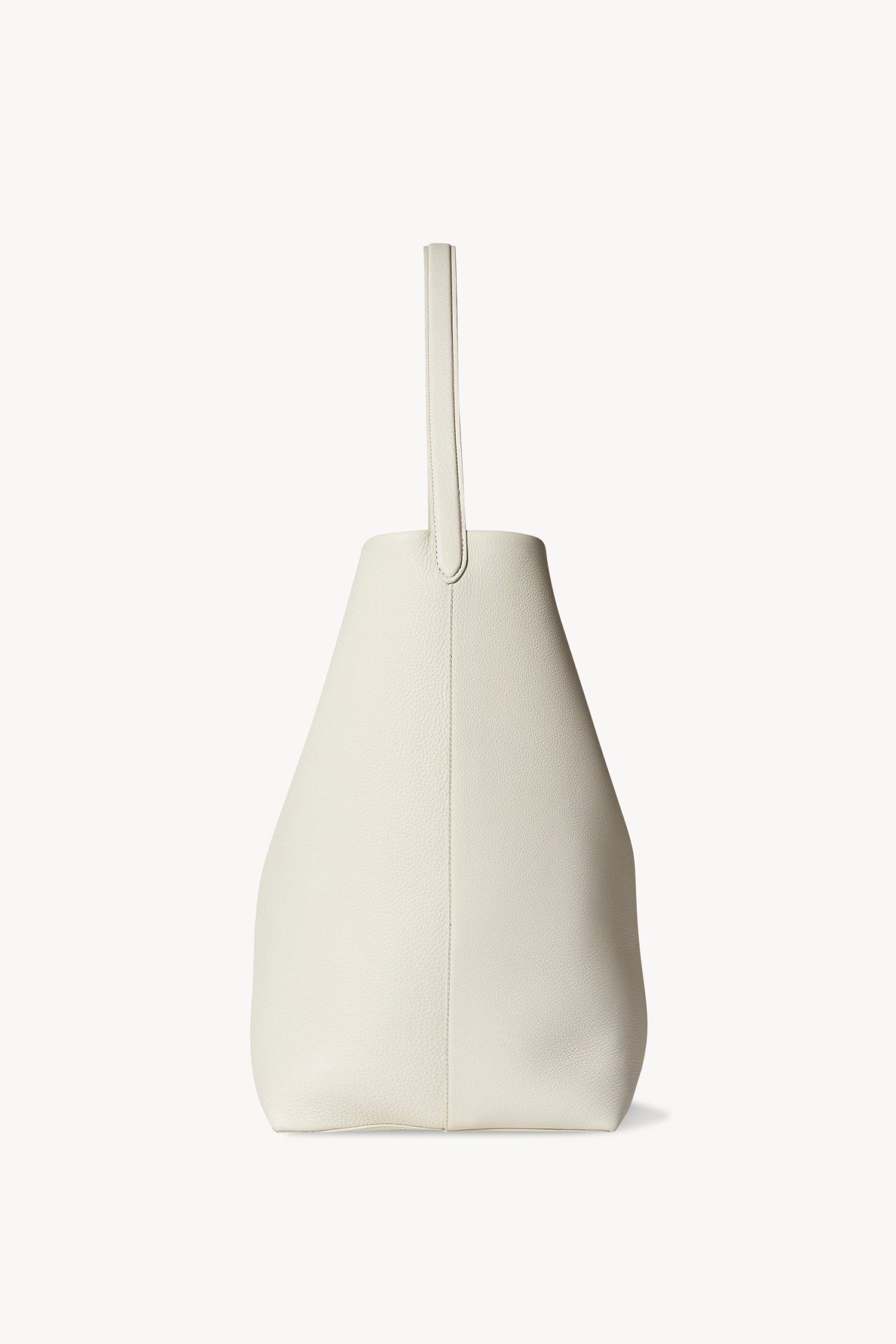 Classic tote bag in grained calfskin leather with interior tie closure and flat handle.