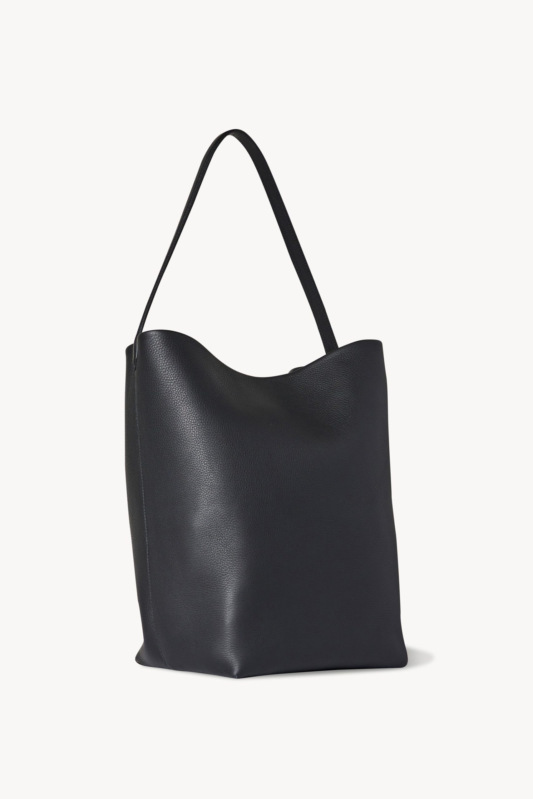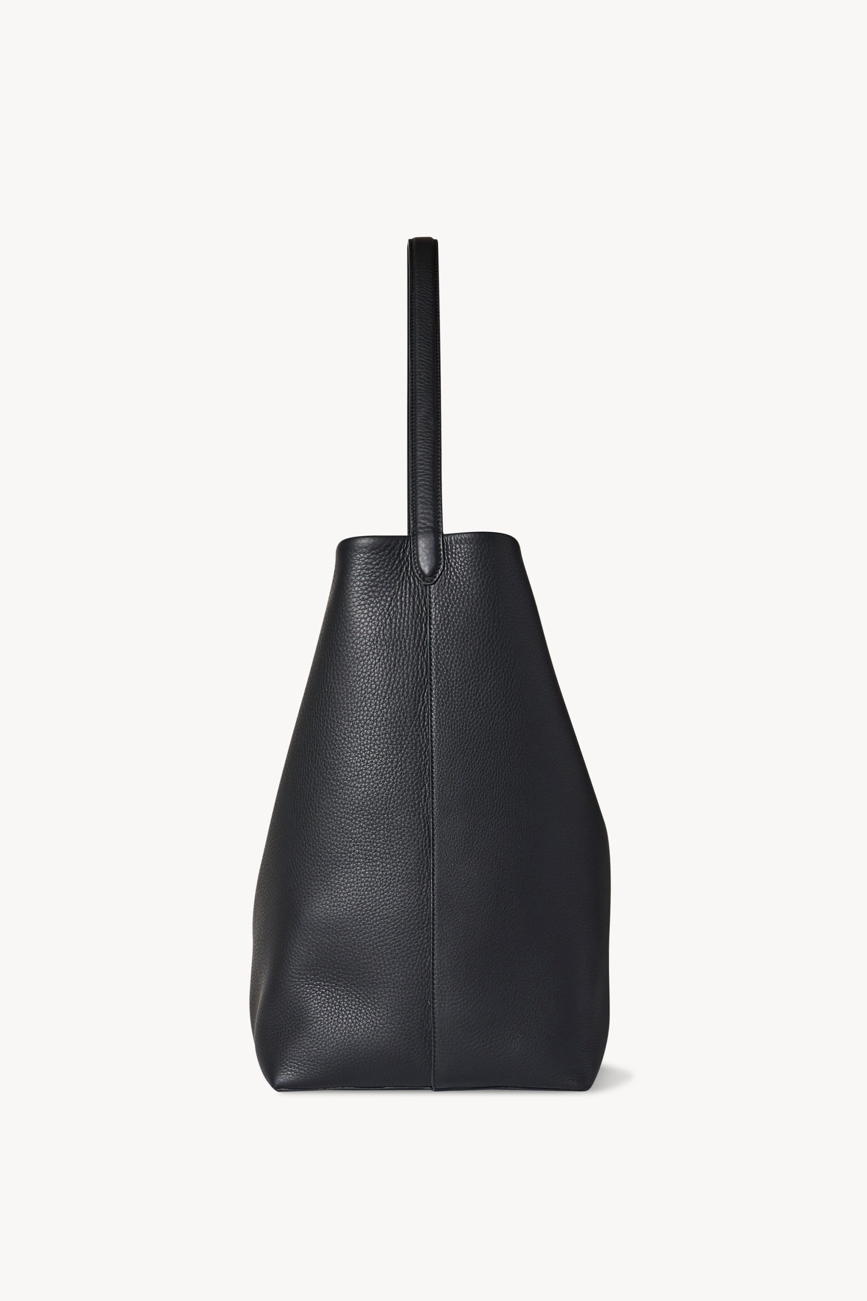 Classic tote bag in grained calfskin leather with softly squared base. slim top handle. and interior leather tie closure.