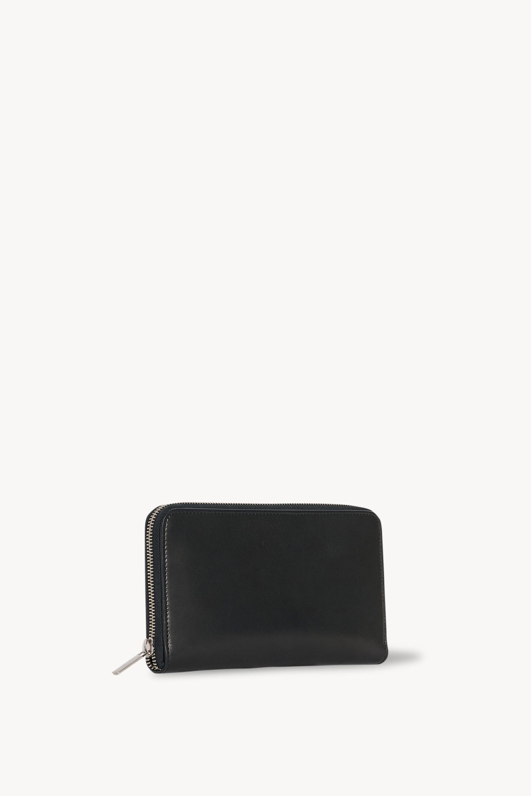 Rectangular wallet in smooth nappa leather with gusseted side panels. interior card slots. and zipper closure.