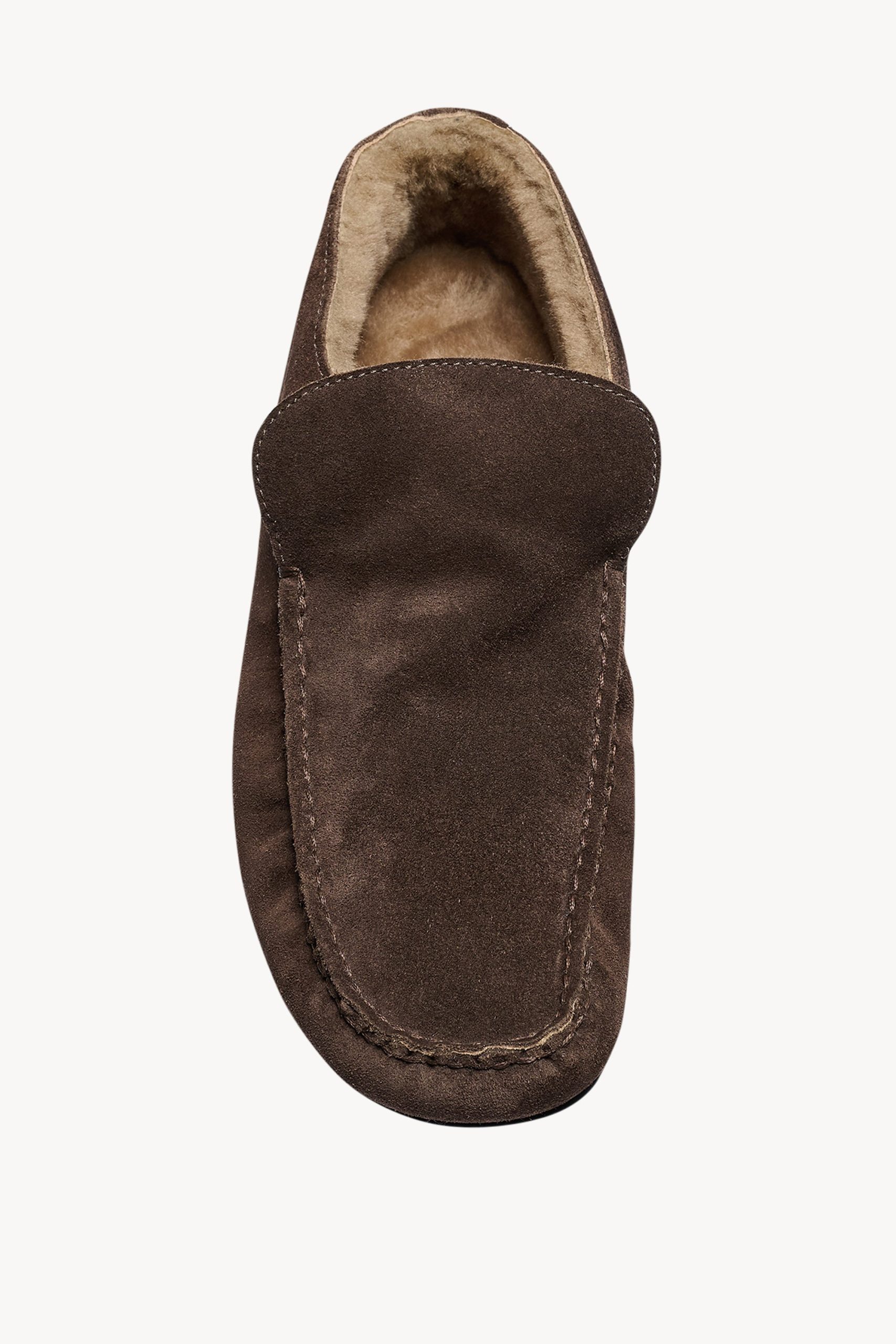Refined car shoe in soft calfskin suede with gently squared toe. soft shearling lining. and flexible rubber sole.