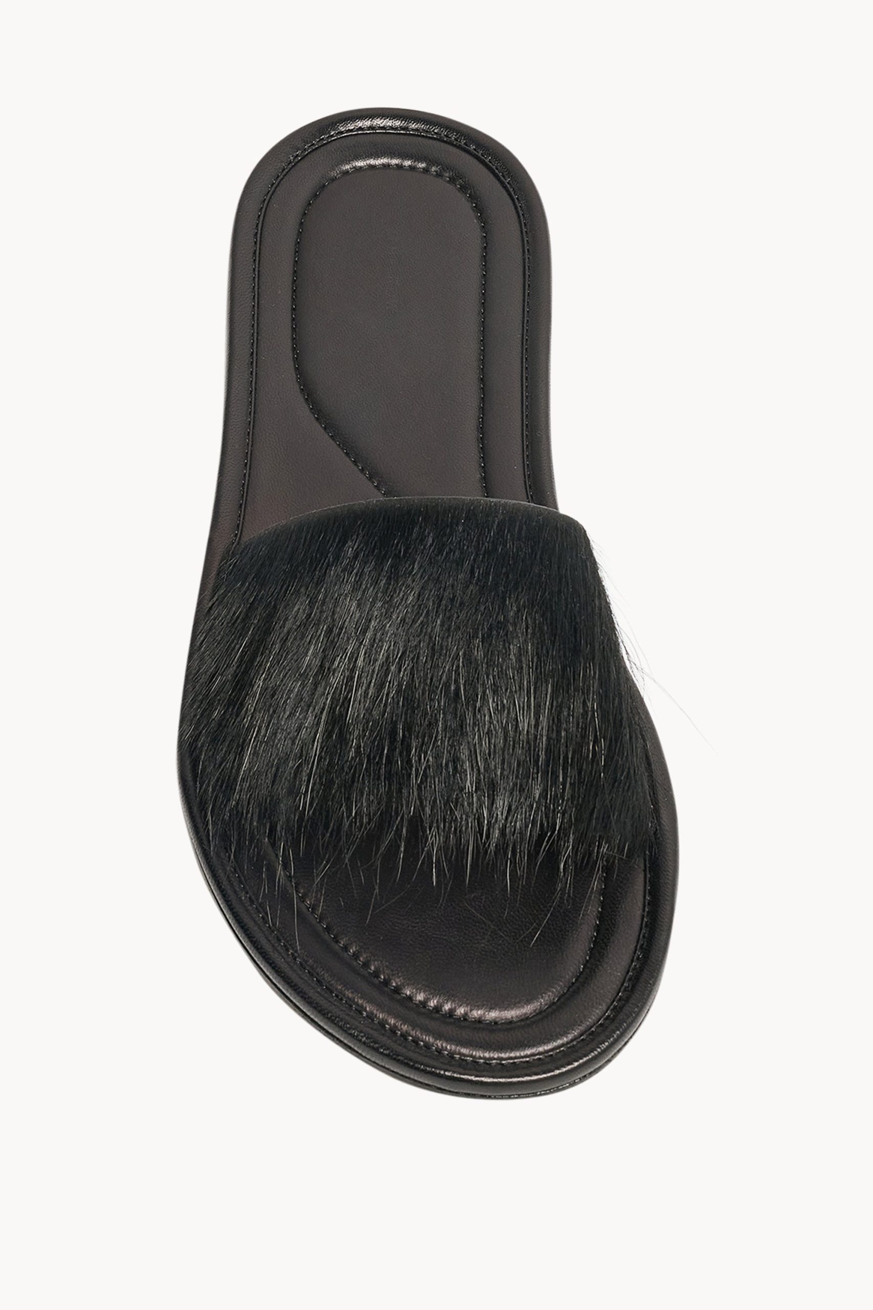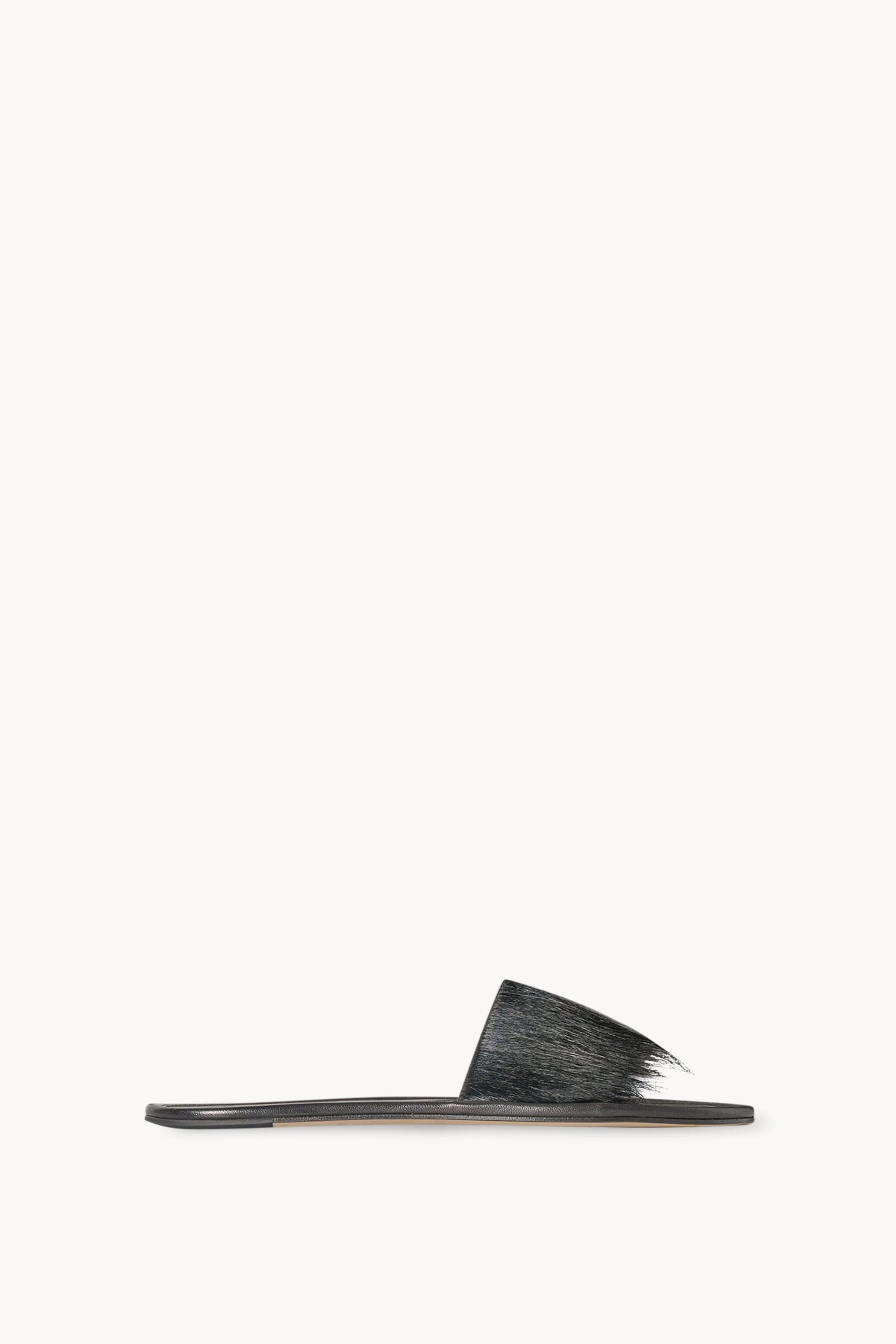 Slide sandal in textured calf hair leather with wide toe strap. padded footbed. and leather sole.