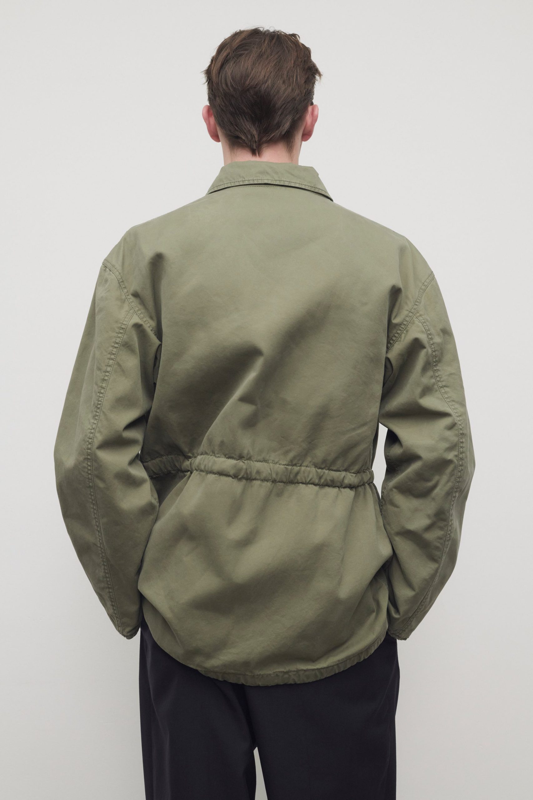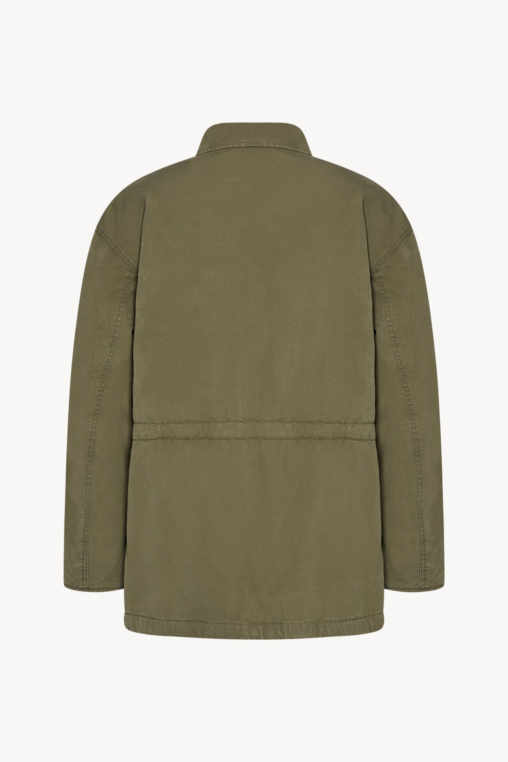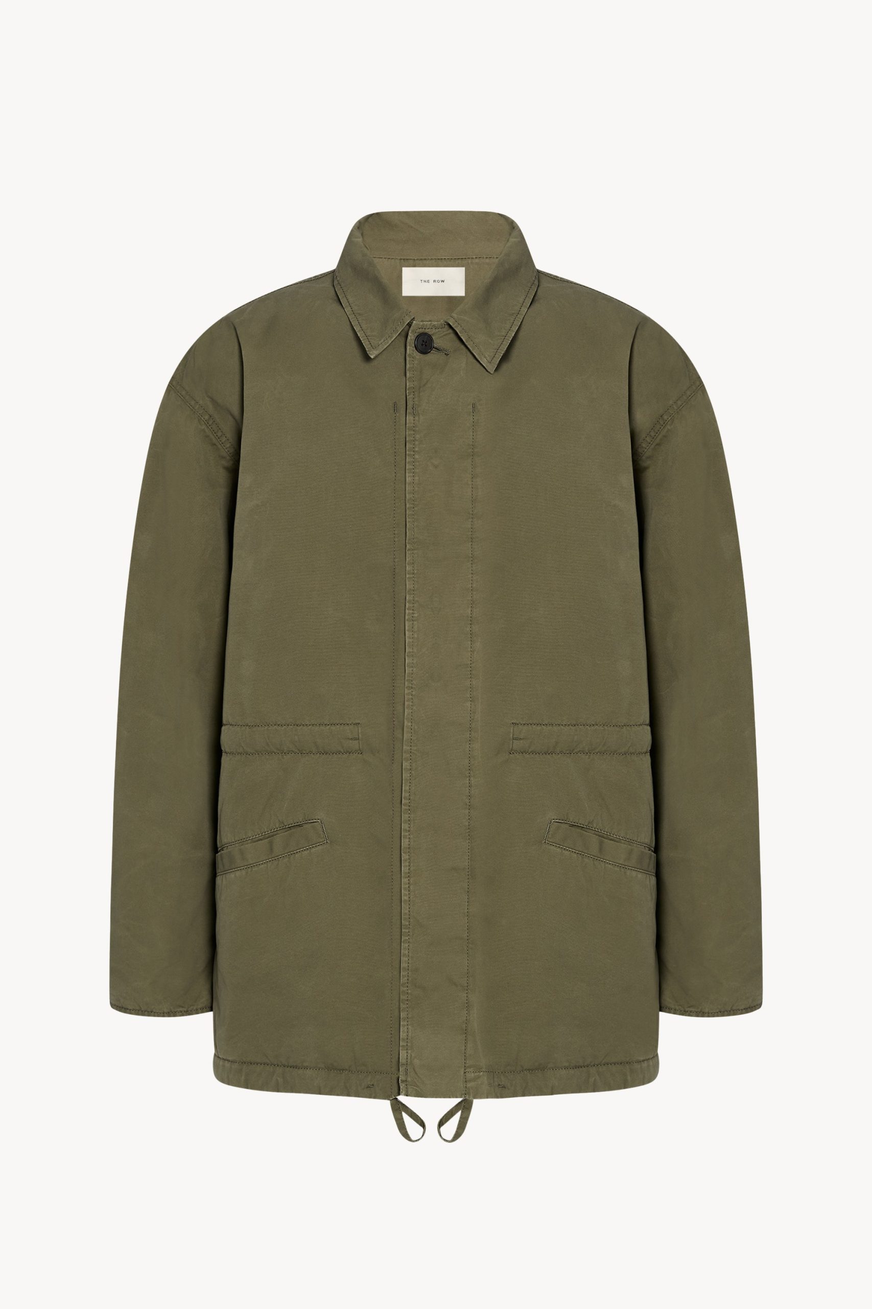 Collared field jacket in weatherized cotton canvas with slant welt pockets. interior drawstring funnel at waist and hem. and concealed front placket with button closure.