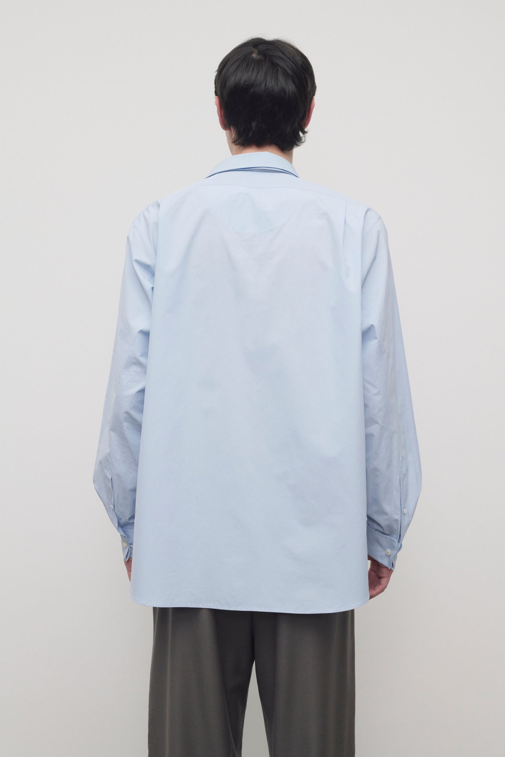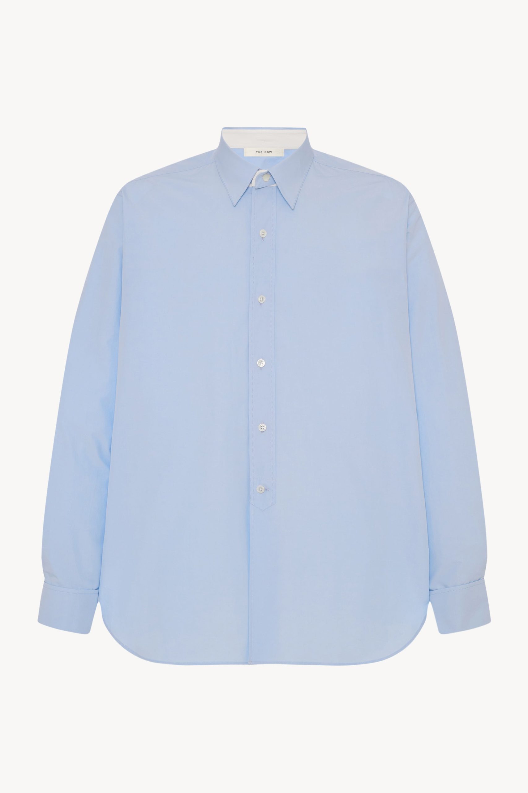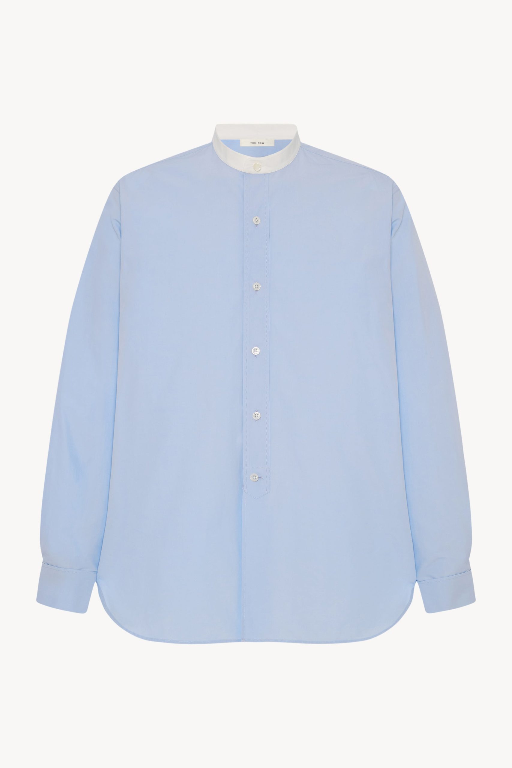 Boxy button-up shirt in crisp cotton poplin with curved hem. detachable collar with interior contrast collar stand. and exposed front placket with mother-of-pearl buttons.