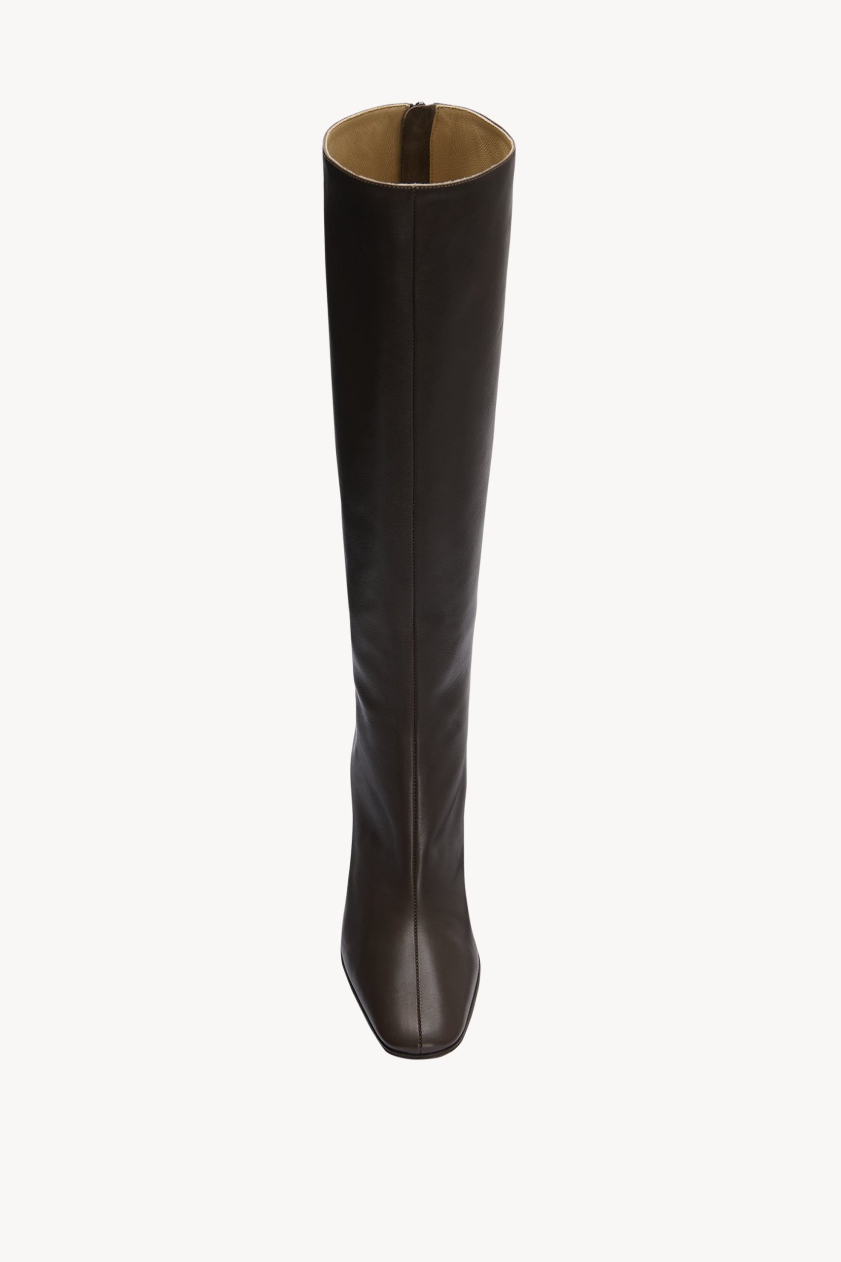 Heeled knee-high ankle boot in matte calfskin leather with tapered toe. center back zip closure. and slightly curved leather heel.