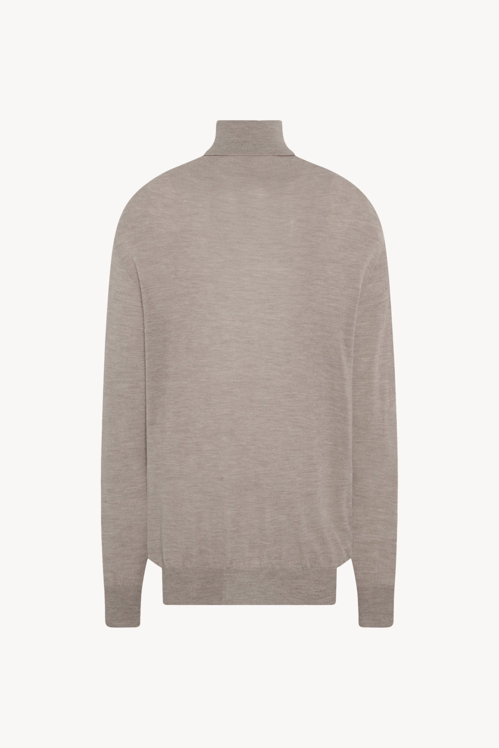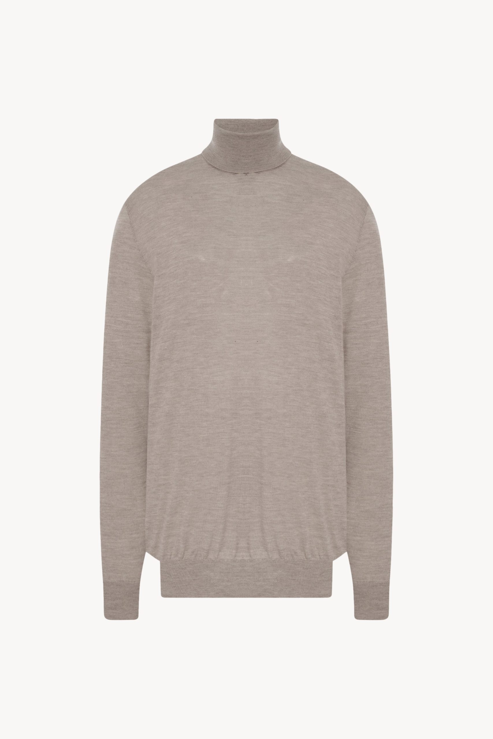 Long-sleeved turtleneck top in featherlight worsted cashmere with elongated oversized fit. folded neckline. and ribbed collar. cuffs. and hem. With an exceptionally fine structure and soft hand. the pure cashmere knit is ideal for seasonless layering.
