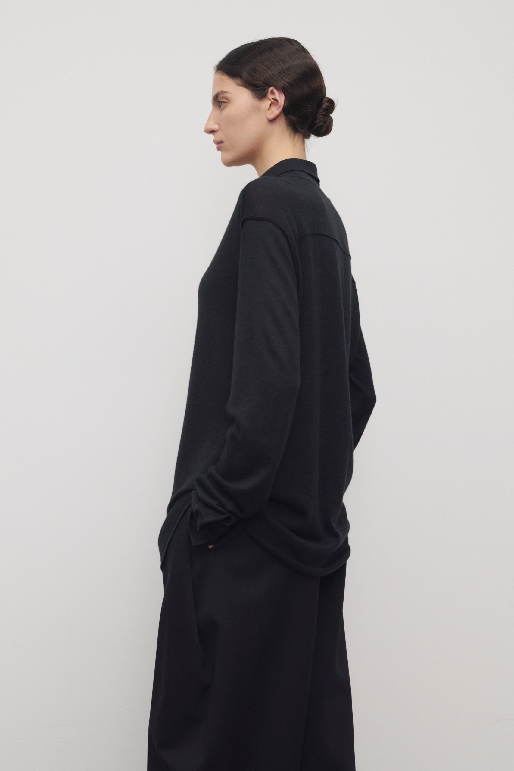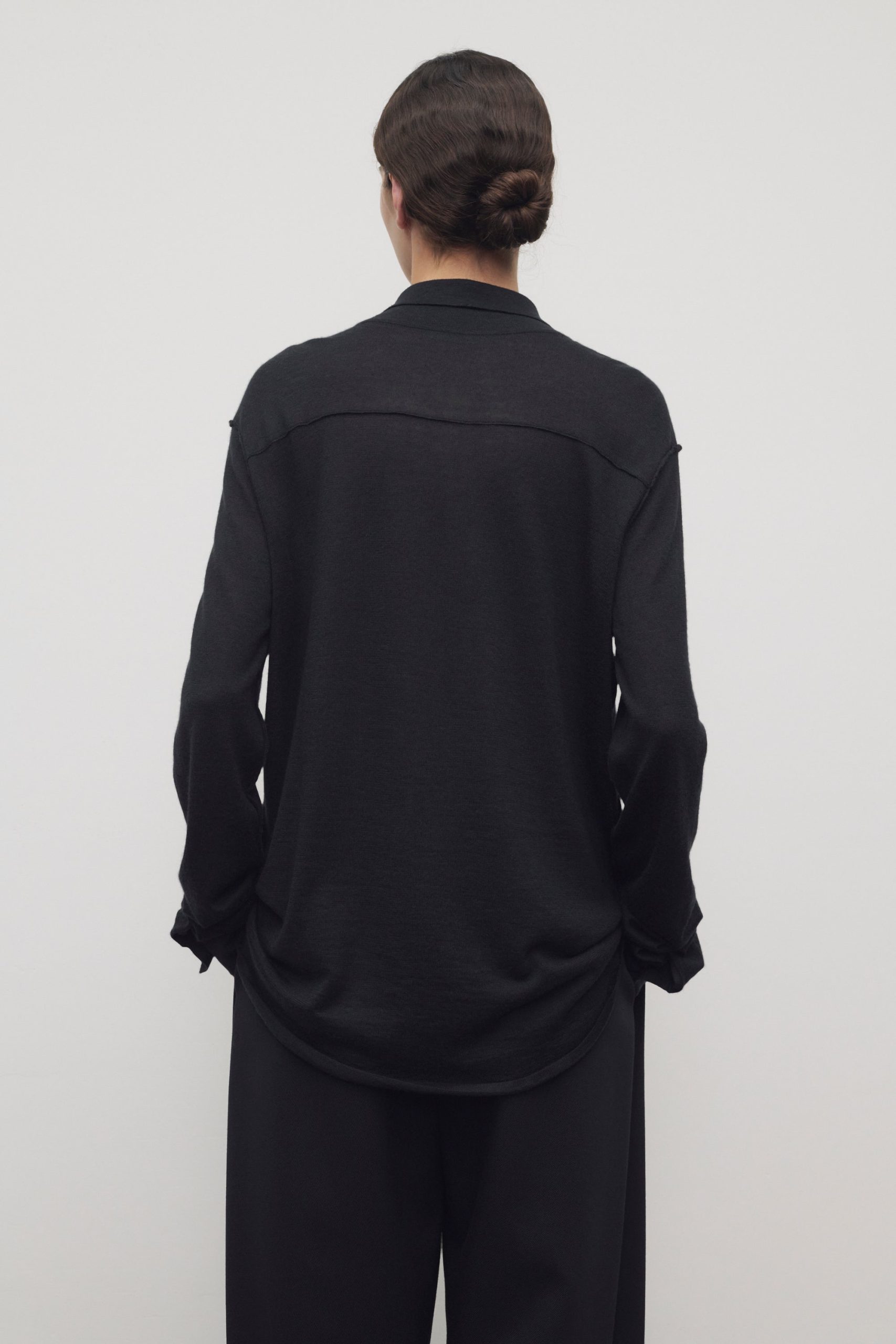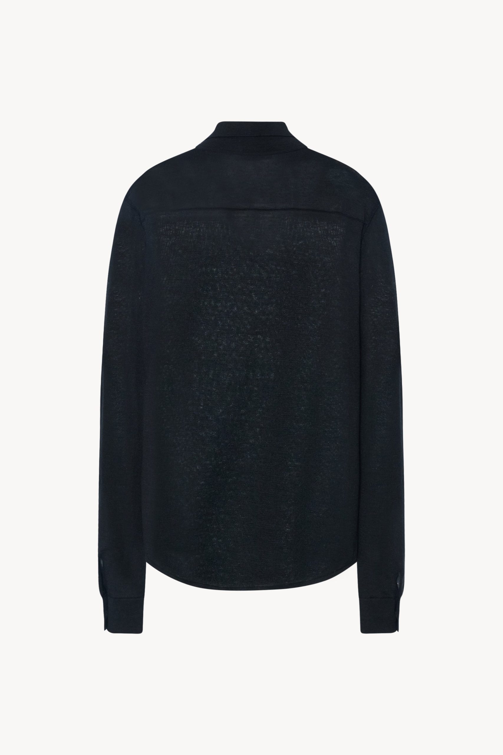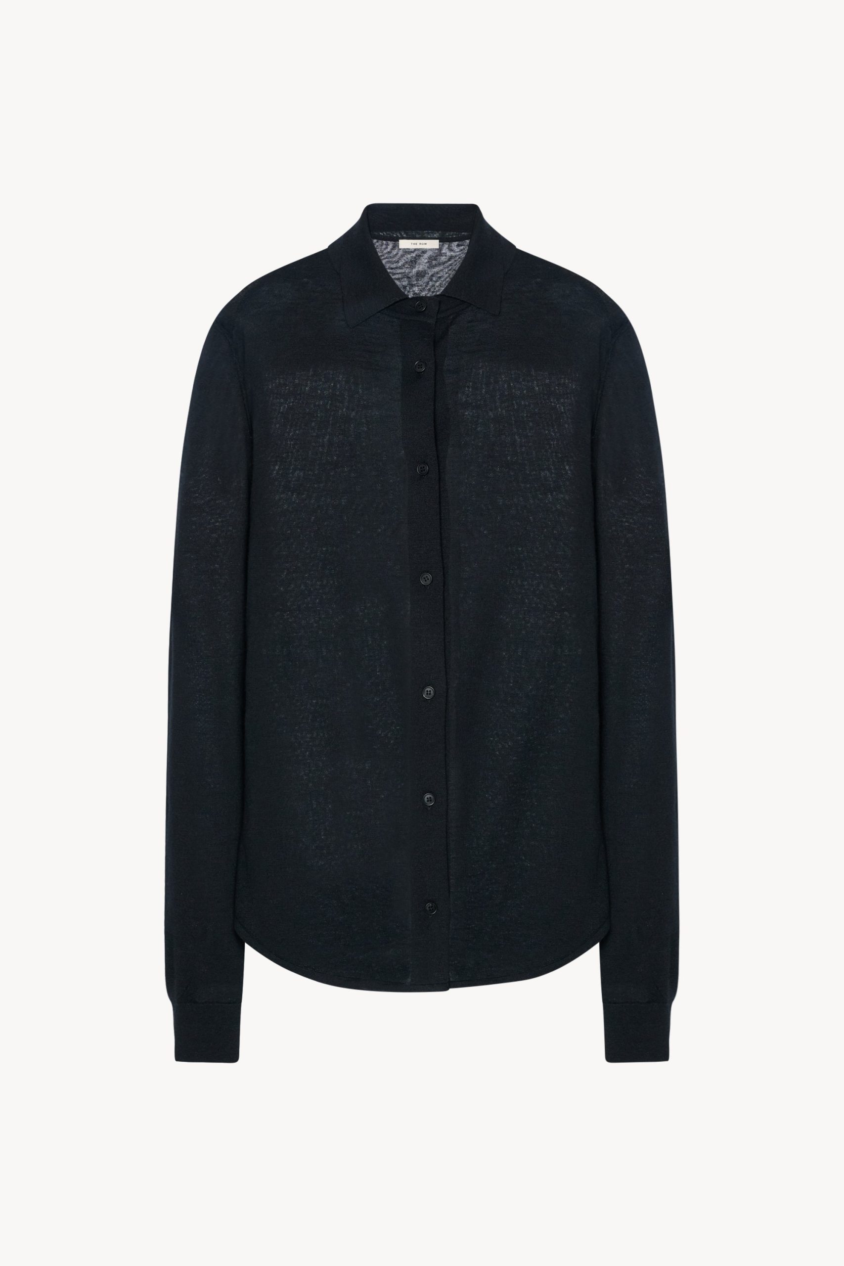 Long-sleeved button-up shirt in lightweight melange cashmere with boxy fit. curved hem. and exposed front placket with horn buttons. Crafted from cashmere. linen. and silk. the breathable knit offers a tactile hand and relaxed. elegant feel.