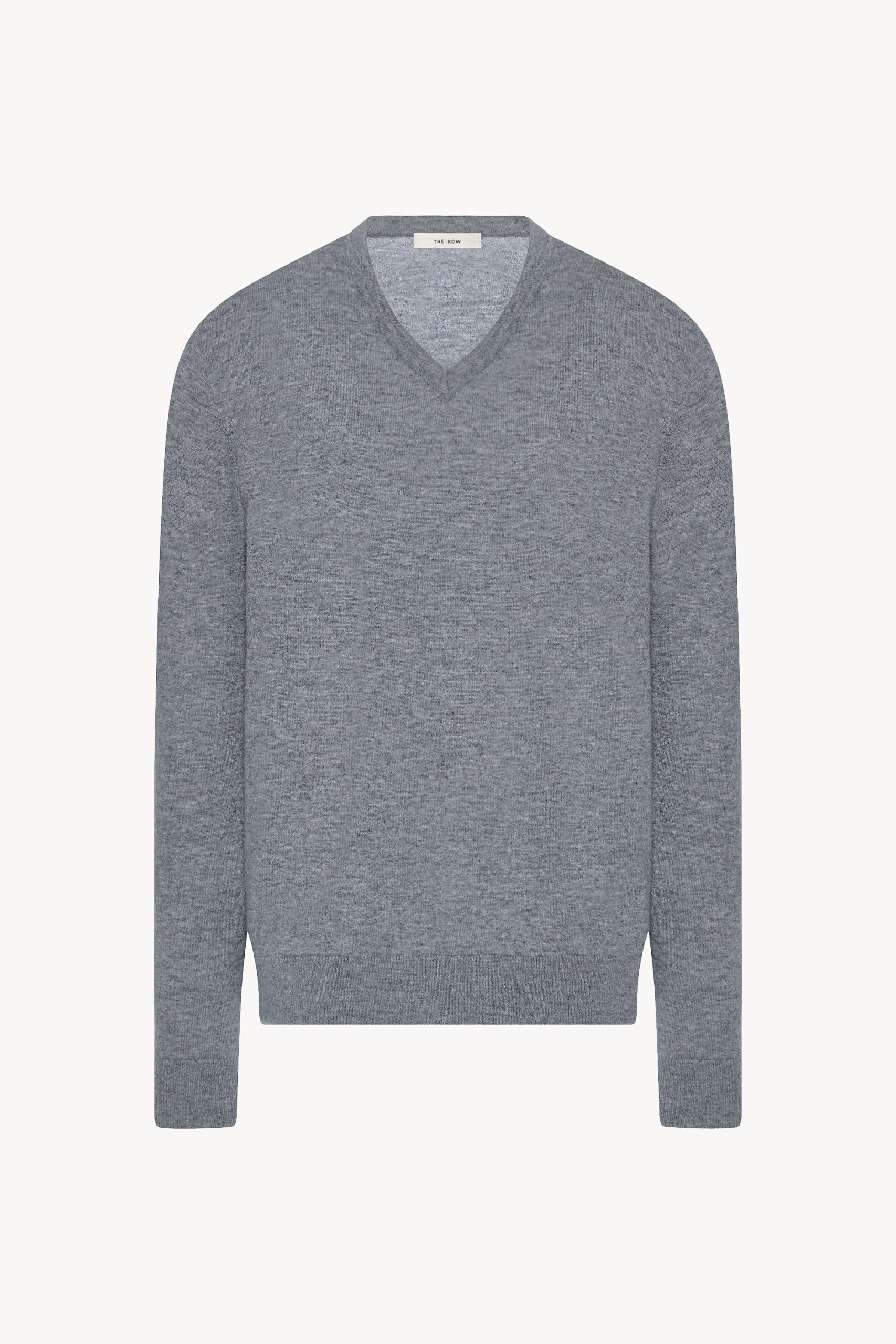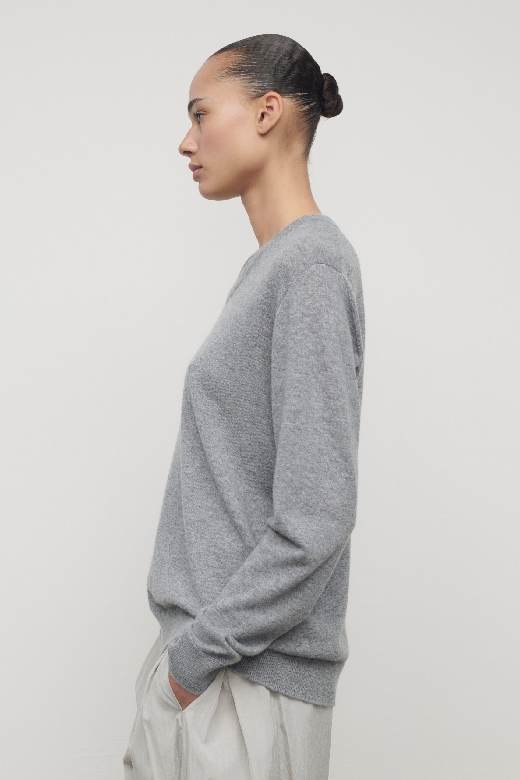 Long-sleeved v-neck sweater in fine Scottish cashmere with boxy fit. seamless construction. and ribbed neckline. cuffs. and hem. Specially washed to achieve a fresh. breathable finish. the ultralight knit offers natural warmth and seasonless appeal.