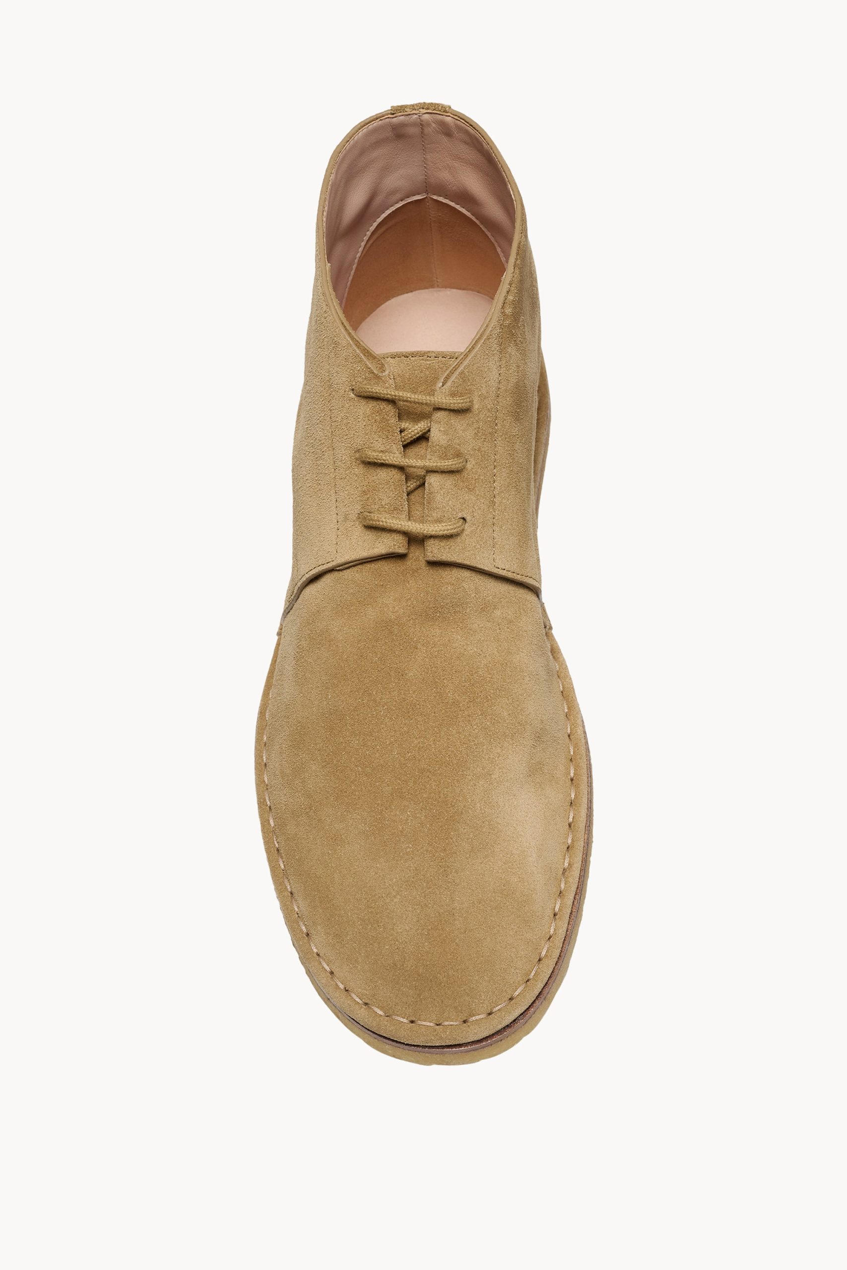 Versatile lace-up boot in soft calfskin suede with round toe. tonal laces. outer stitch detailing. and rubber crepe sole.