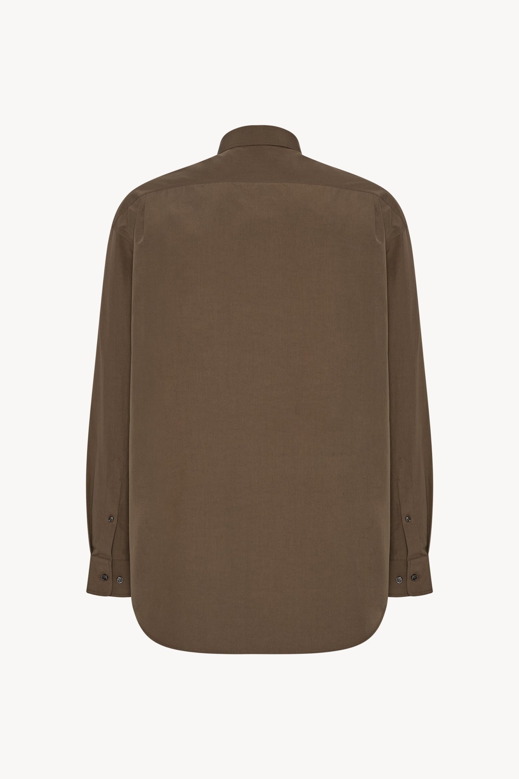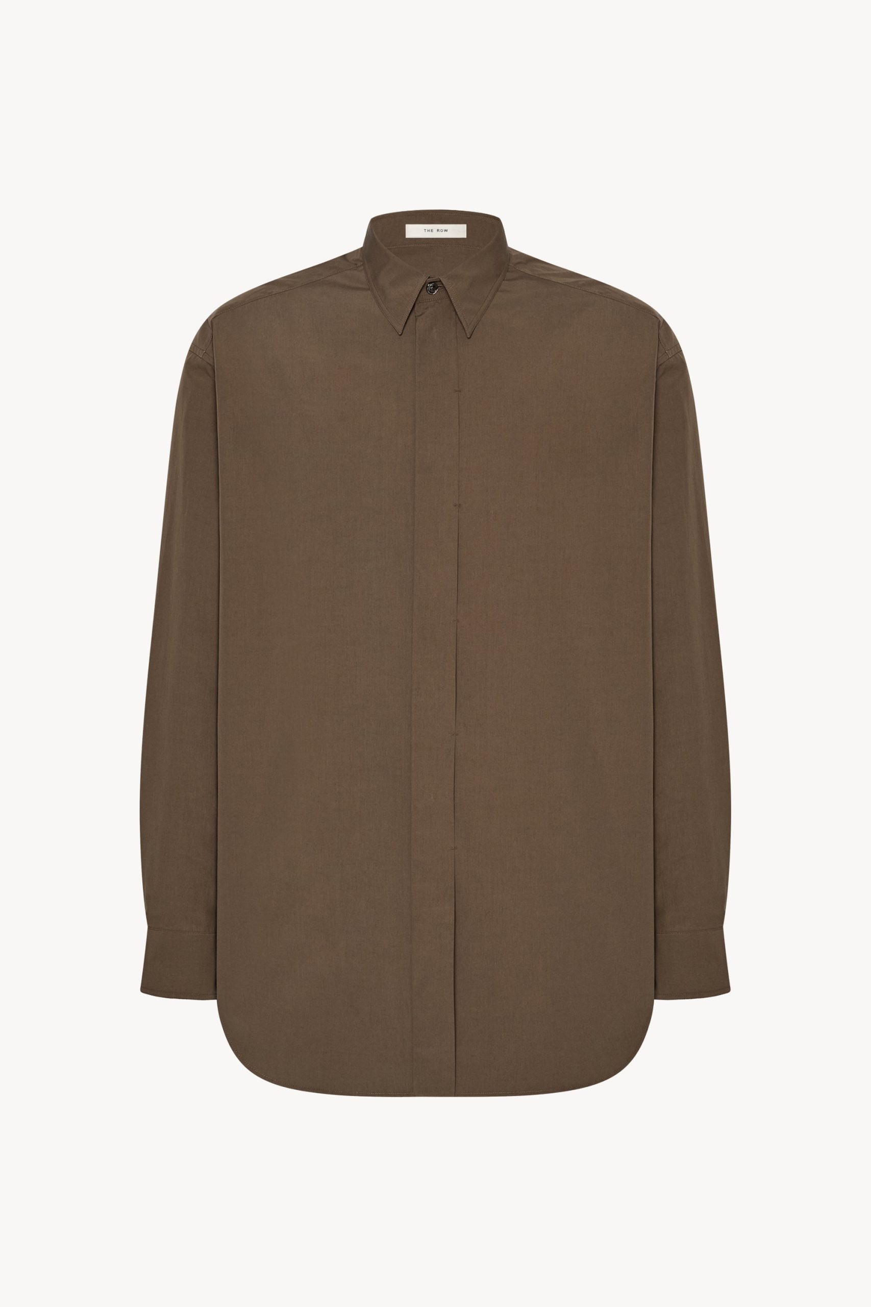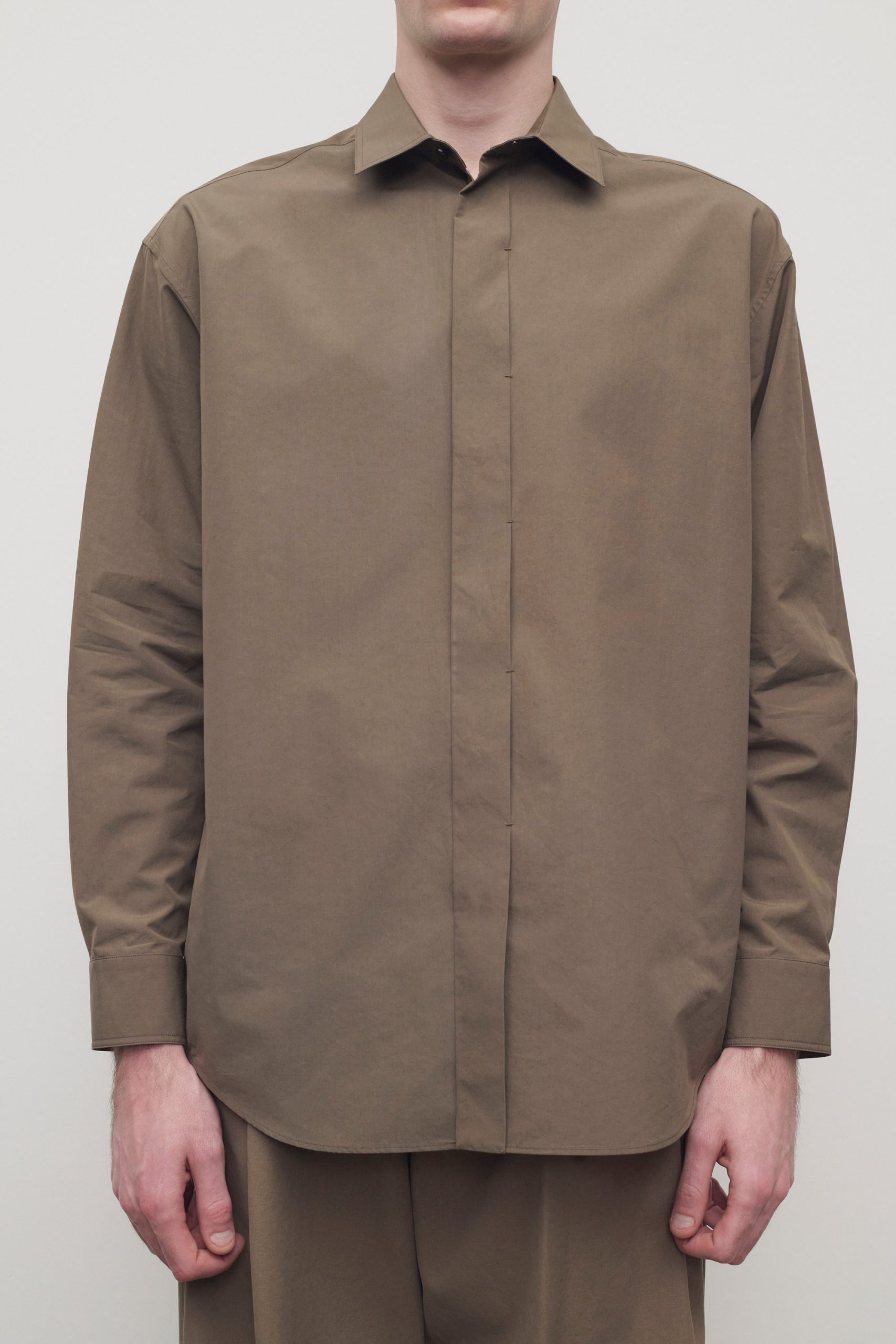 Refined button-up shirt in crisp cotton poplin with curved hem. slim back yoke with side pleats. and concealed front placket with mother-of-pearl buttons.