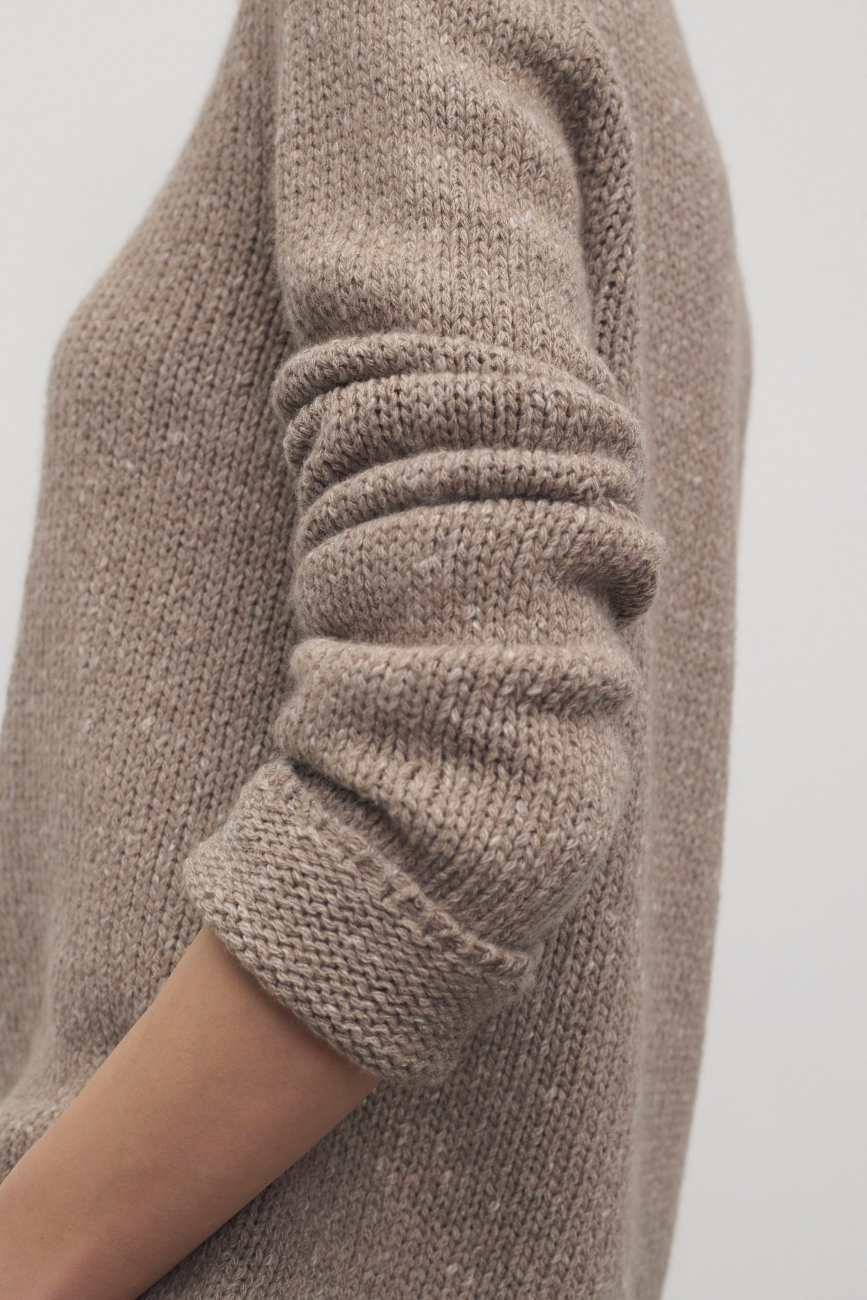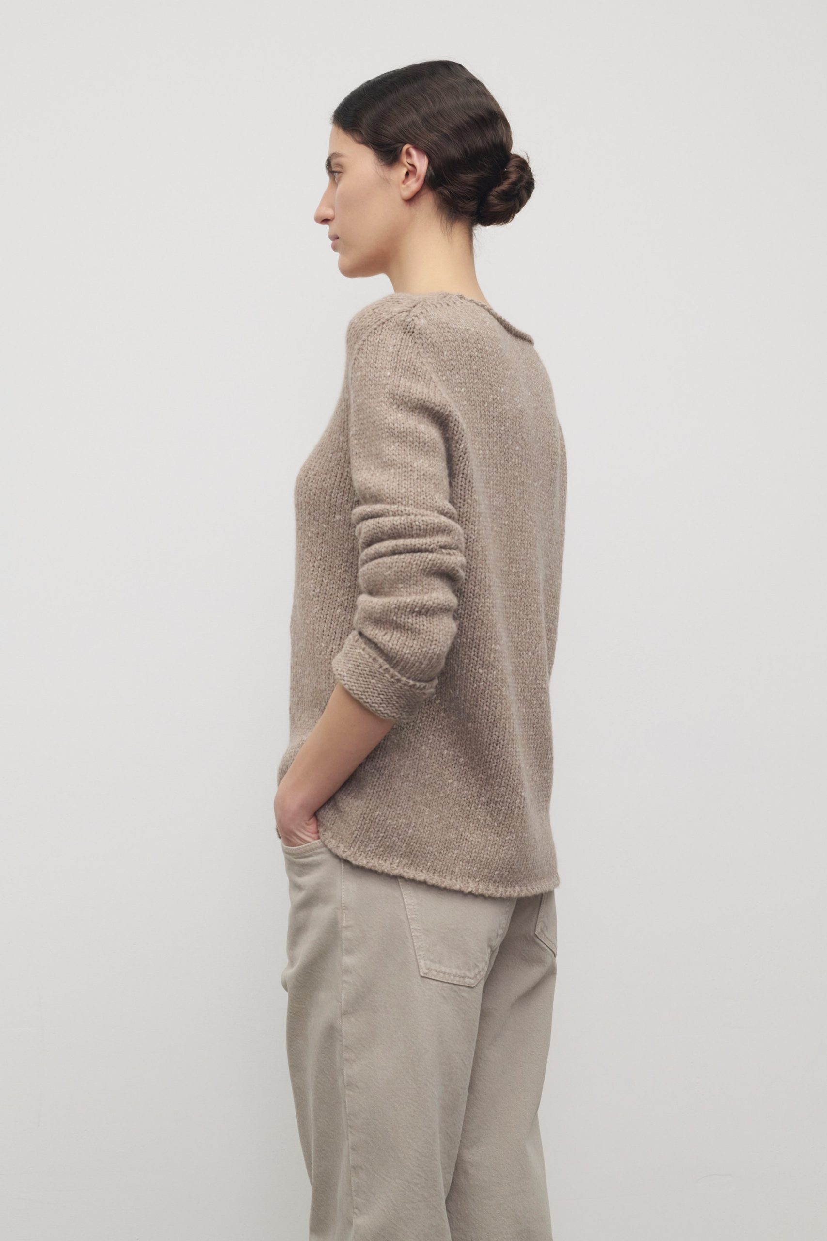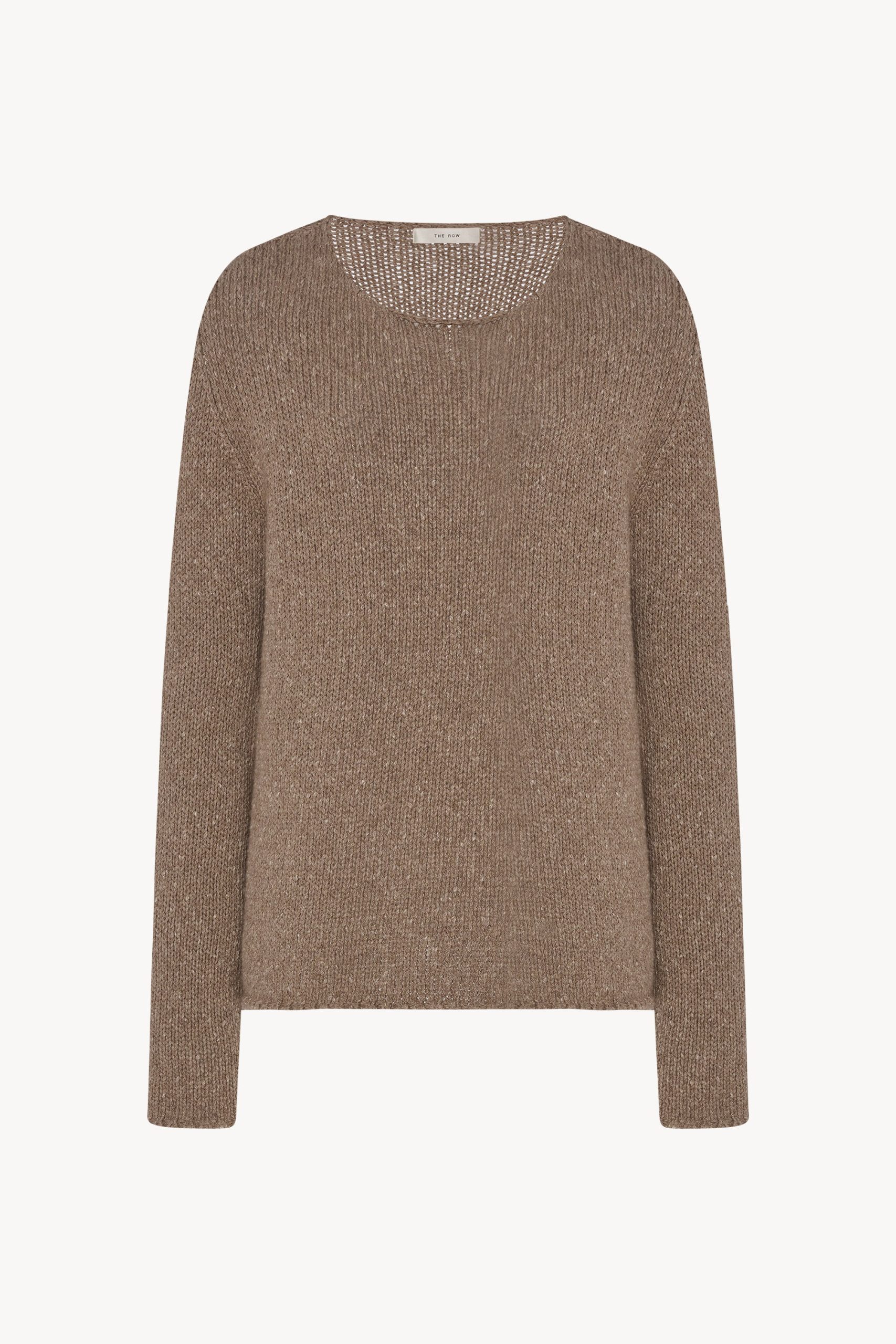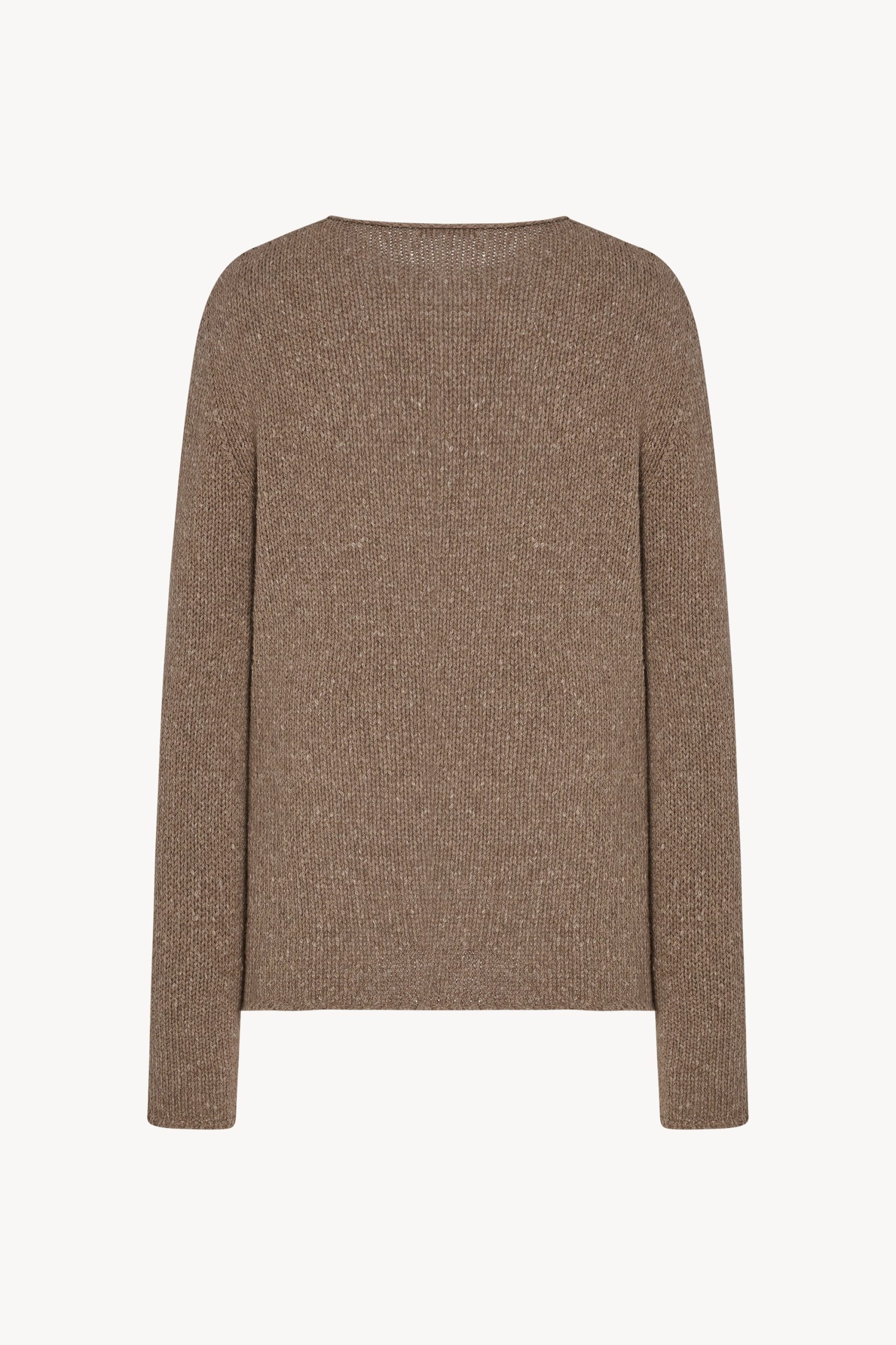 Relaxed long-sleeved sweater in speckled midweight cashmere with regular fit. wide crewneck. and clean edge finish. Crafted from twisted cashmere yarns. the breathable knit offers a tactile hand and modern feel.