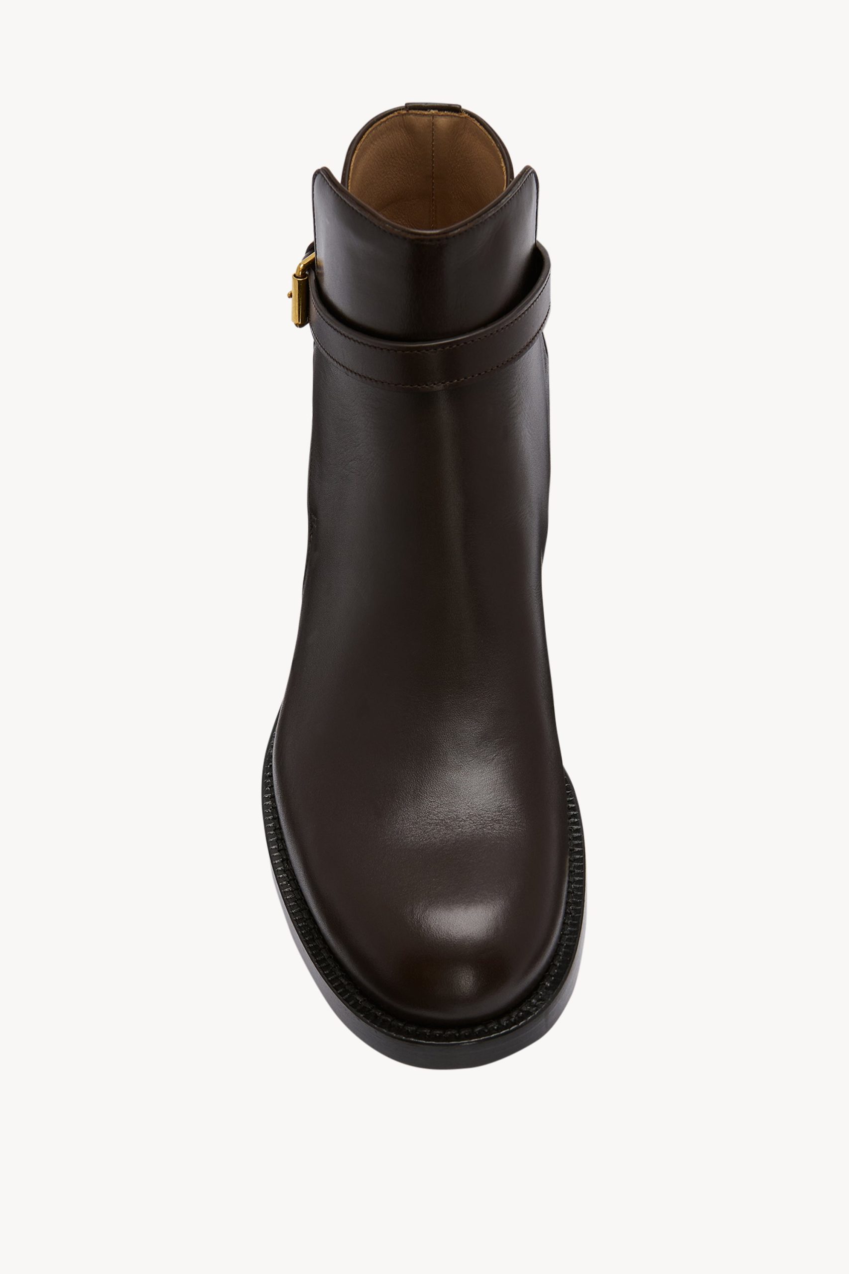Streamlined ankle boot in polished calfskin leather with oval toe. ankle strap with metal buckle. and stacked leather heel.