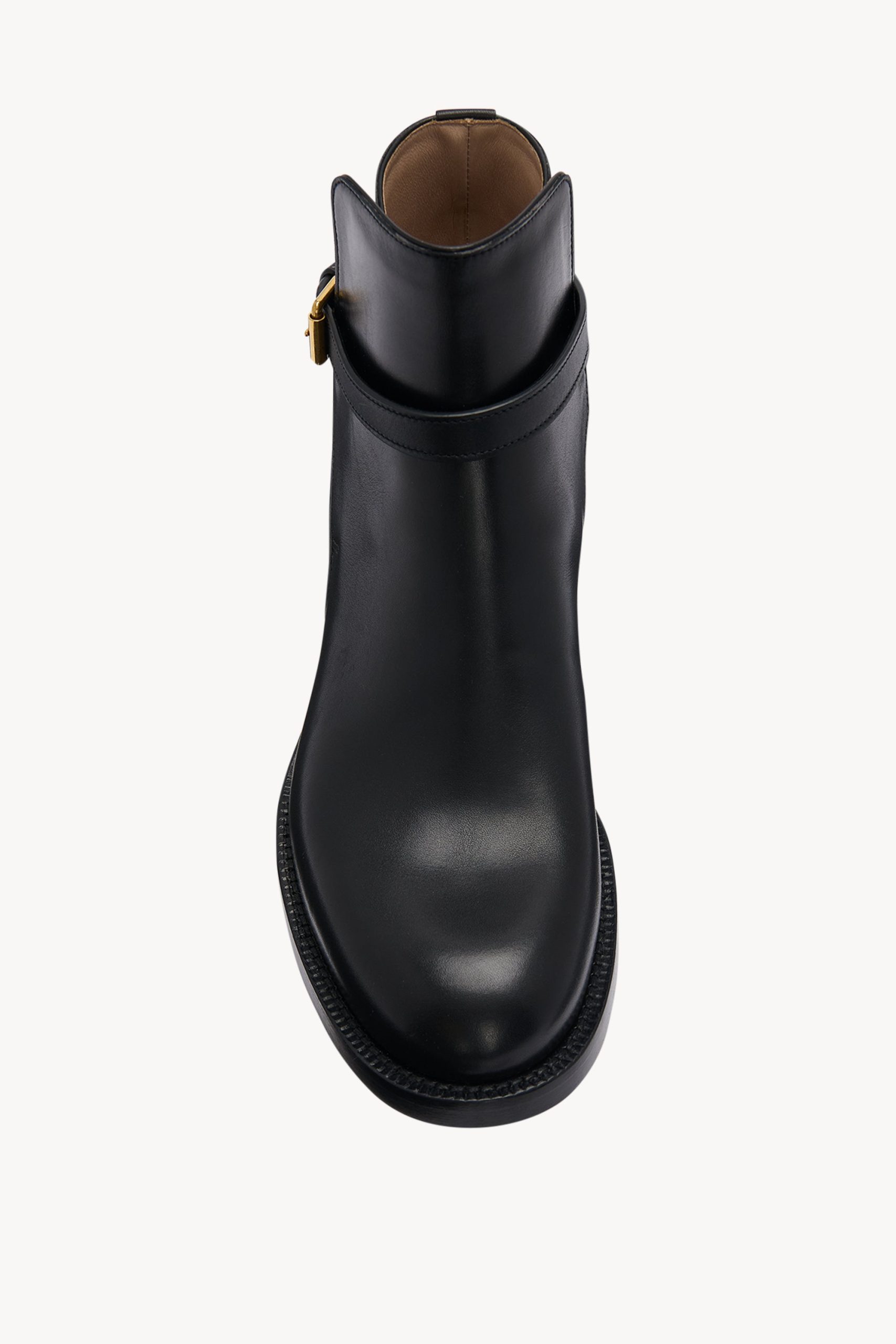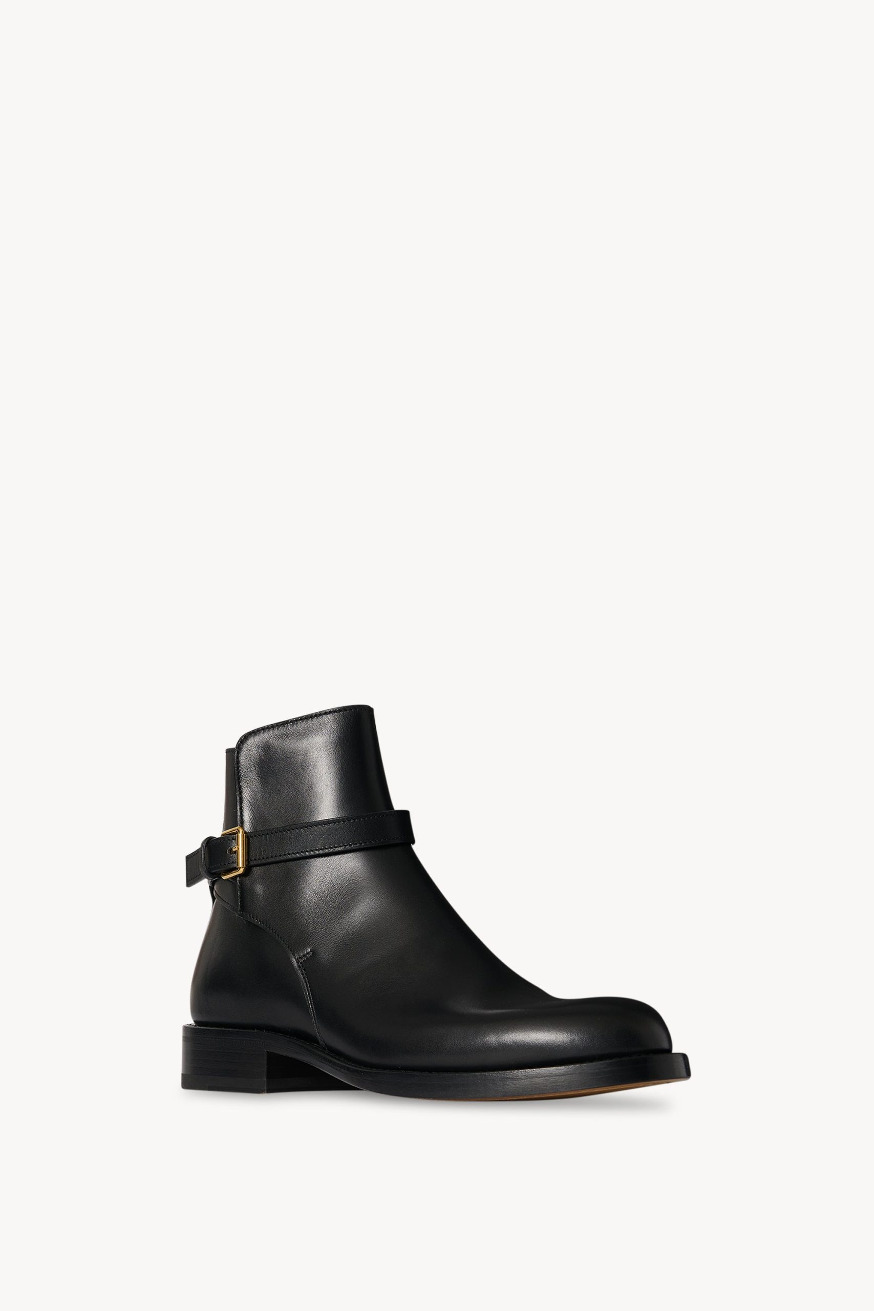 Streamlined ankle boot in polished calfskin leather with oval toe. ankle strap with metal buckle. and stacked leather heel.
