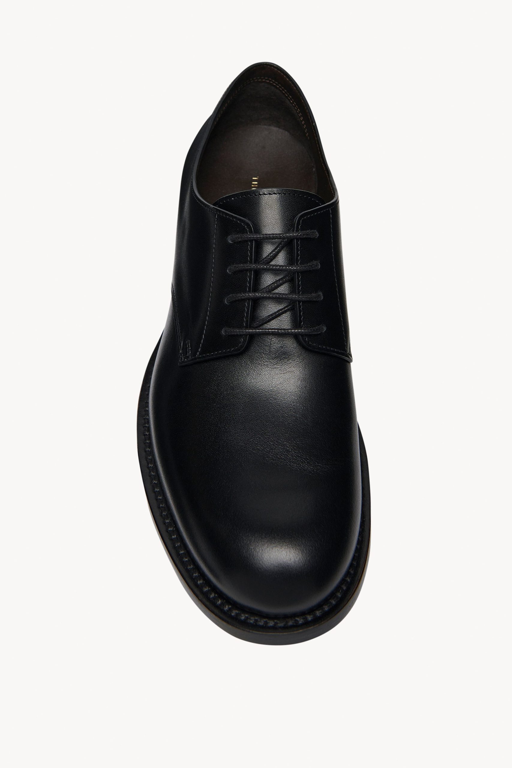 Classic lace-up oxford in polished calfskin leather with seamless molded construction. almond toe. and hand-stitched detailing.