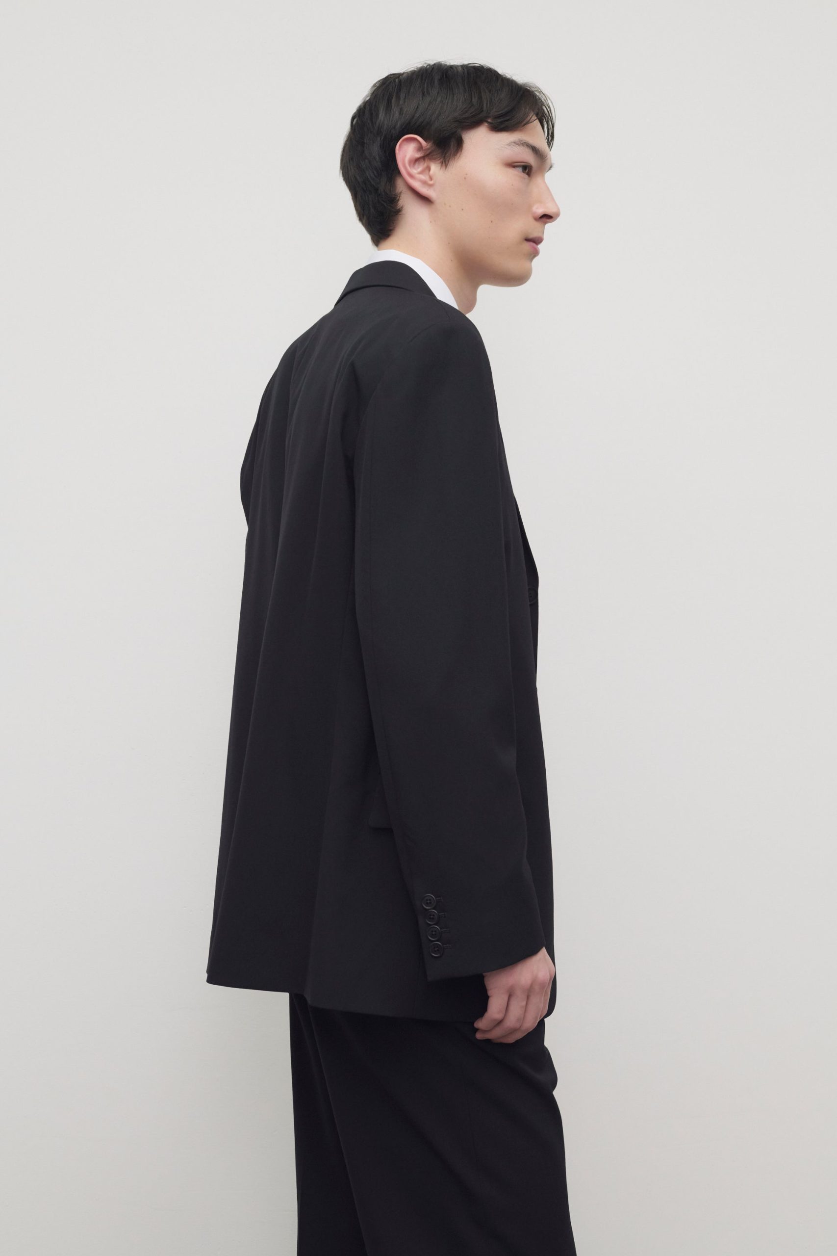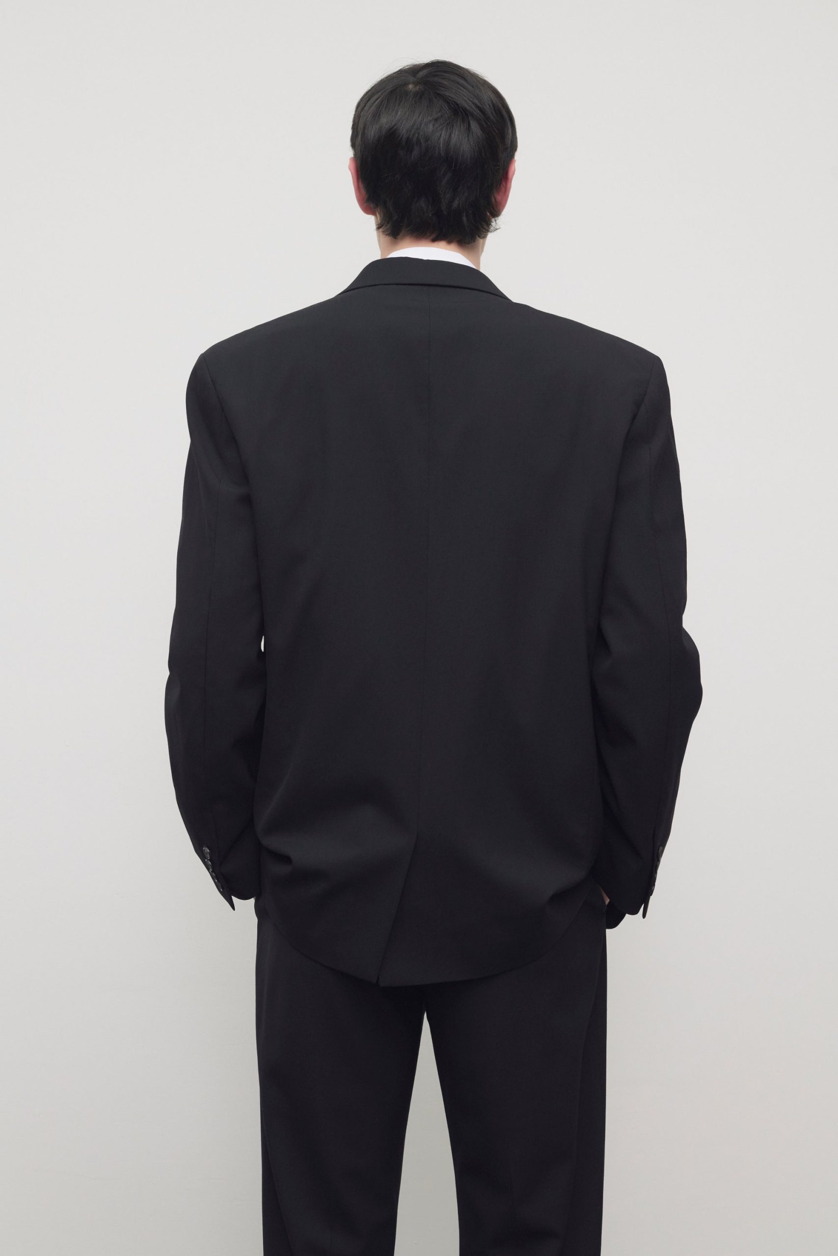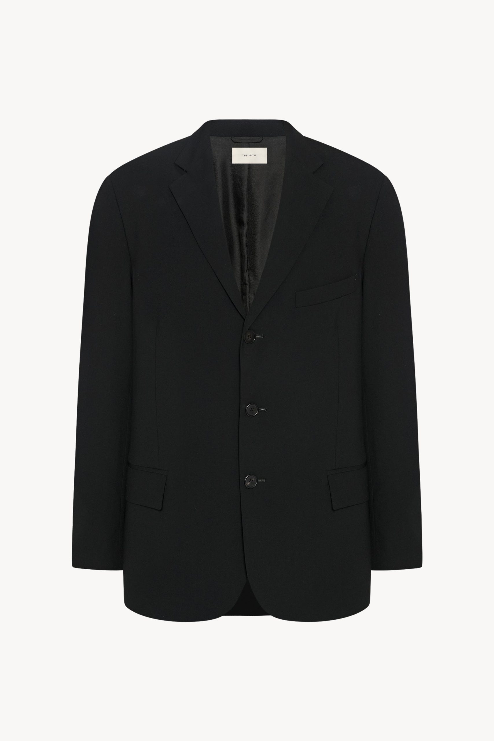 Single-breasted tailored jacket in fluid lightweight wool with notch lapel. softly padded shoulders. front flap pockets. and front button closure.