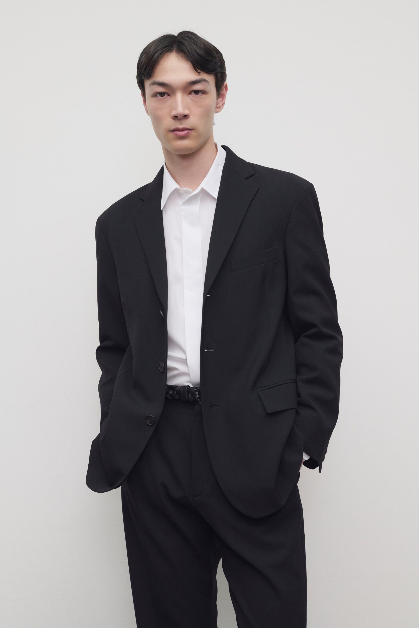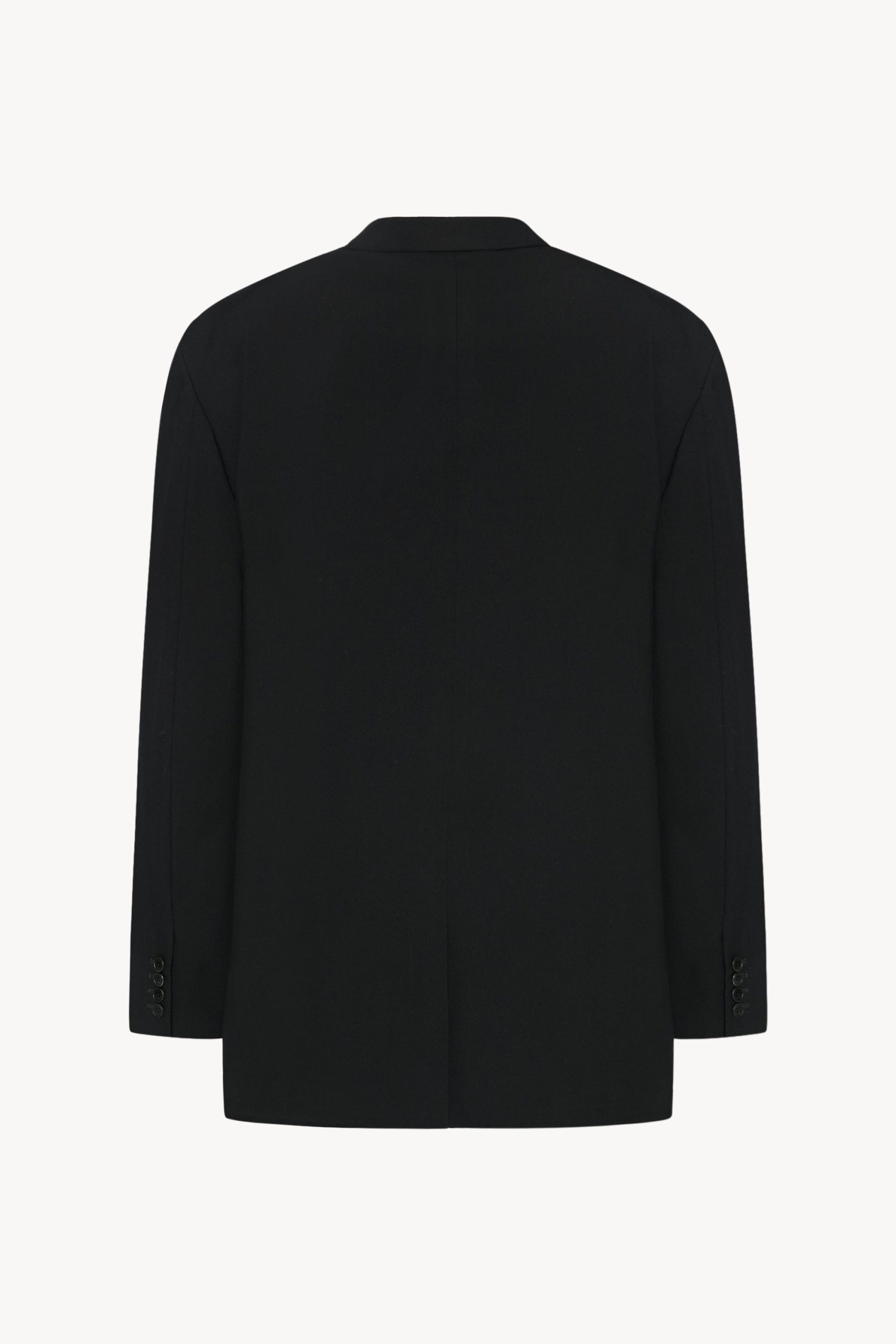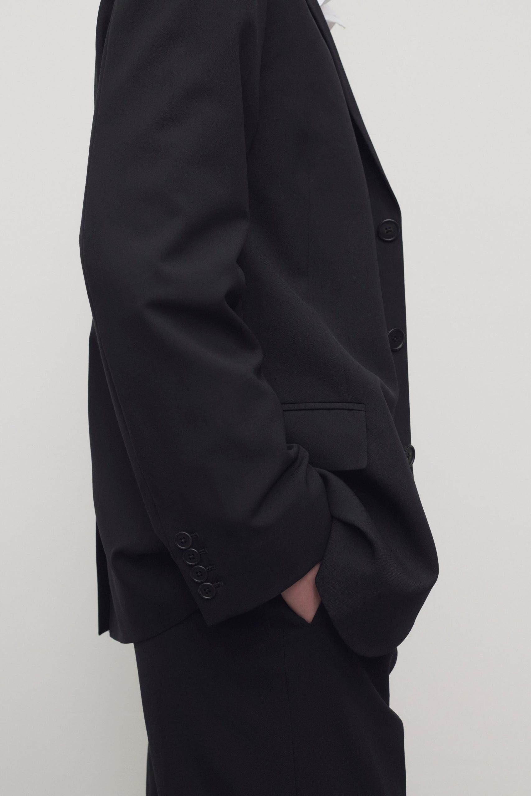 Single-breasted tailored jacket in fluid lightweight wool with notch lapel. softly padded shoulders. front flap pockets. and front button closure.