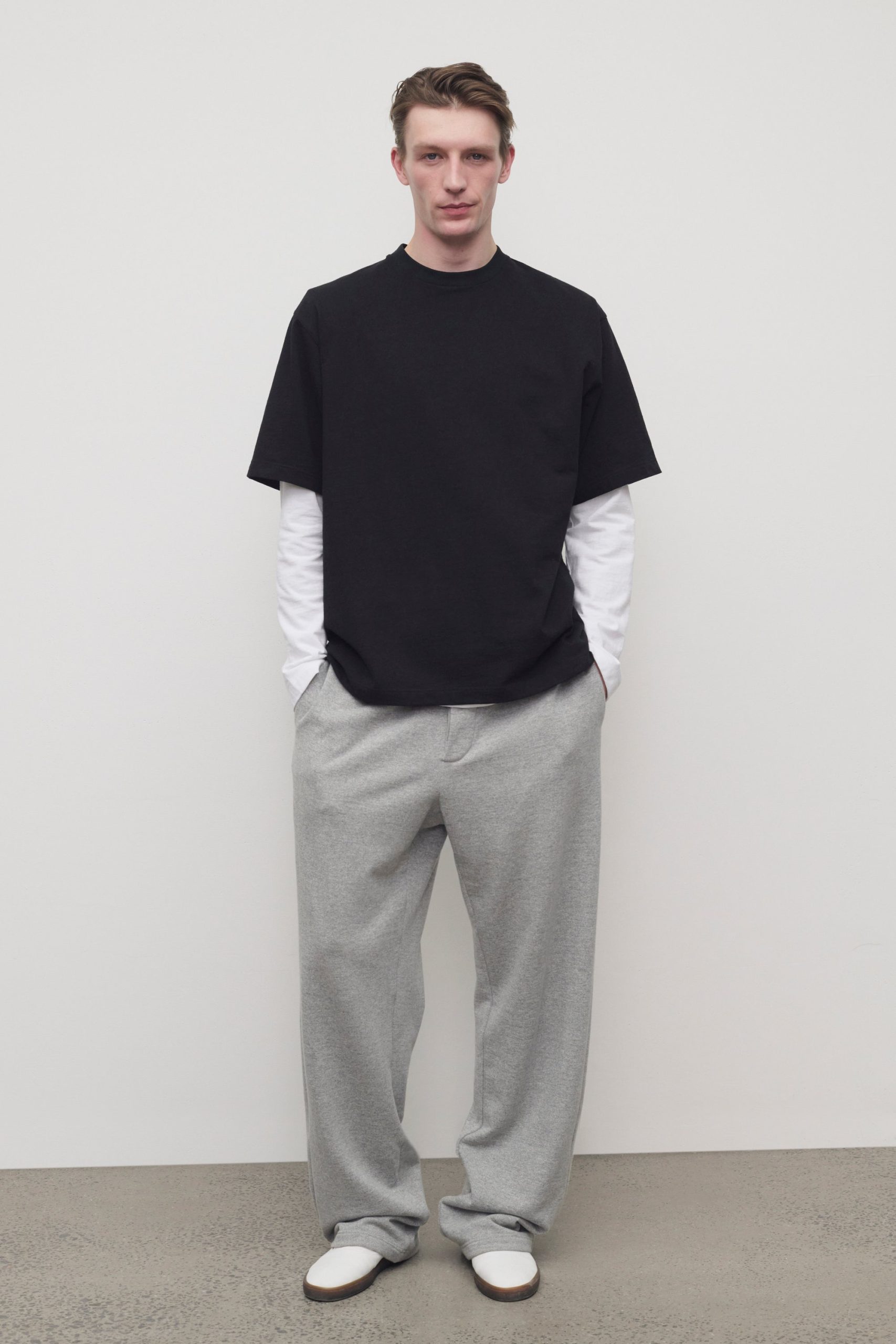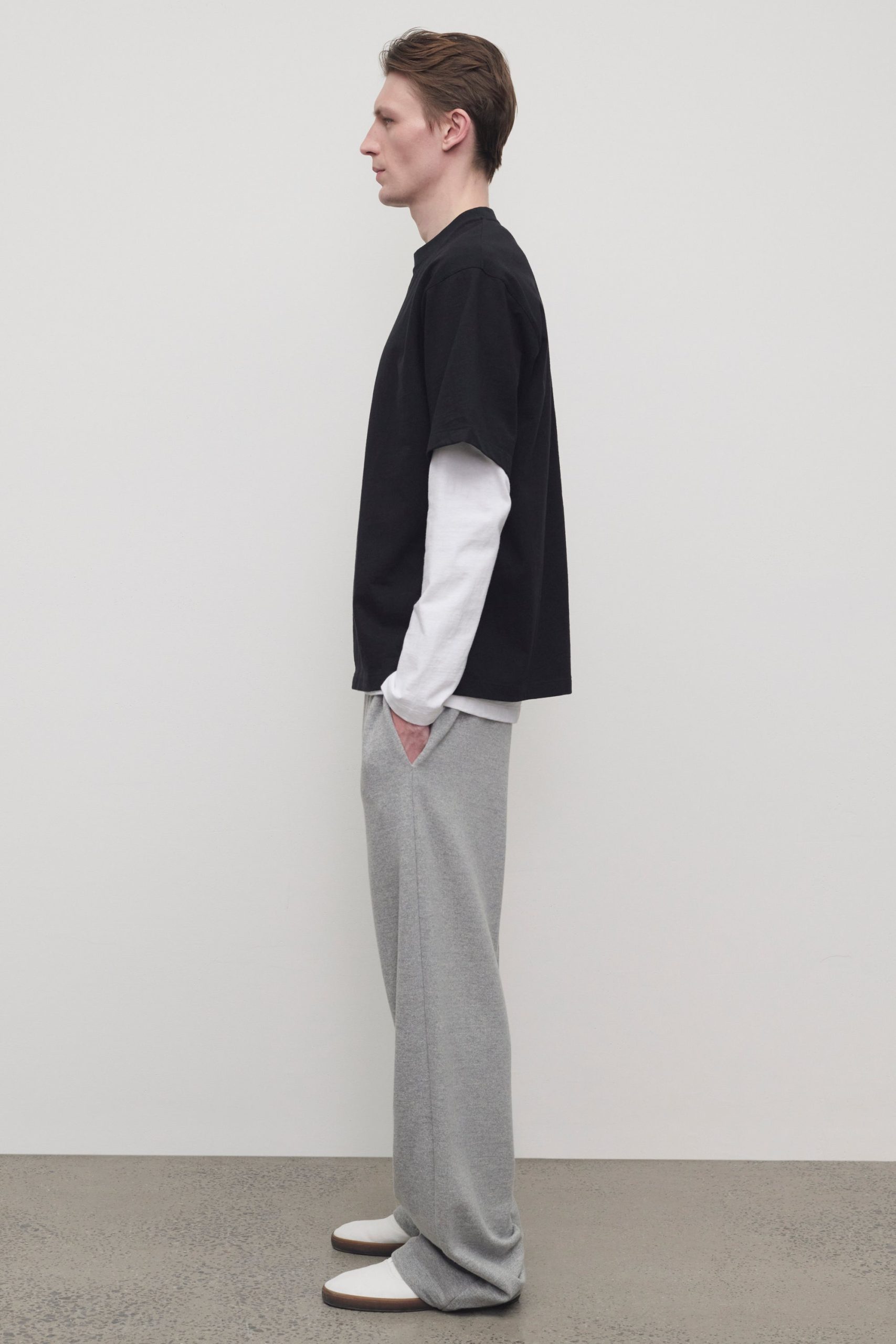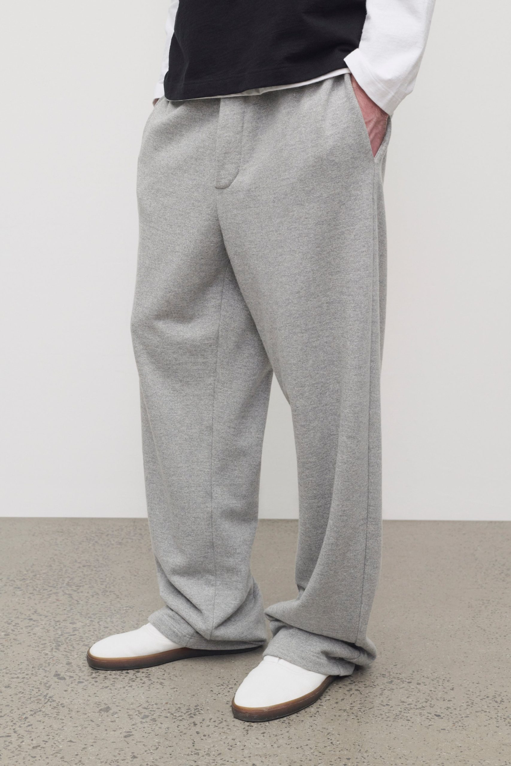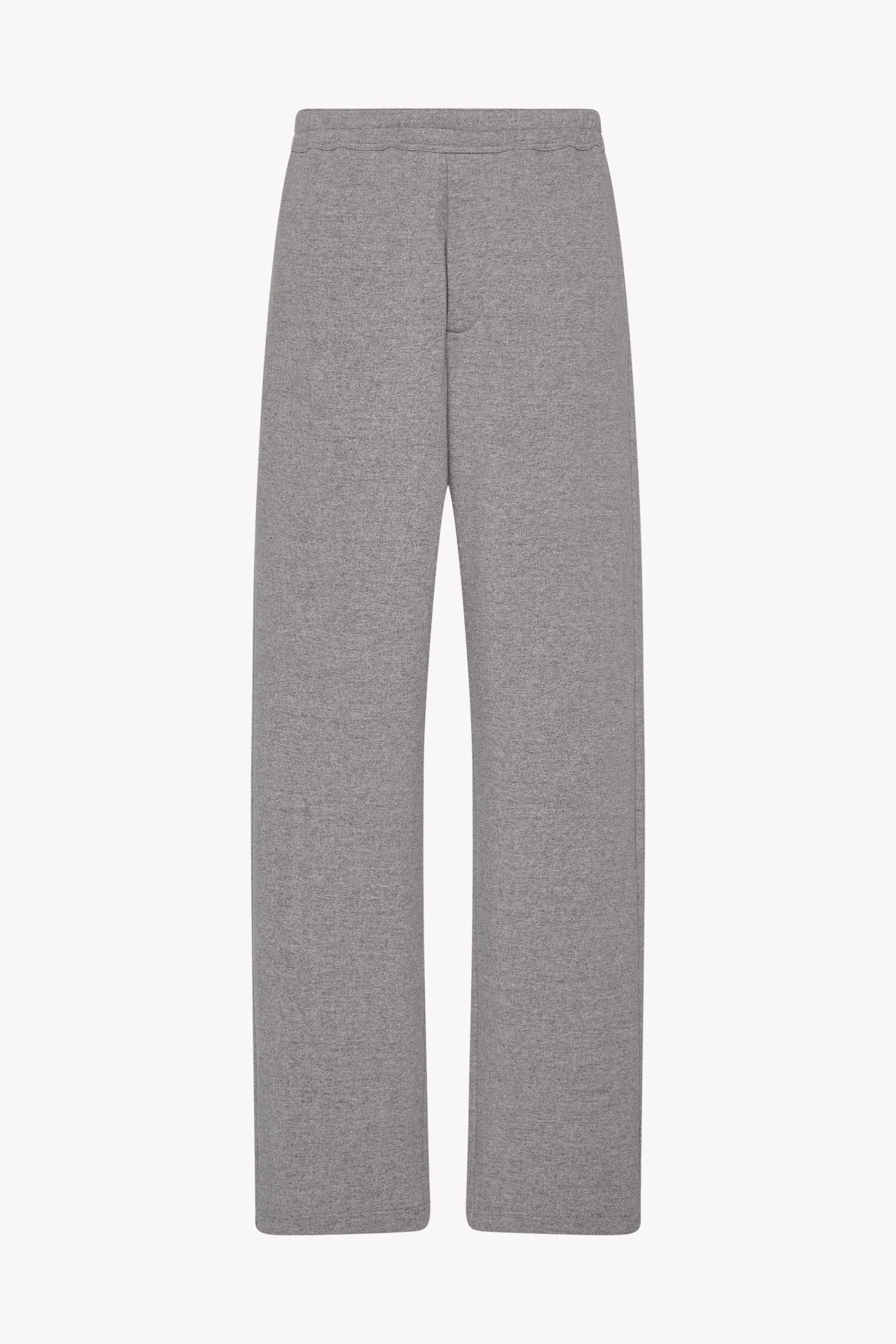 Casual pull-on pant in cashmere and cotton French terry with straight leg. side seam pockets. and topstitched waist with adjustable drawstring.